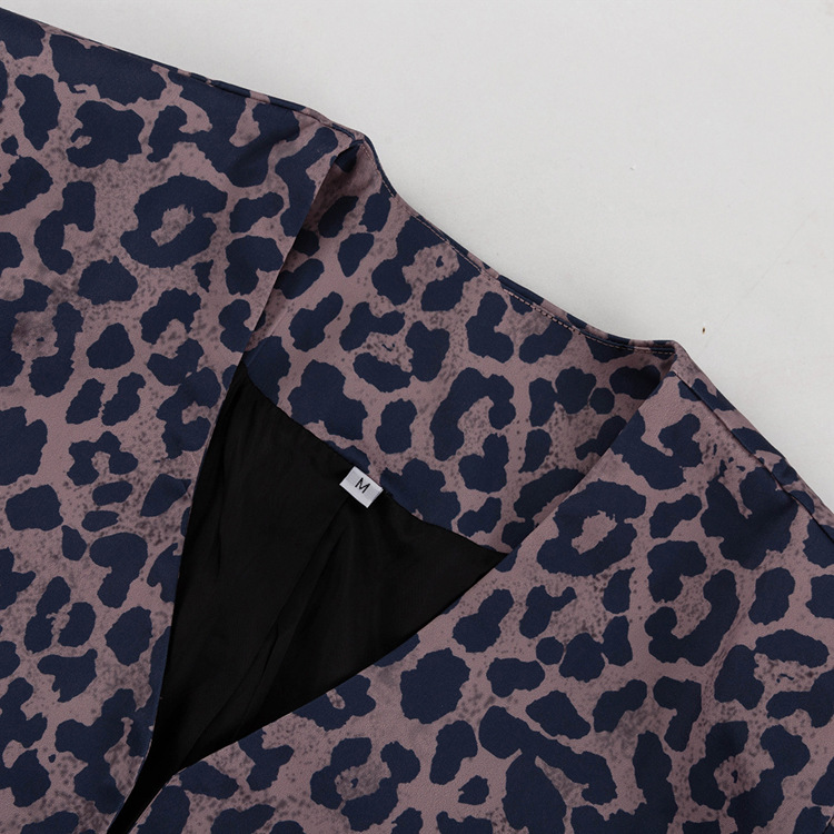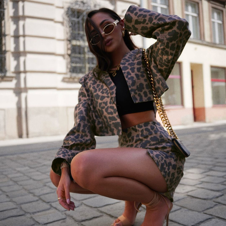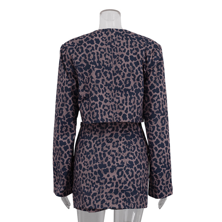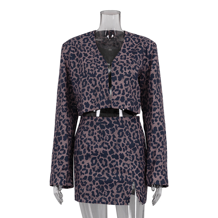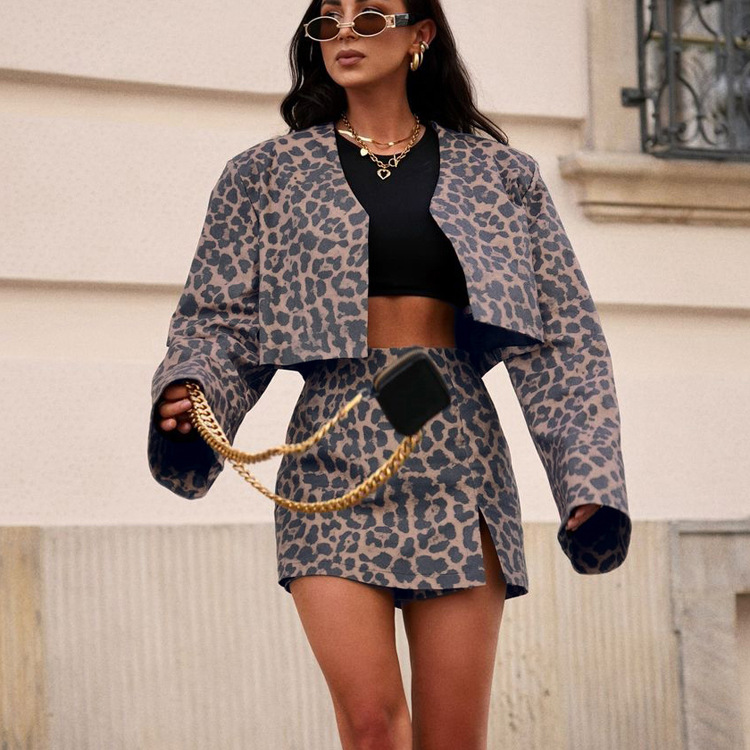 BKQU 2 Pieces Fashion Leopard Print Skirts Sets Women Long Sleeve Crop Jacket And High Waist Side Slit Mini Skirts Outfits 2025