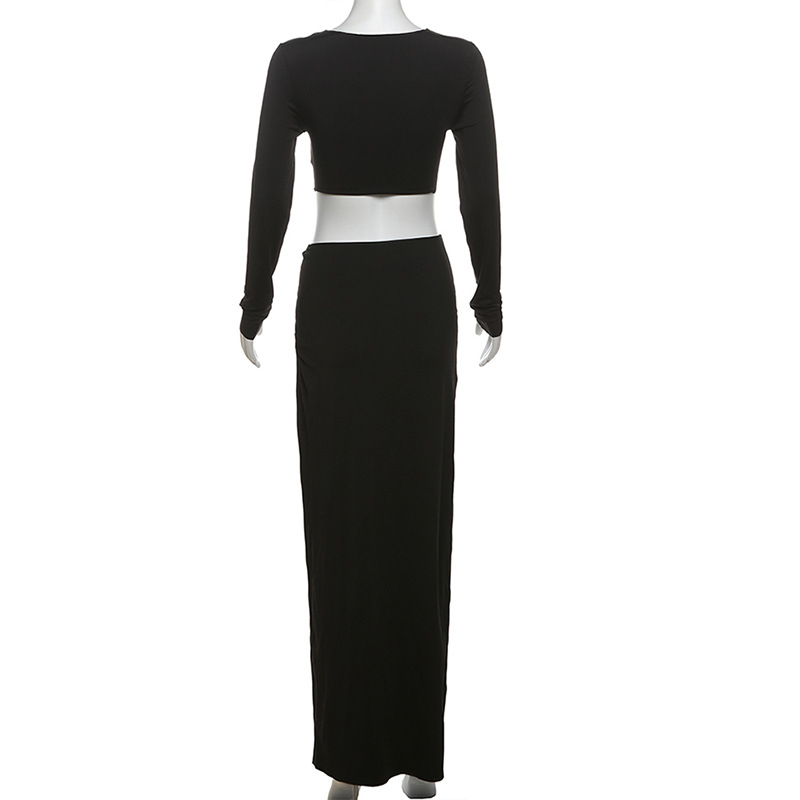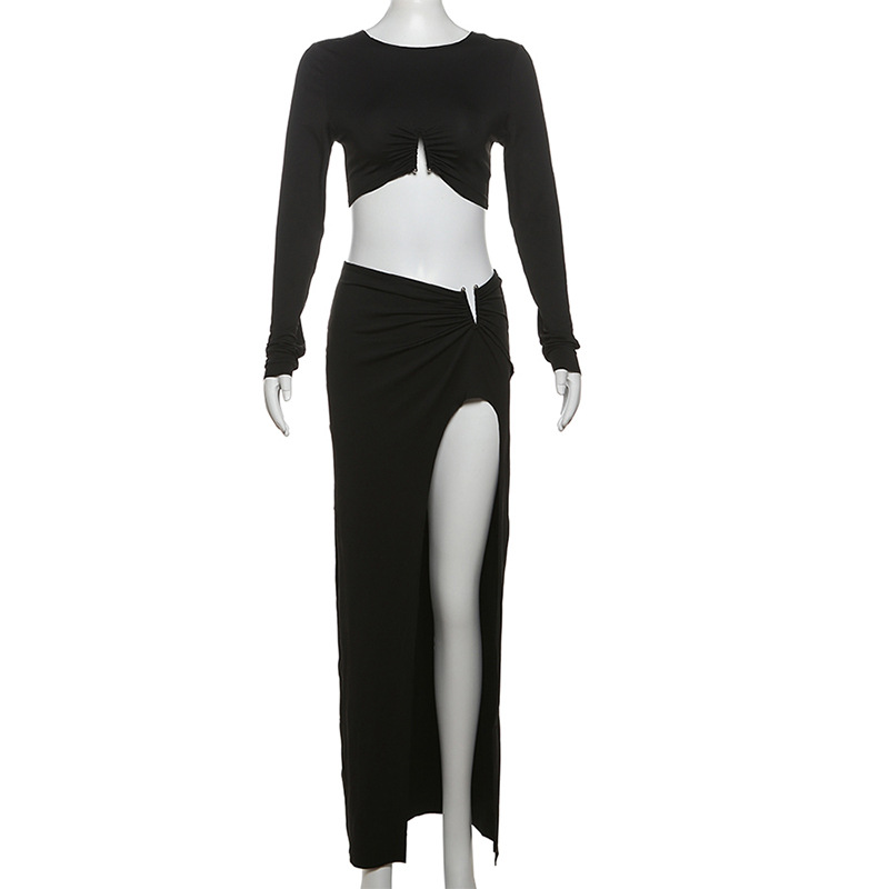 BKQU 2 Pieces Women Skirt Sets Long Sleeve Slim Fit Crop Top High Split Long Skirt Matching Elegant Club Party Sexy Outfits 2025