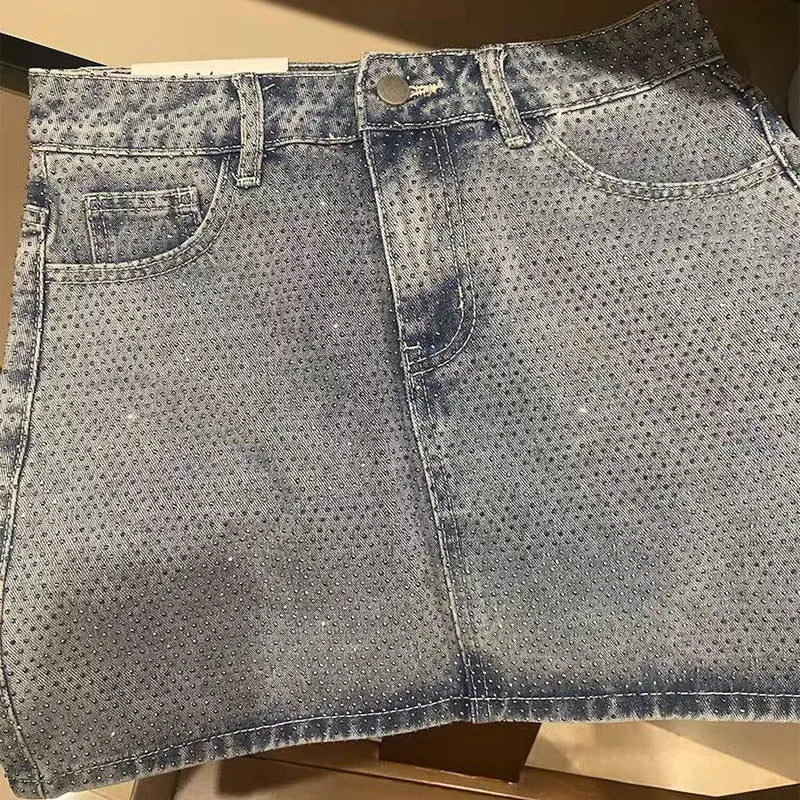 BKQU 2025 New Rhinestone Denim Mini Skirts Women Fashion Party Club Diamonds High Waist Jean Skirt Y2K Aesthetic Korean Bottoms