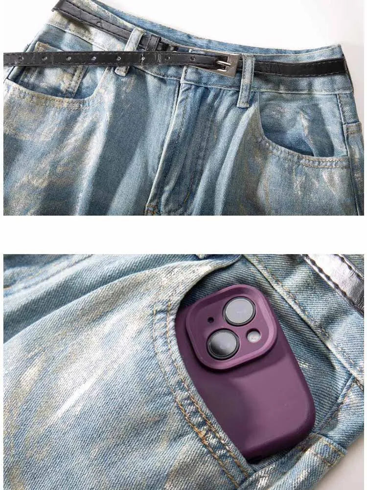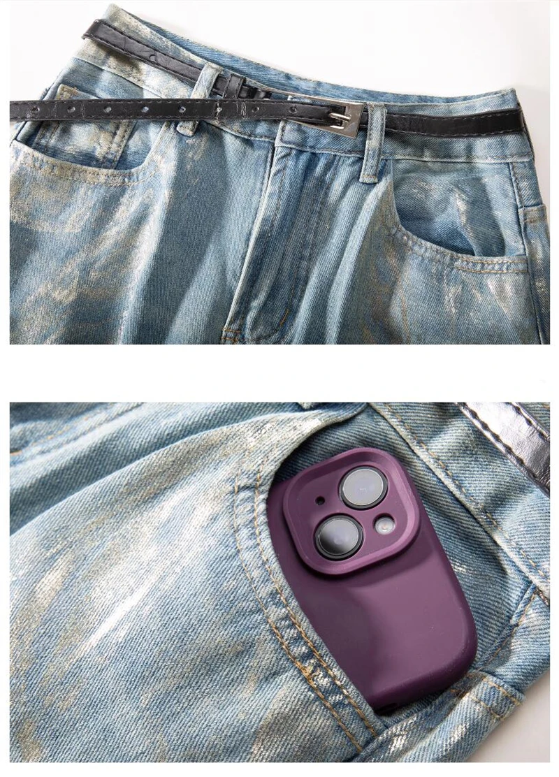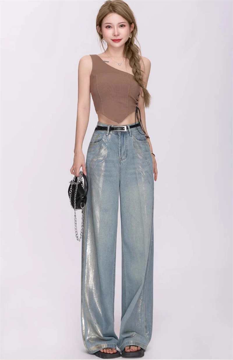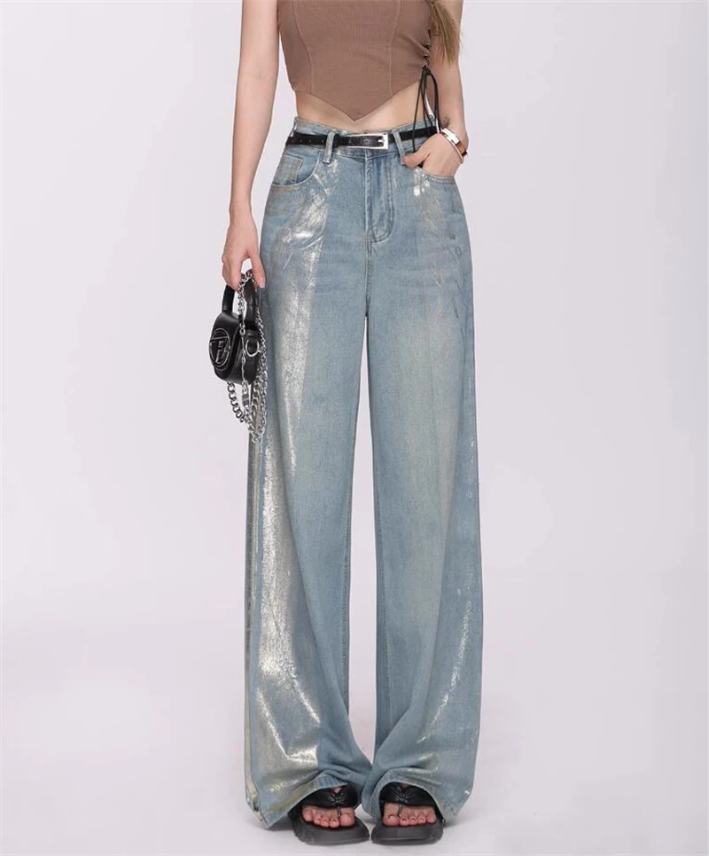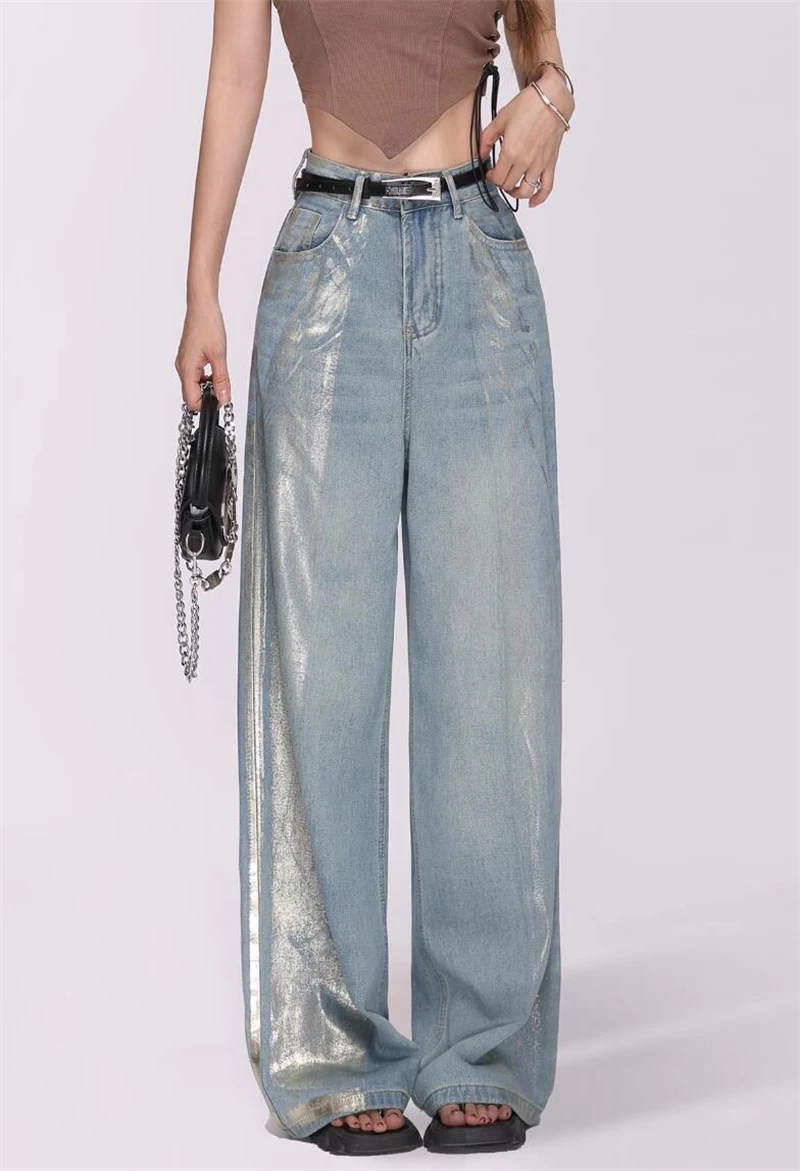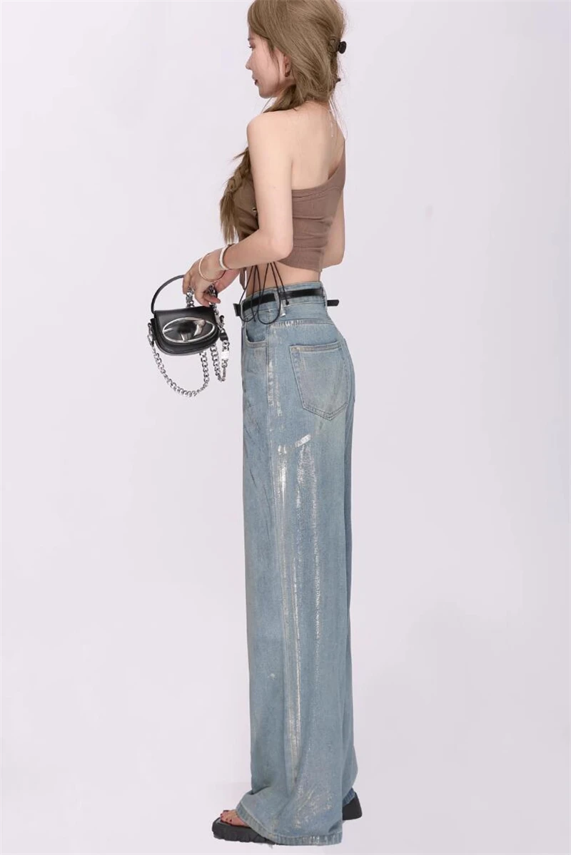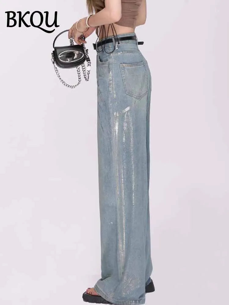 BKQU Aesthetic Metallic Jeans Women Baggy Wide Leg Pants Y2K High Waist Elegant Streetwear Denim Casual Straight Trousers 2025