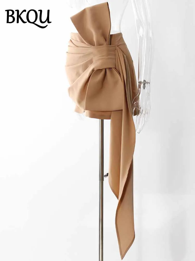 BKQU Asymmetric Pleated Bow Elegant Mini Skirt Women 2025 Spring Summer Fashion High Waist Slim Wrap Hip Short Skirt Party Wear