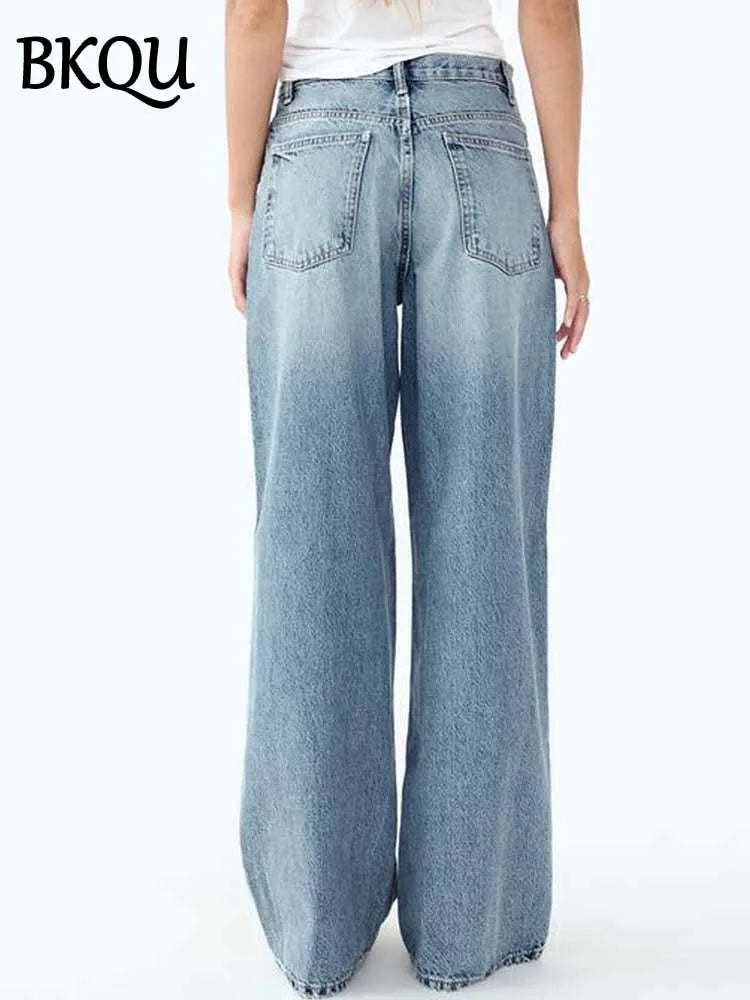 BKQU Asymmetrical Wide Leg Jeans Women Vintage High Waist Washed Straight Denim Trousers Loose Streetwear Chic Irregular Jeans