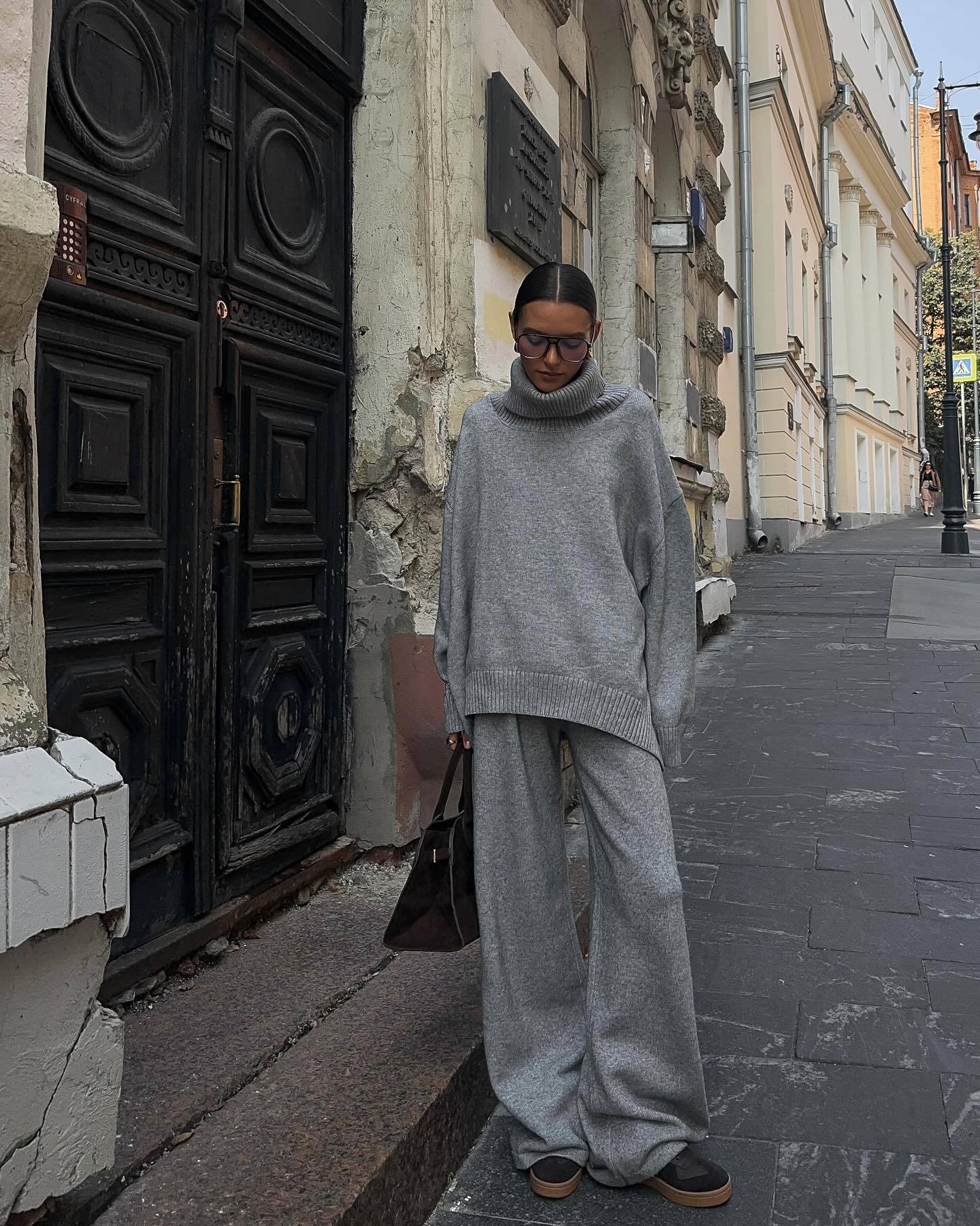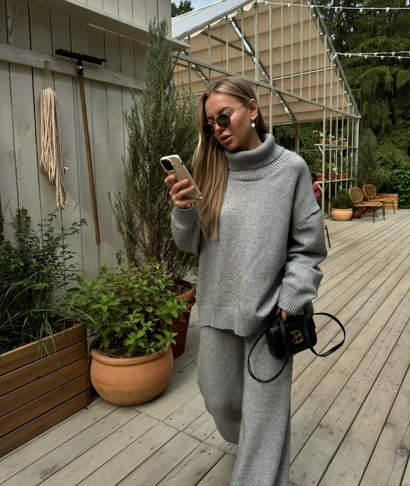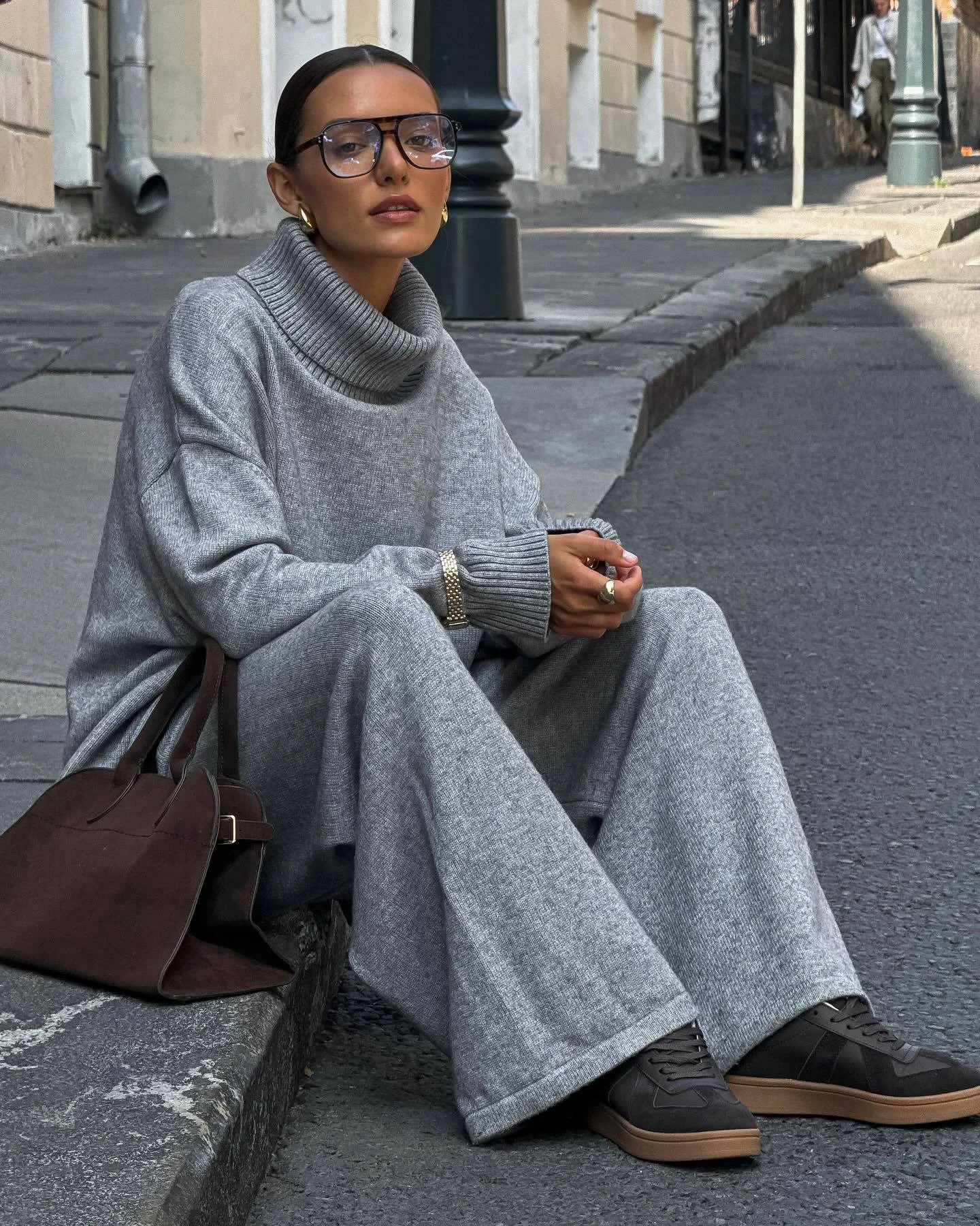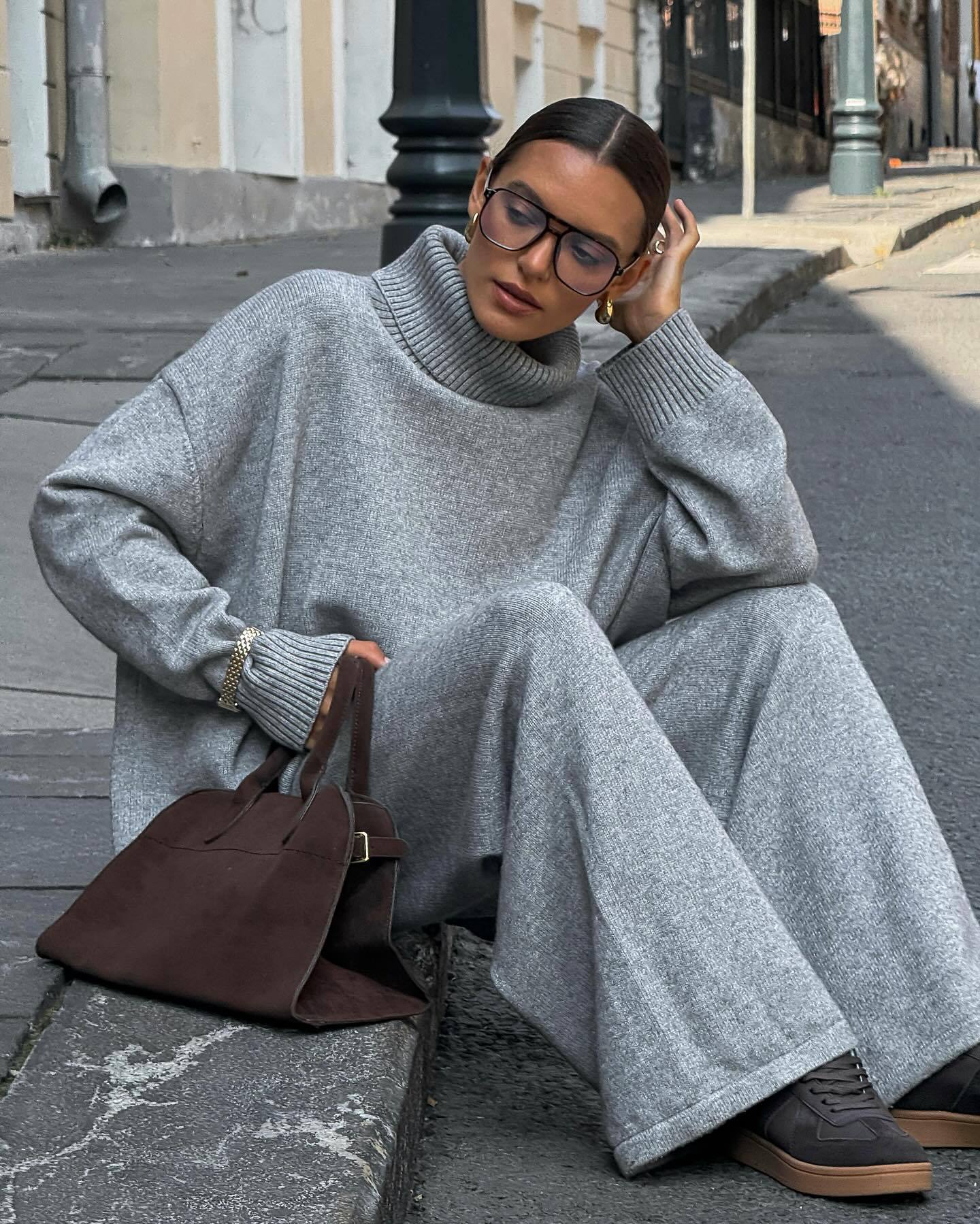 BKQU Autumn Winter Knitted 2 Pieces Women Sets Turtleneck Sweater Wide Leg Pants Suit Commute Street Lady Warm Tracksuit Outfits