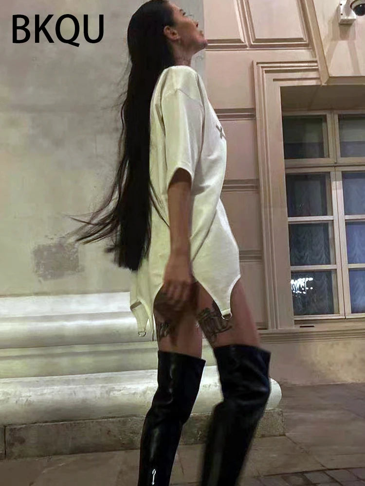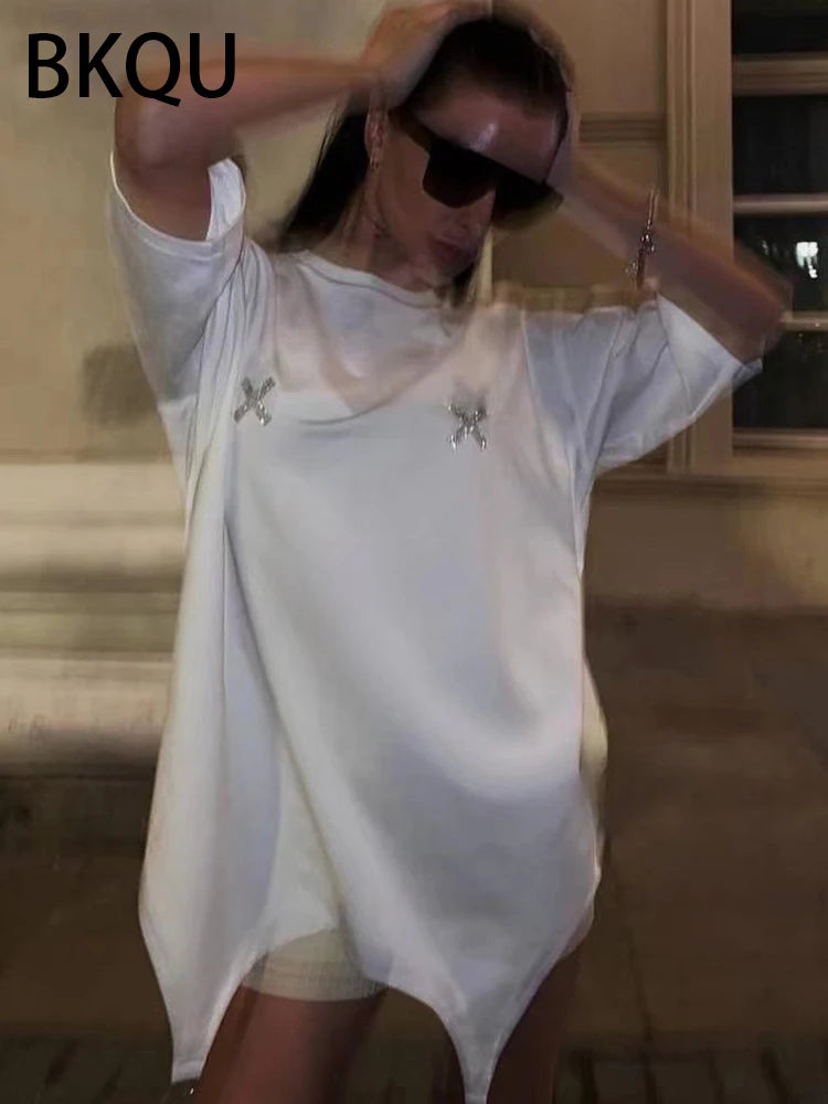BKQU Black Rhinestone Short Sleeve T-shirt Women Aesthetic Irregular Round Neck Diamond Loose Pullover Basic Tees 2024 Summer