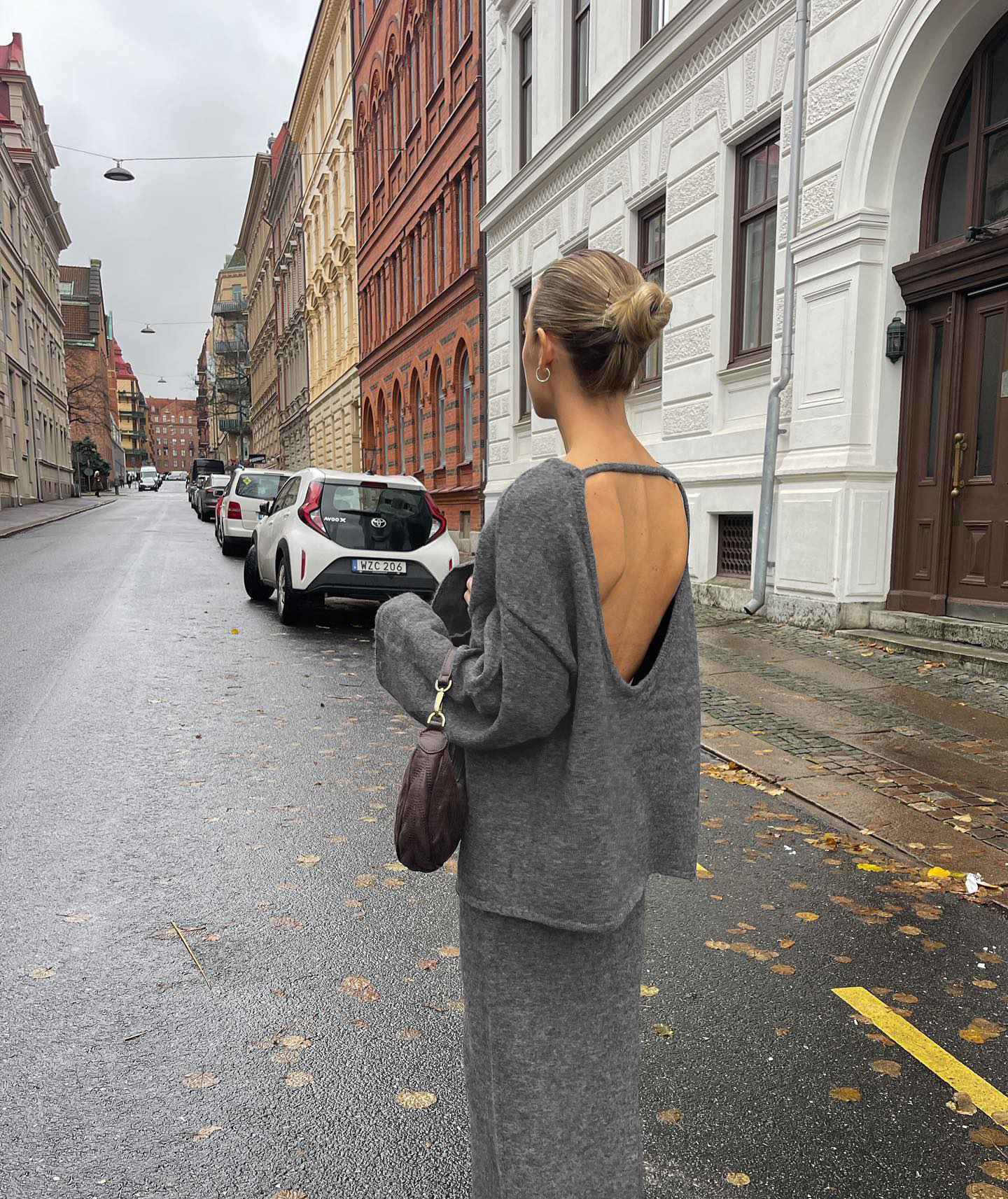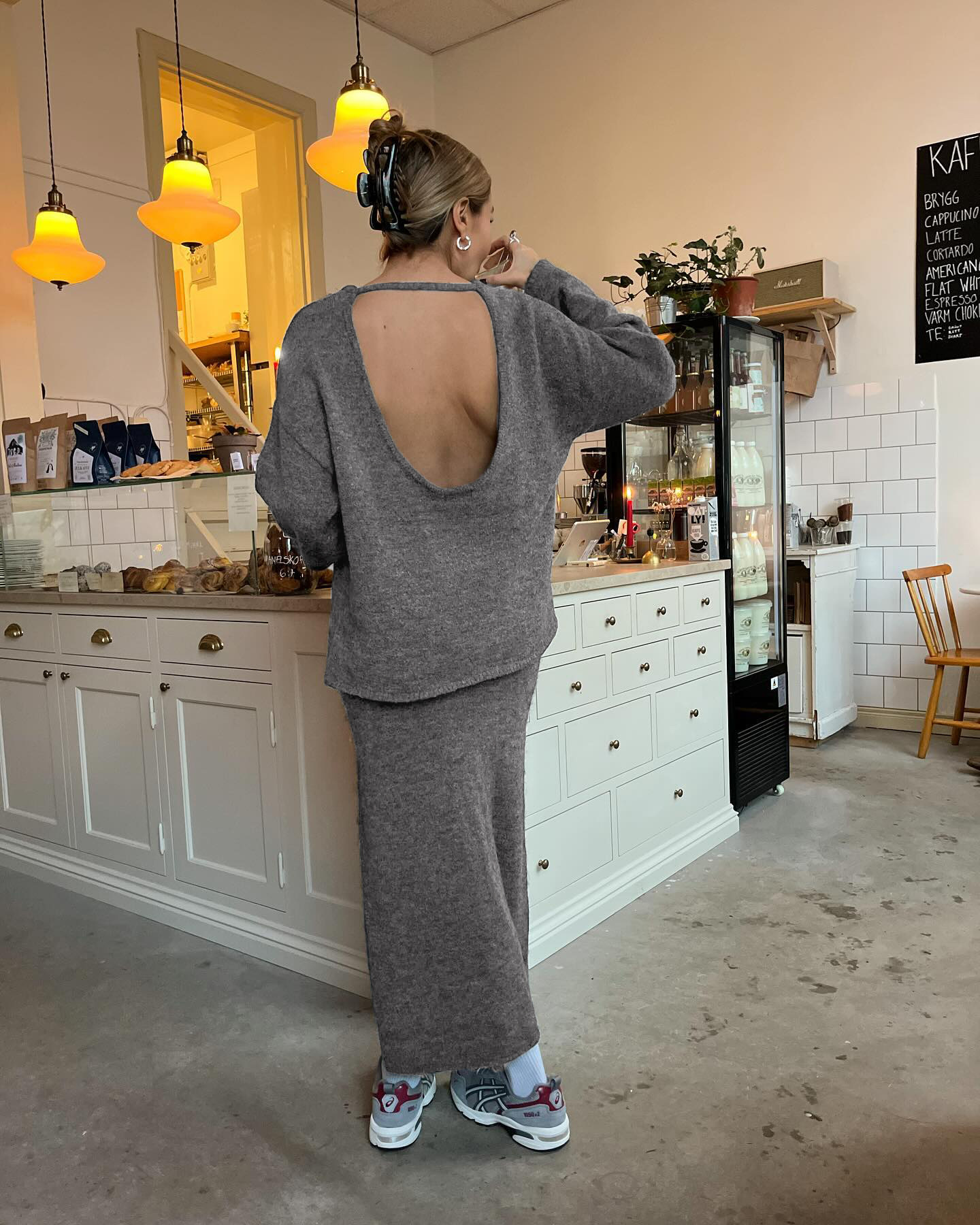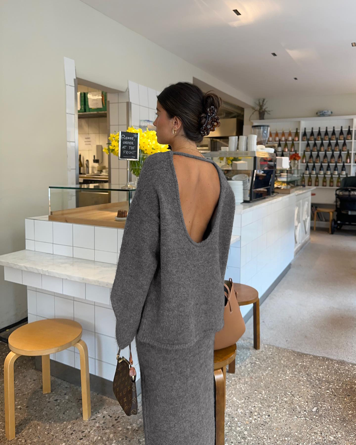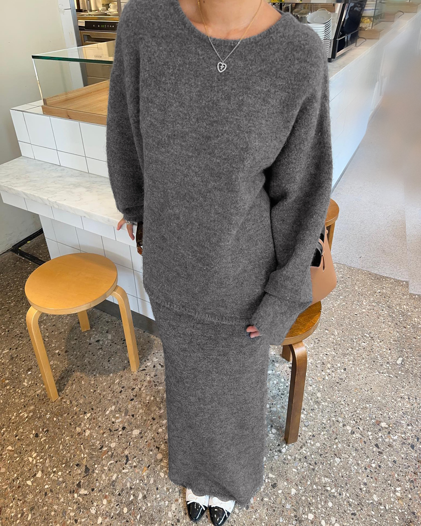 BKQU Casual Knitted Women's Two Piece Sets Long Sleeve Backless Pullover Sweater Elastic Slim Maxi Skirts 2024 Winter Lazy Suits