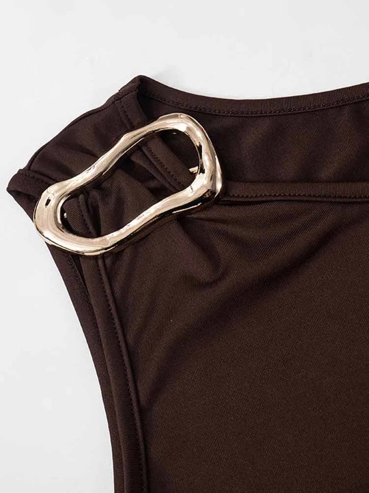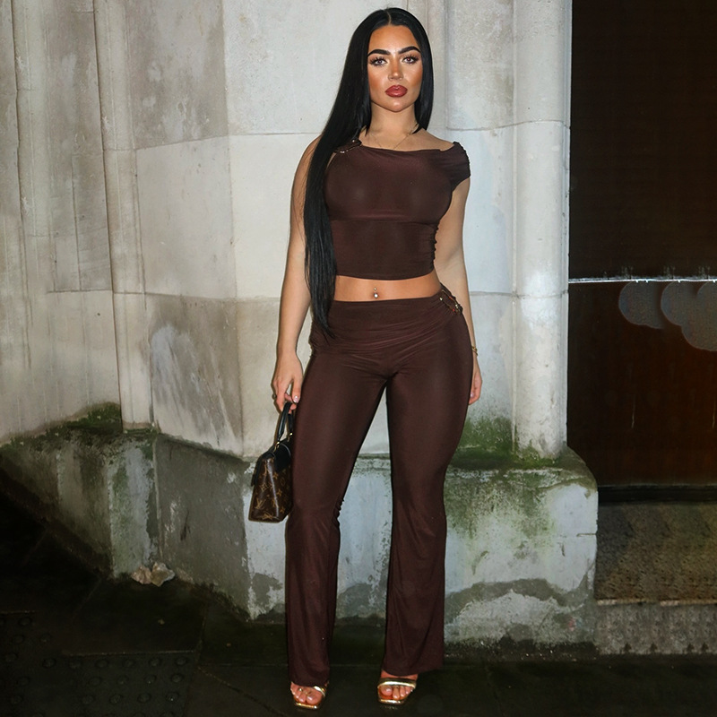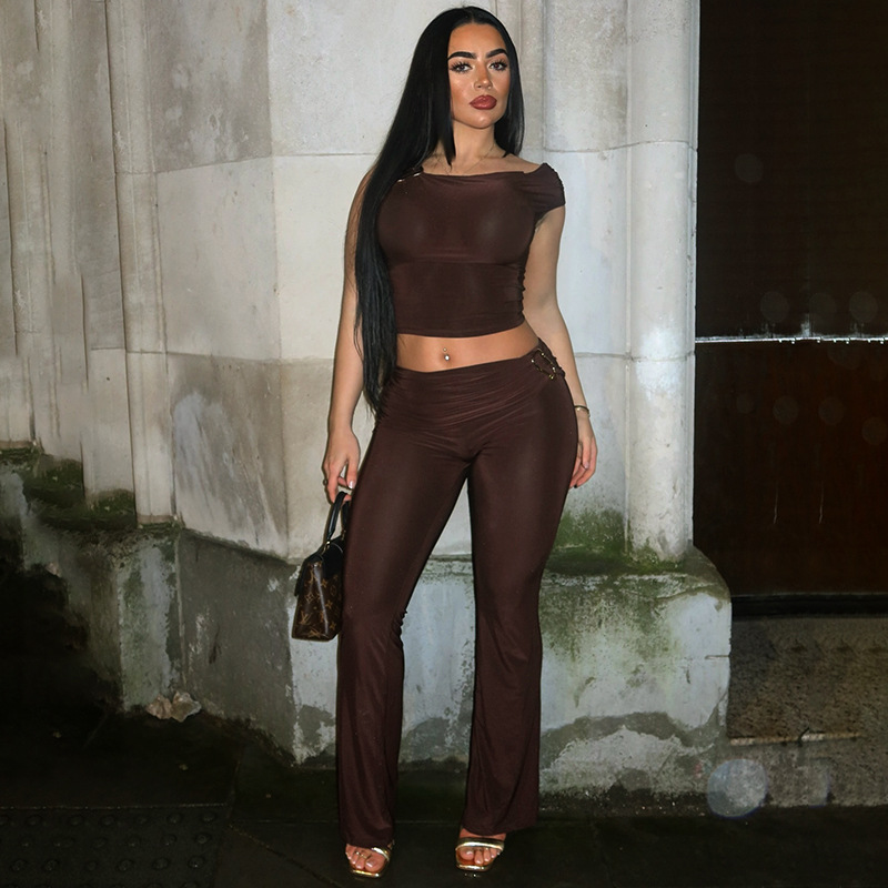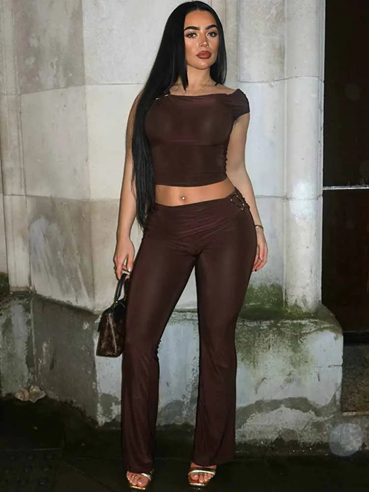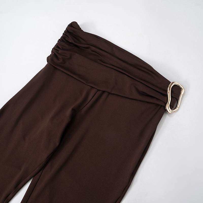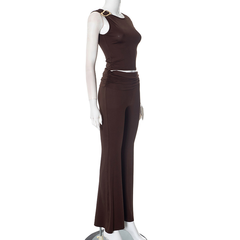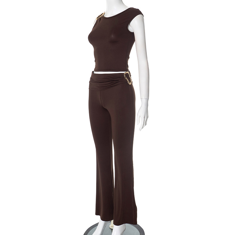 BKQU Casual Pants 2 Piece Set Women Metal Buckle Sleeveless Crop Tops+Ruched Waist Flare Pants Matching 2025 Spring Tracksuits