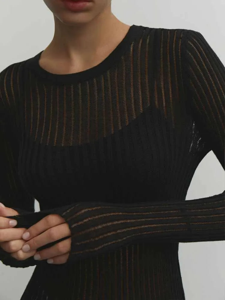 BKQU Casual See Through Knit T-Shirt Women Elegant Striped O-Neck Long Sleeve Tees Elastic Slim Female Basic Pullover Tops 2025