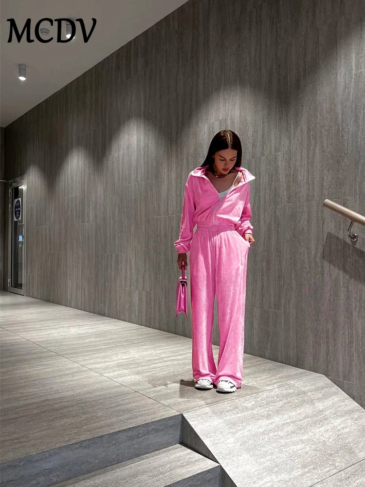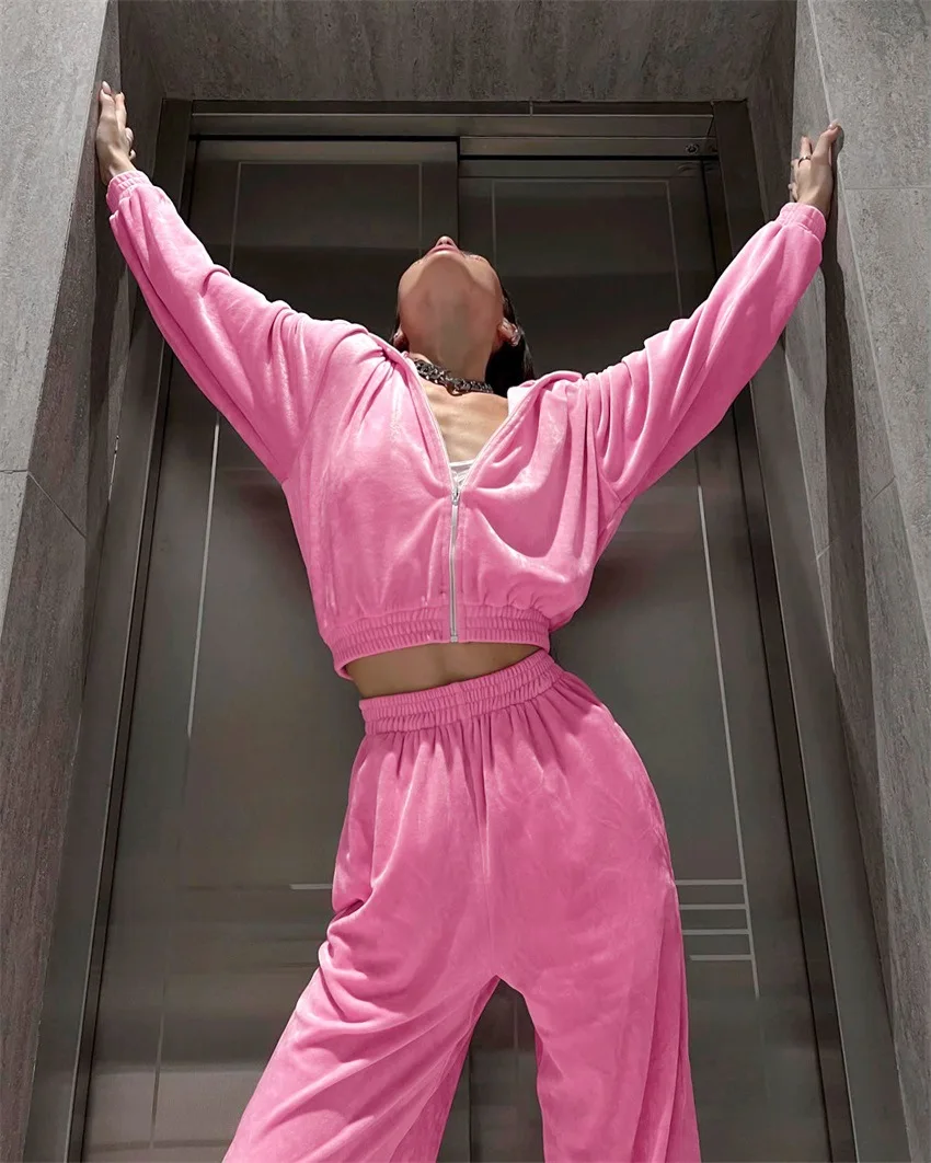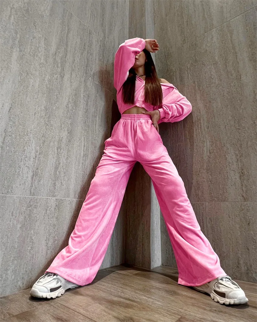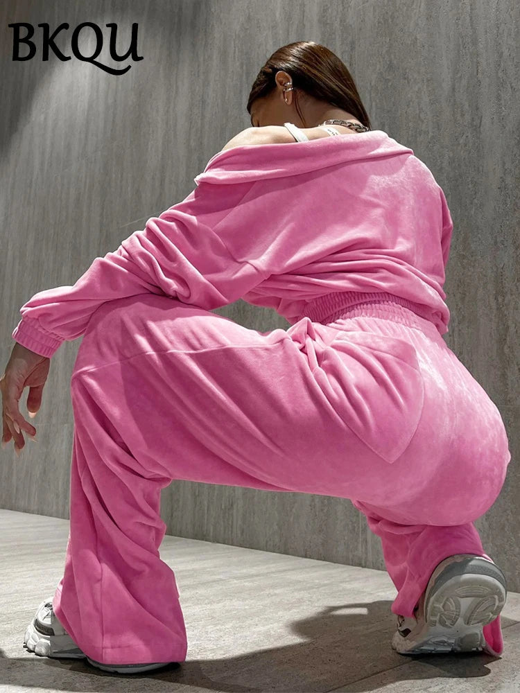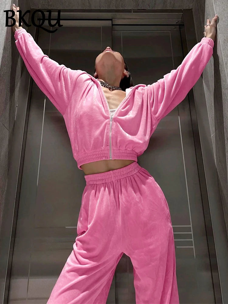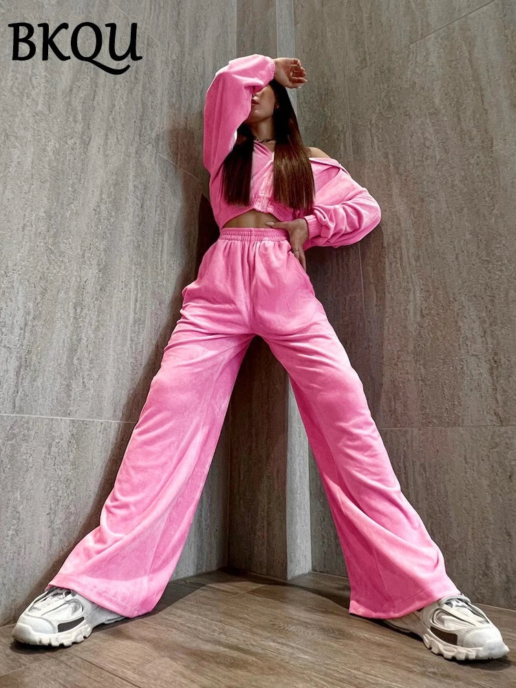 BKQU Casual Solid Velvet Pants Set Women Tracksuit Turn-down Collar Zipper Crop Coat and Wide Leg Pants Two Piece Set 2024