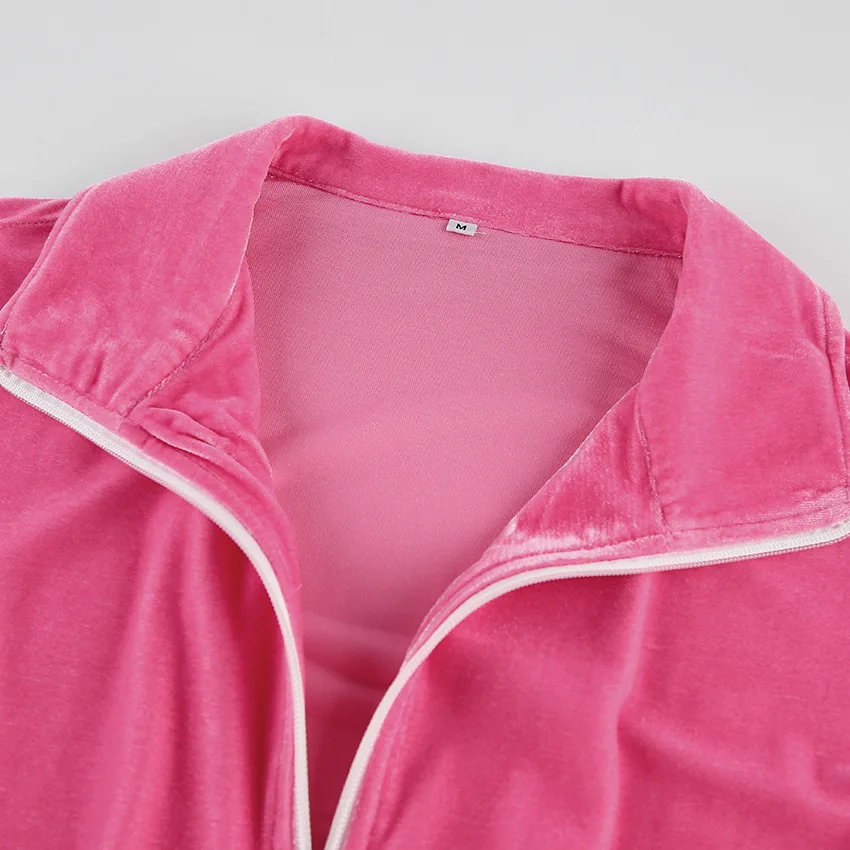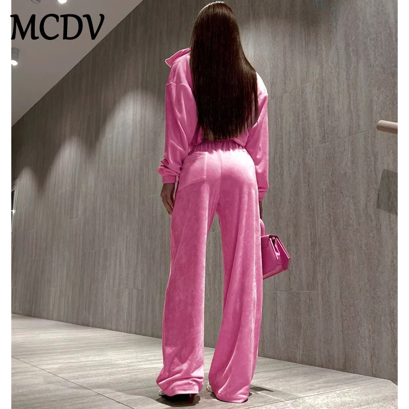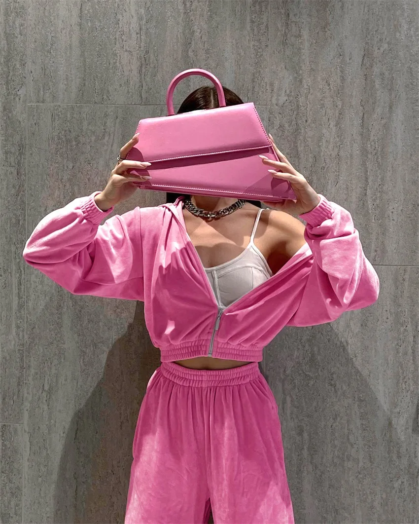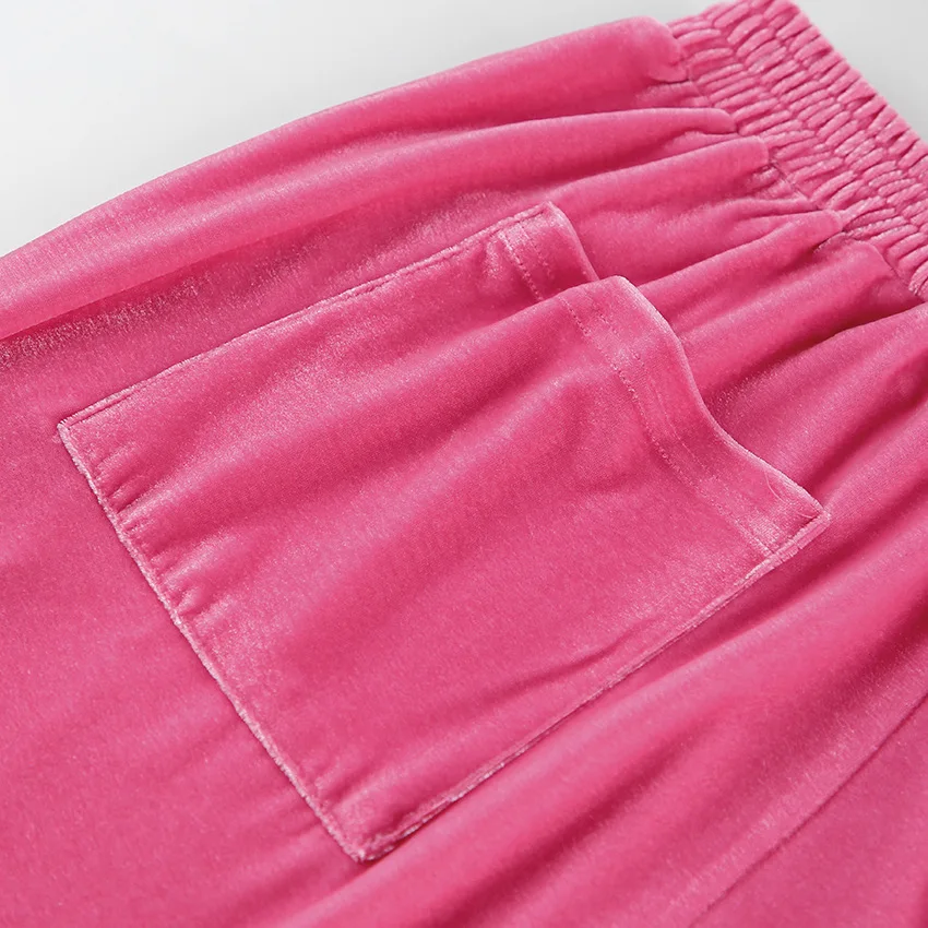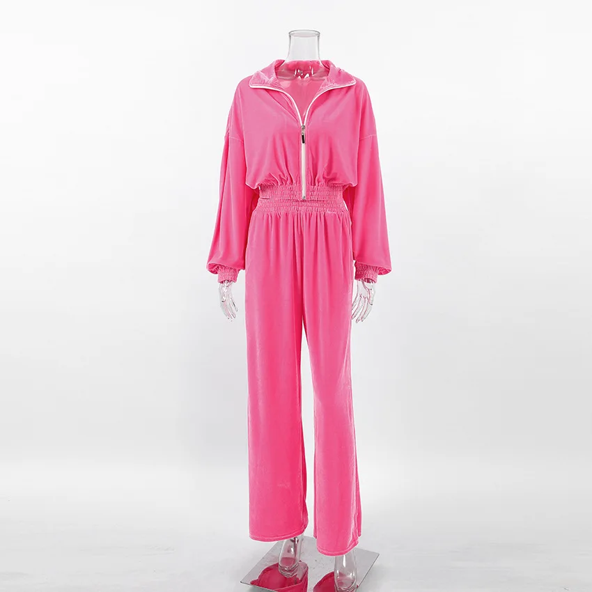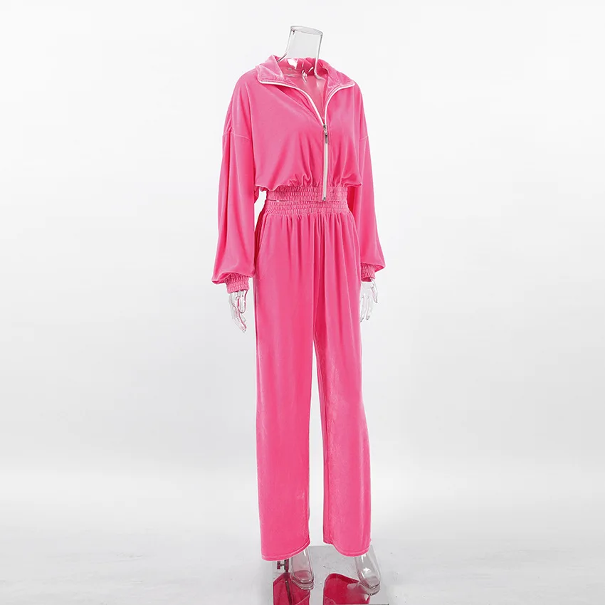 BKQU Casual Solid Velvet Pants Set Women Tracksuit Turn-down Collar Zipper Crop Coat and Wide Leg Pants Two Piece Set 2024