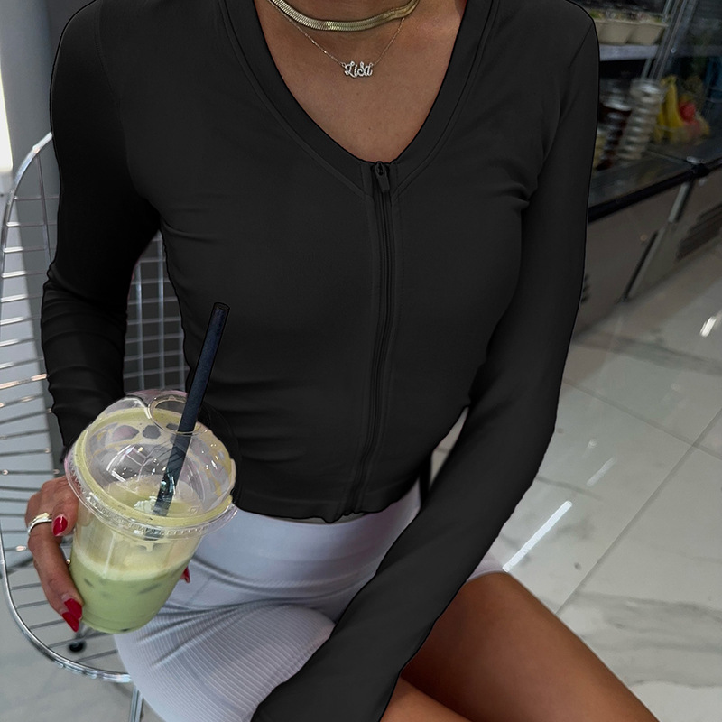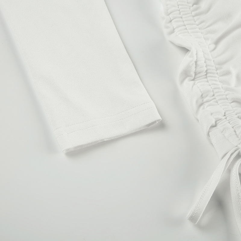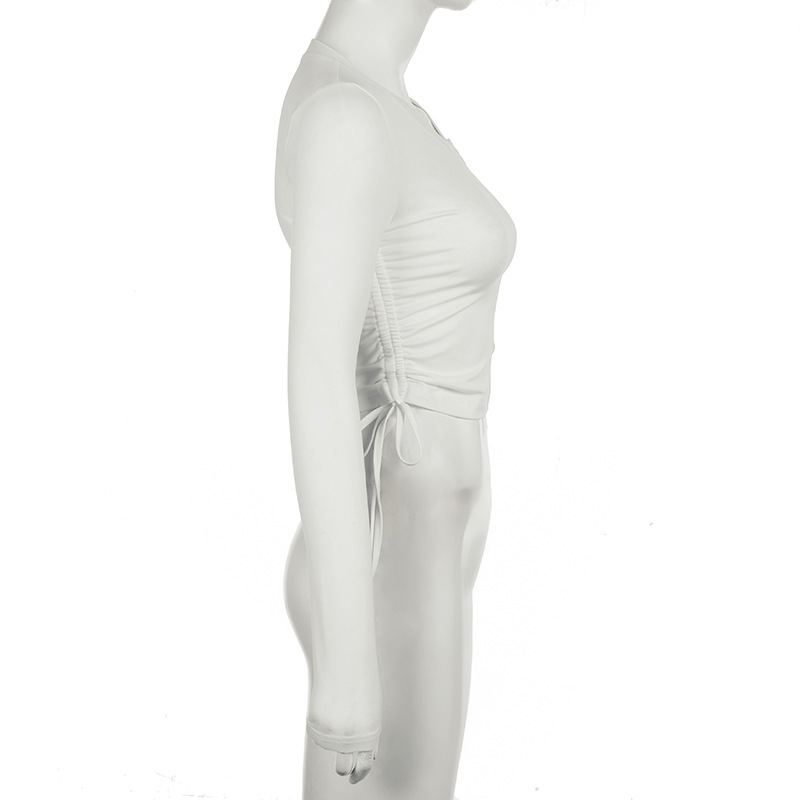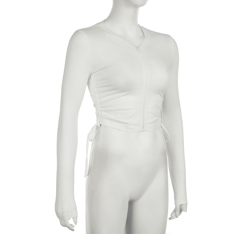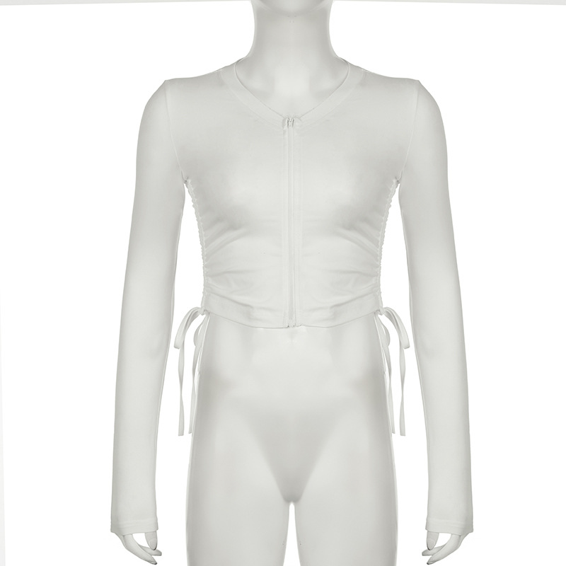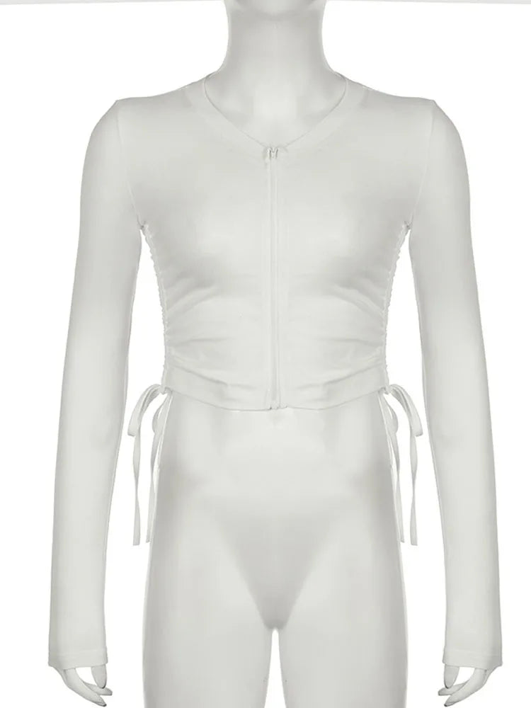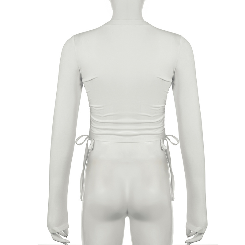 BKQU Casual V-Neck Zipper Long Sleeve T-shirt Women Solid Y2k Drawstring Lace Up Bodycon Sexy Crop Tops Fashion Basic Streetwear
