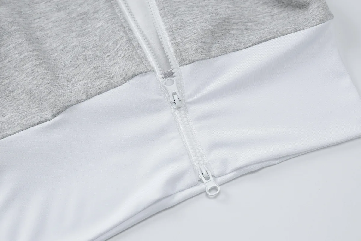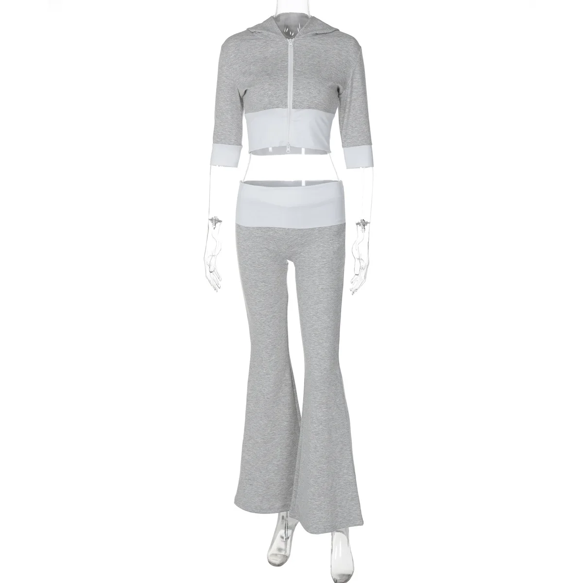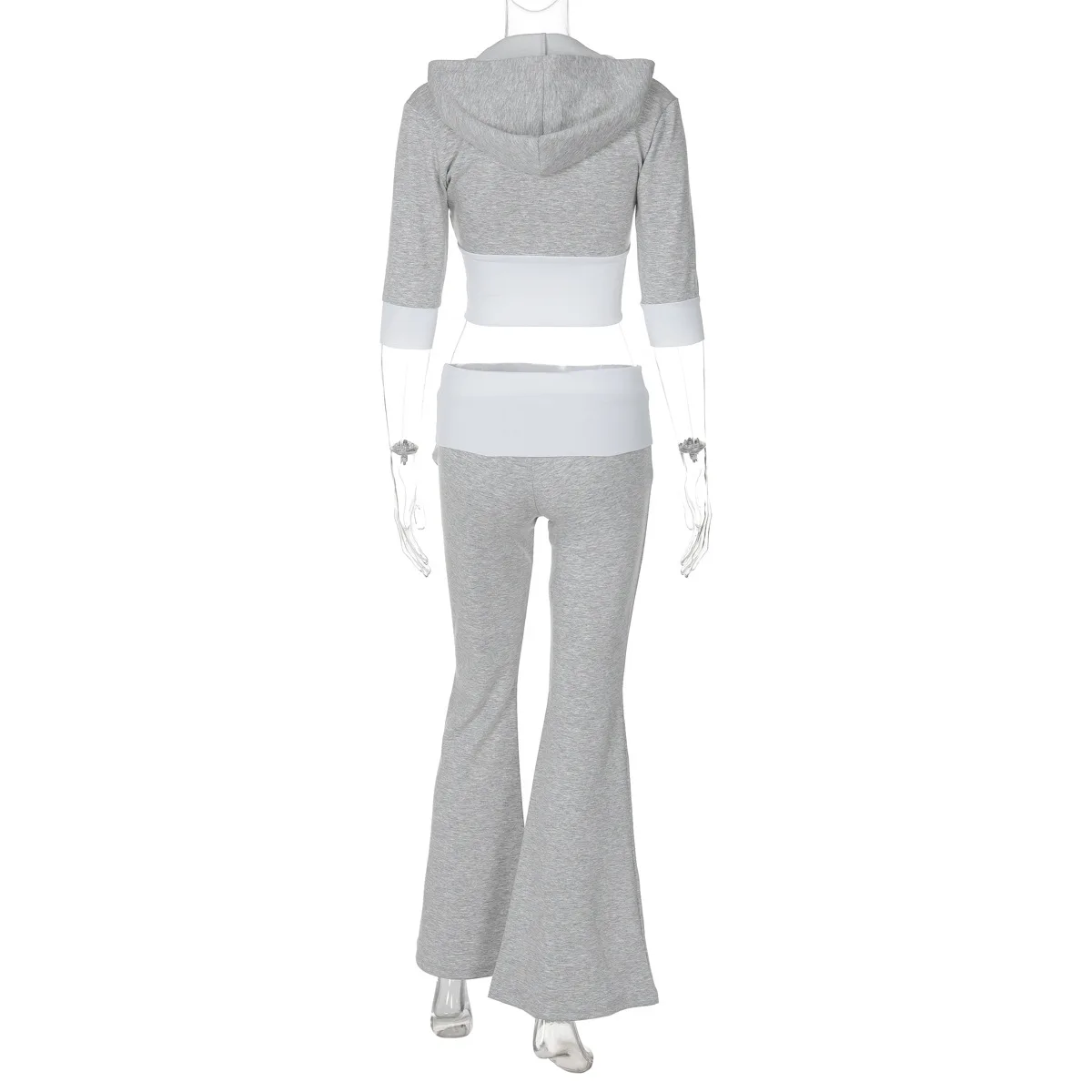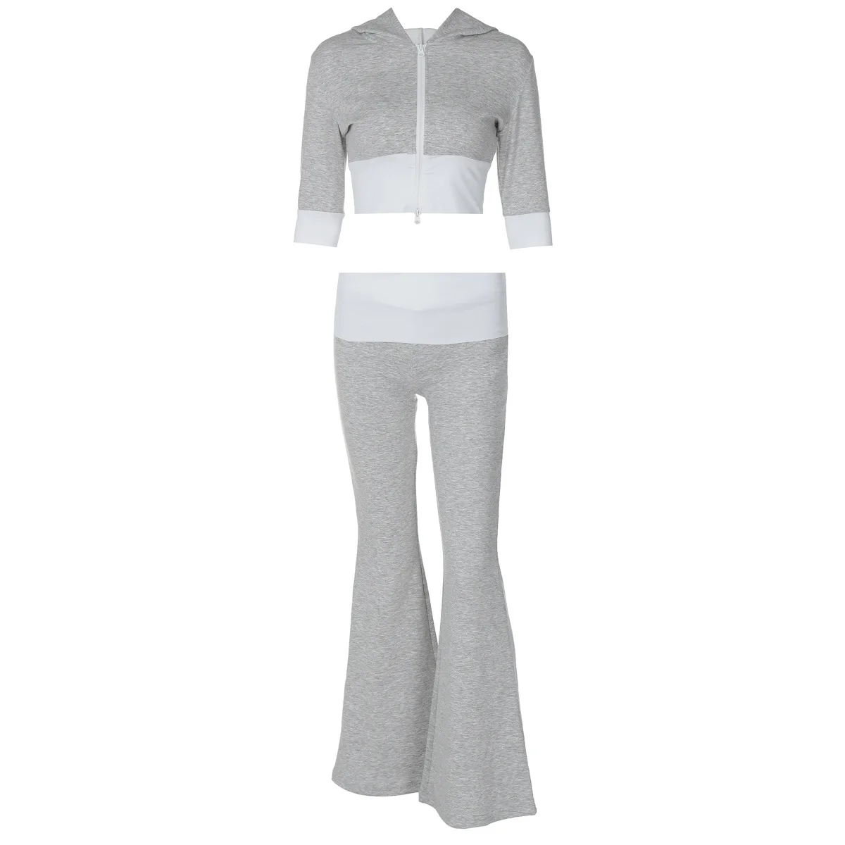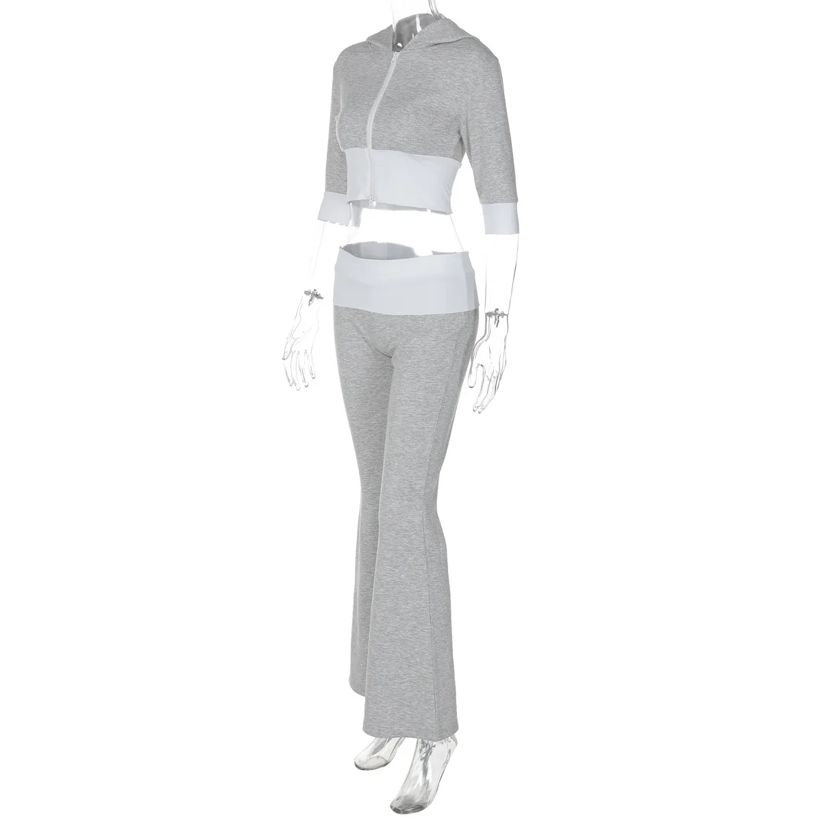 BKQU Contrast Patchwork Pants Set Women Short Sleeve Zipper Hoodie and High Waist Flare Leggings Yoga Pants Two Piece Sets Sport