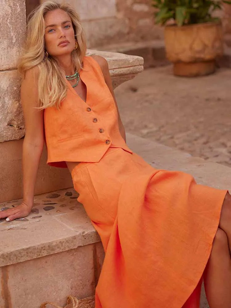 BKQU Cotton Linen Elegant Waistcoat Long Skirt Sets Womem Summer V-neck Sleeveless Top Casual Loose Dress 2 Piece Holiday Outfit