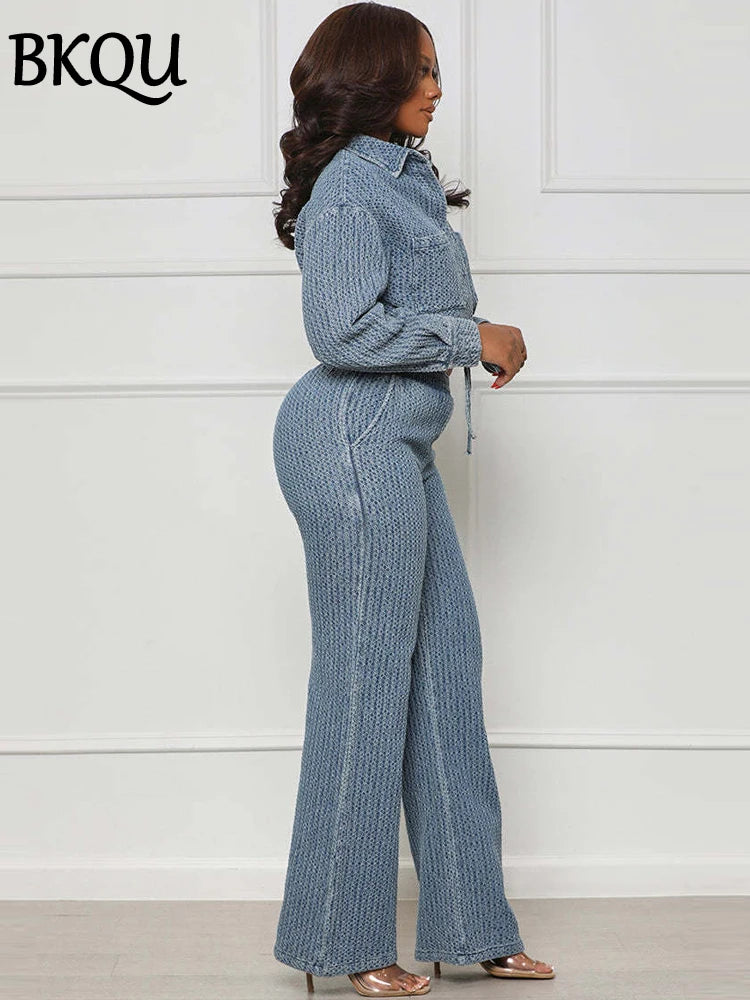 BKQU Denim Pants Set Women Pockets Cardigan Short Jackets and High Waist Wide Leg Jeans Two Piece Set 2024 Autumn Casual Outfits