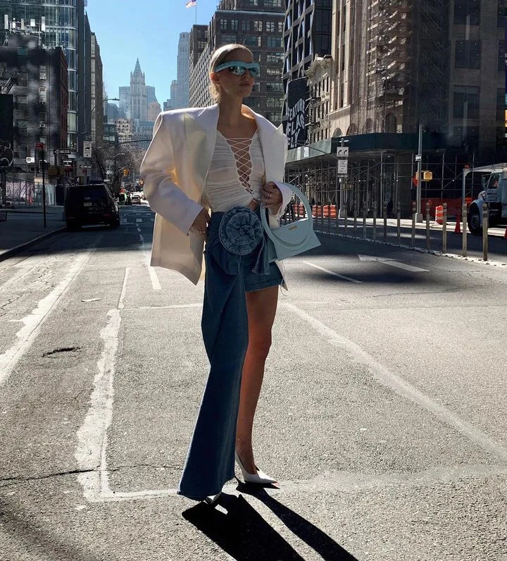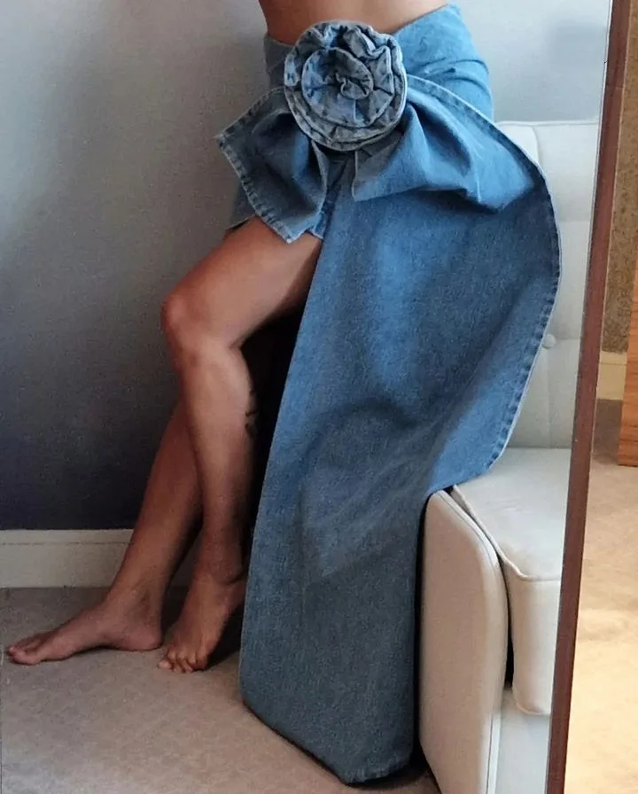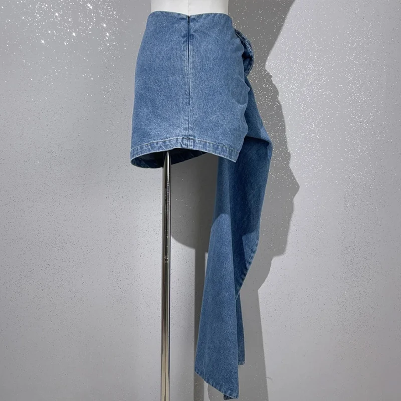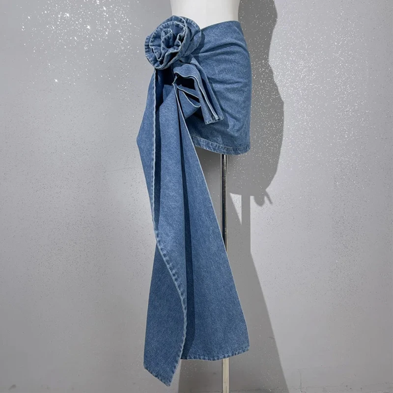 BKQU Denim Skirts Women Streetwear High Waist Three-dimensional Flower Design Blue Mini Skirts 2024 Summer Asymmetric Hip Skirt