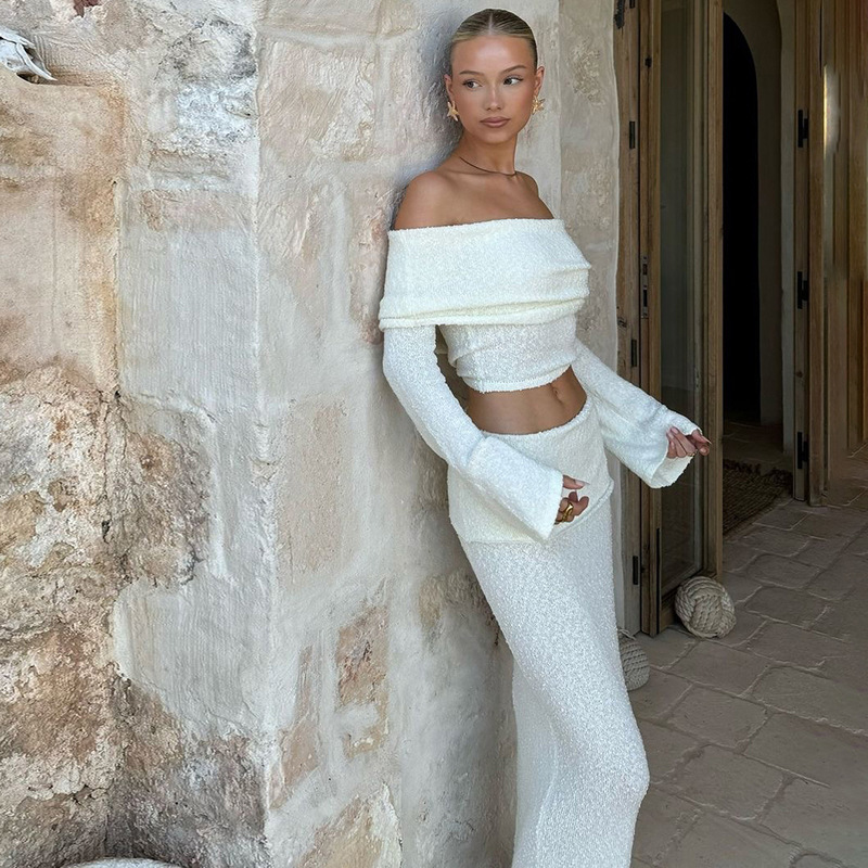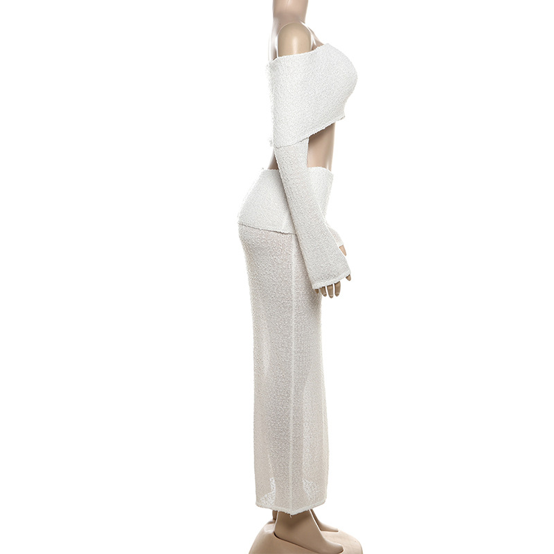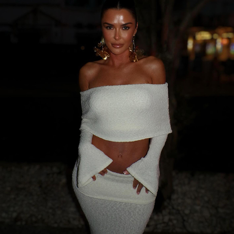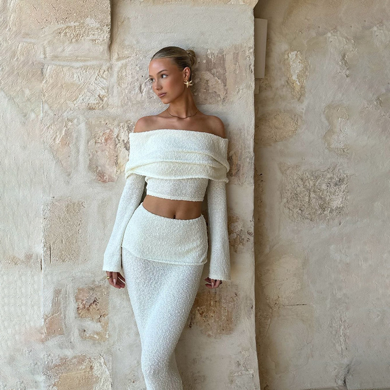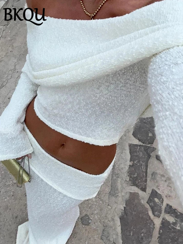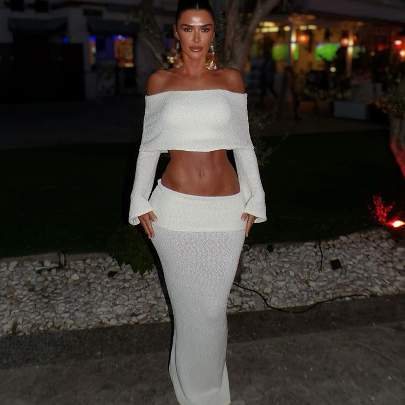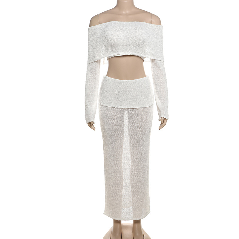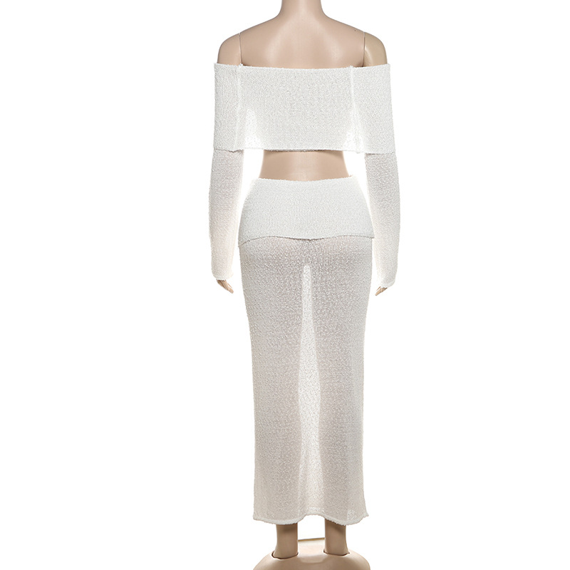 BKQU Elegant Long Skirt 2 Piece Set Women Sexy Off Shoulder Crop Top See Through Maxi Skirt Matching Autumn Female Party Outfits