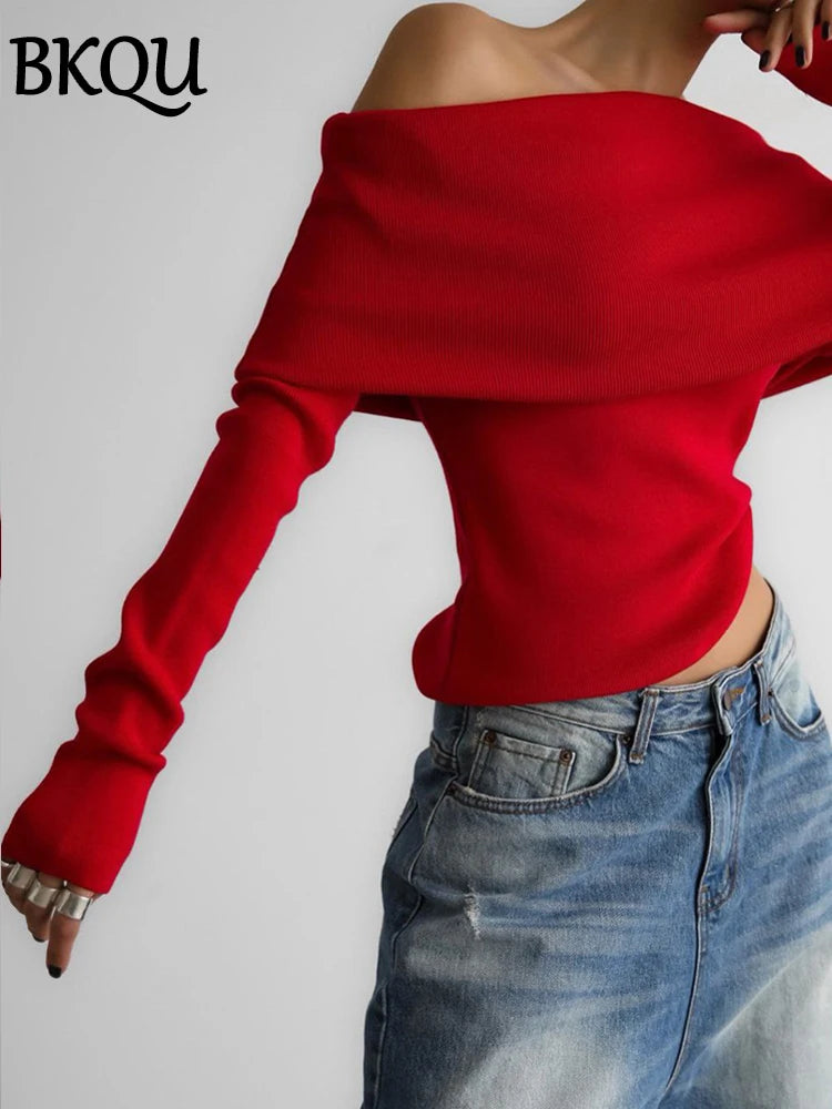 BKQU Elegant Off Shoulder Knitted T-Shirts Women Autumn Winter Slim Slash Neck Long Sleeve Pullover Tops Streetwear Basic Tees