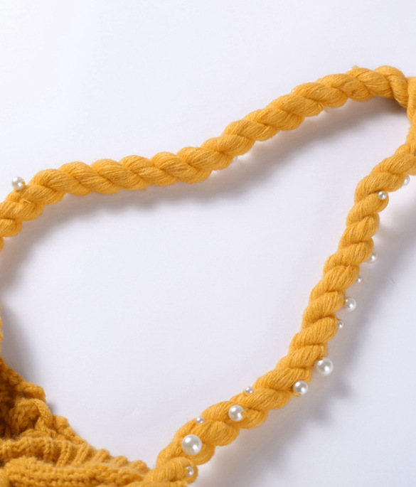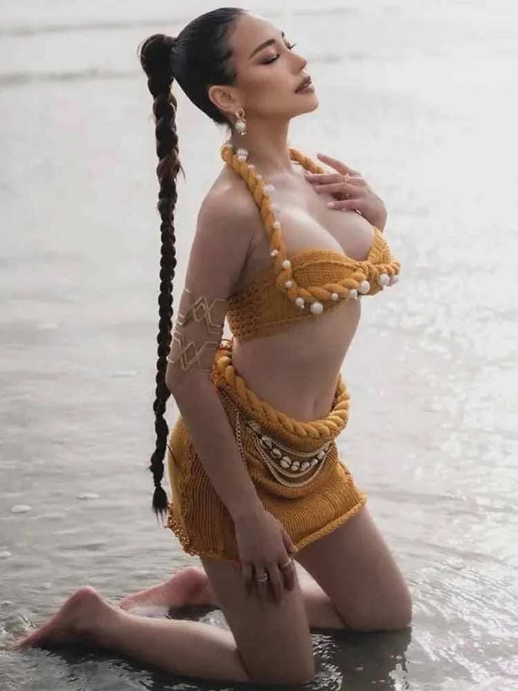 BKQU Elegant Pearls Decoration Knit Bikini Top Skirt Sets Women Beach Outfits Sexy Twist Halter Vest Mini Skirt Summer 2 Pcs Set