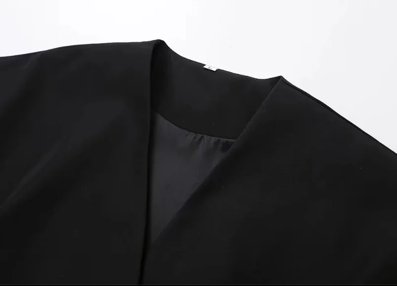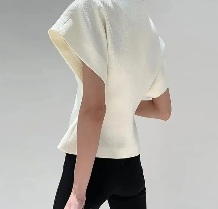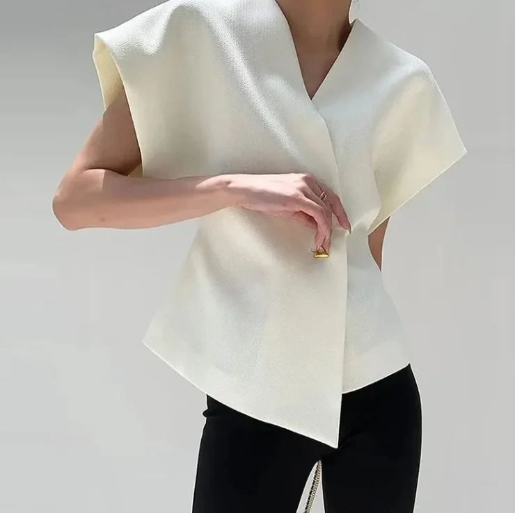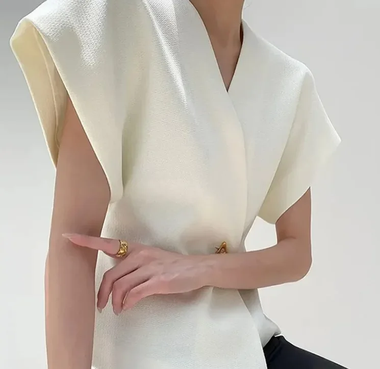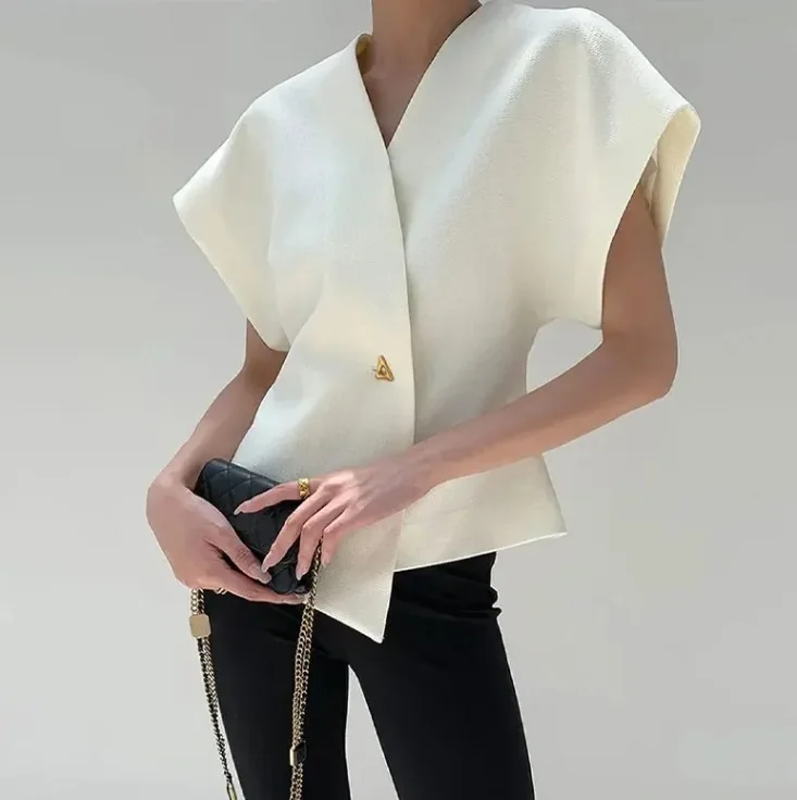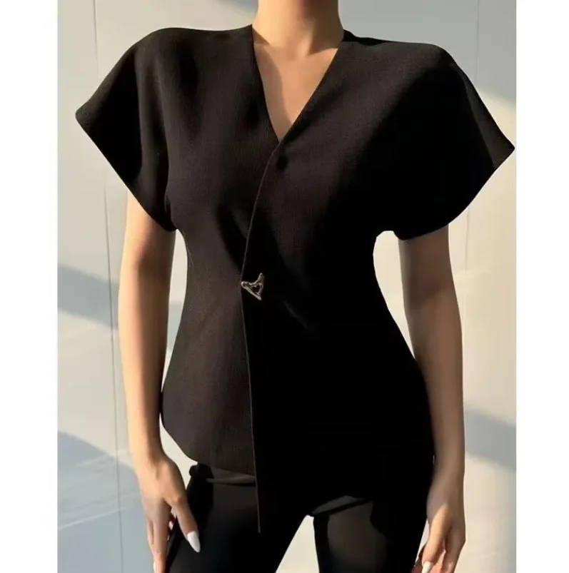 BKQU Elegant V-neck Shirts Women Short Sleeve One Button Chic Office Shirts Irregular Female Solid High Street Cardigan Top 2024