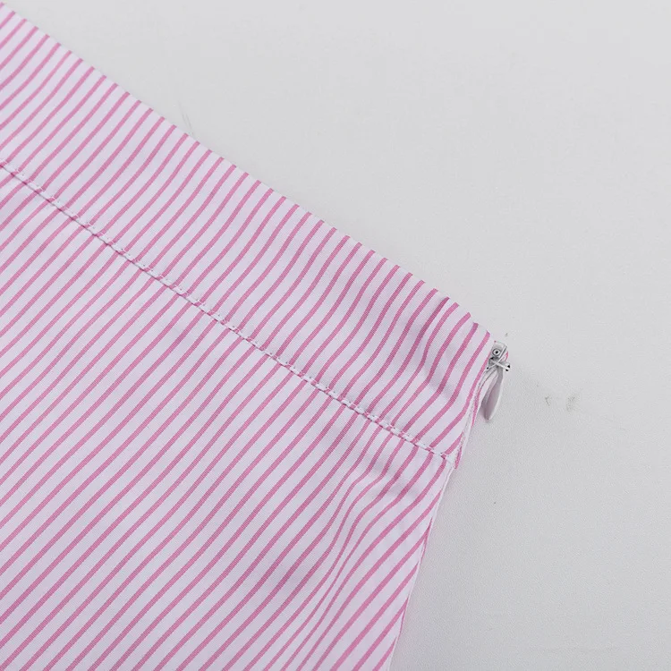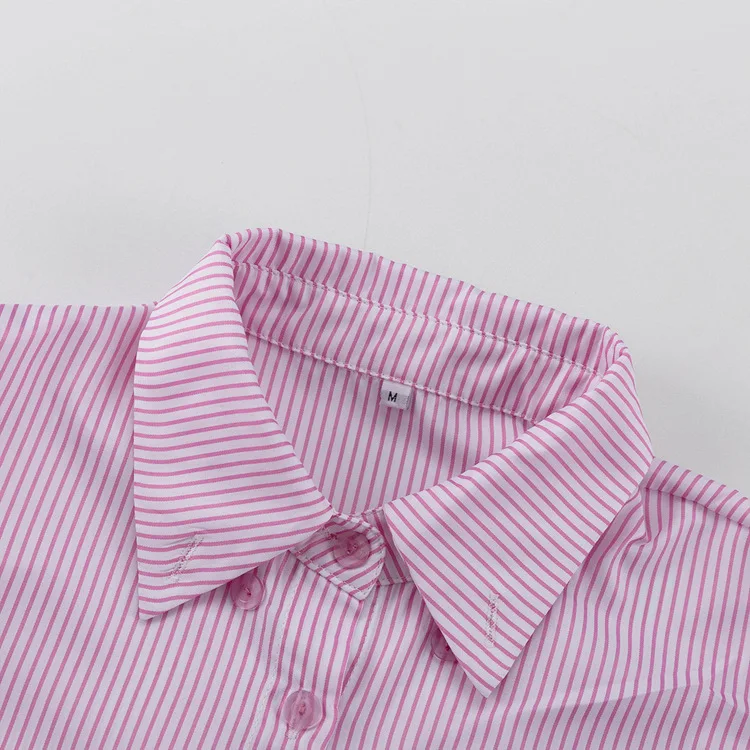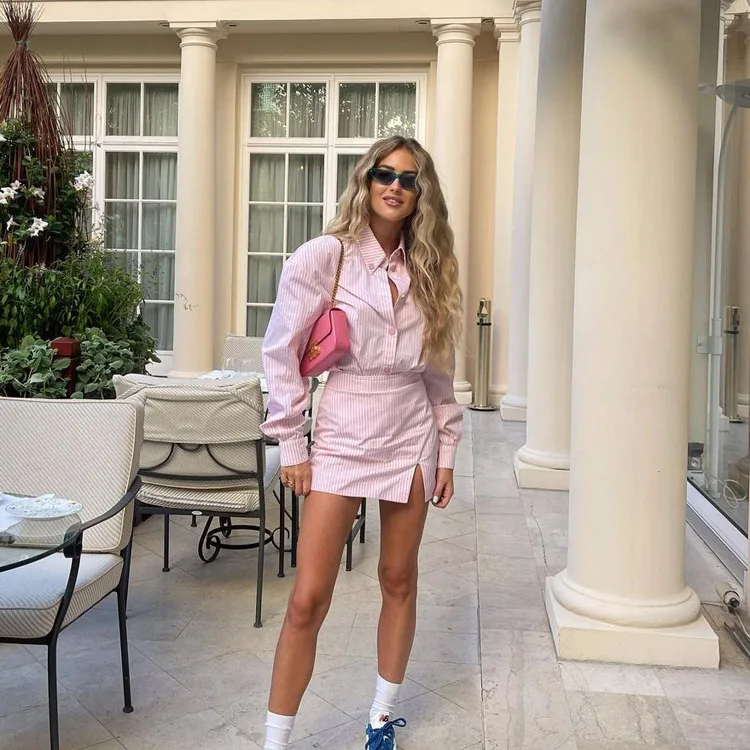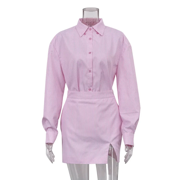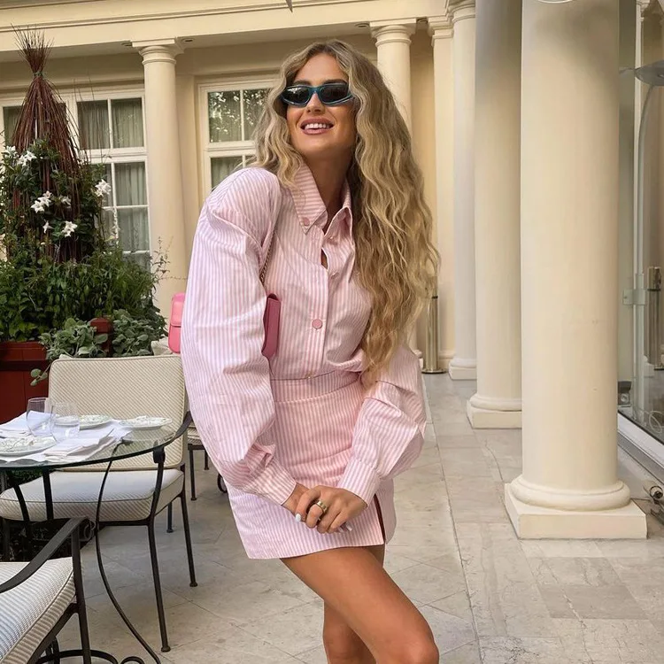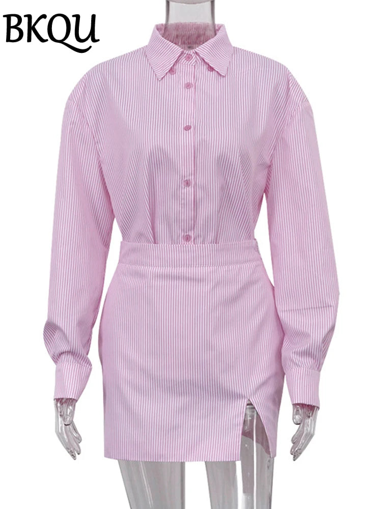 BKQU Fashion Stripe Print Skirt Two Piece Sets Women Office Long Sleeve Button Shirts With High Waist Mini Skirts Outfits Autumn