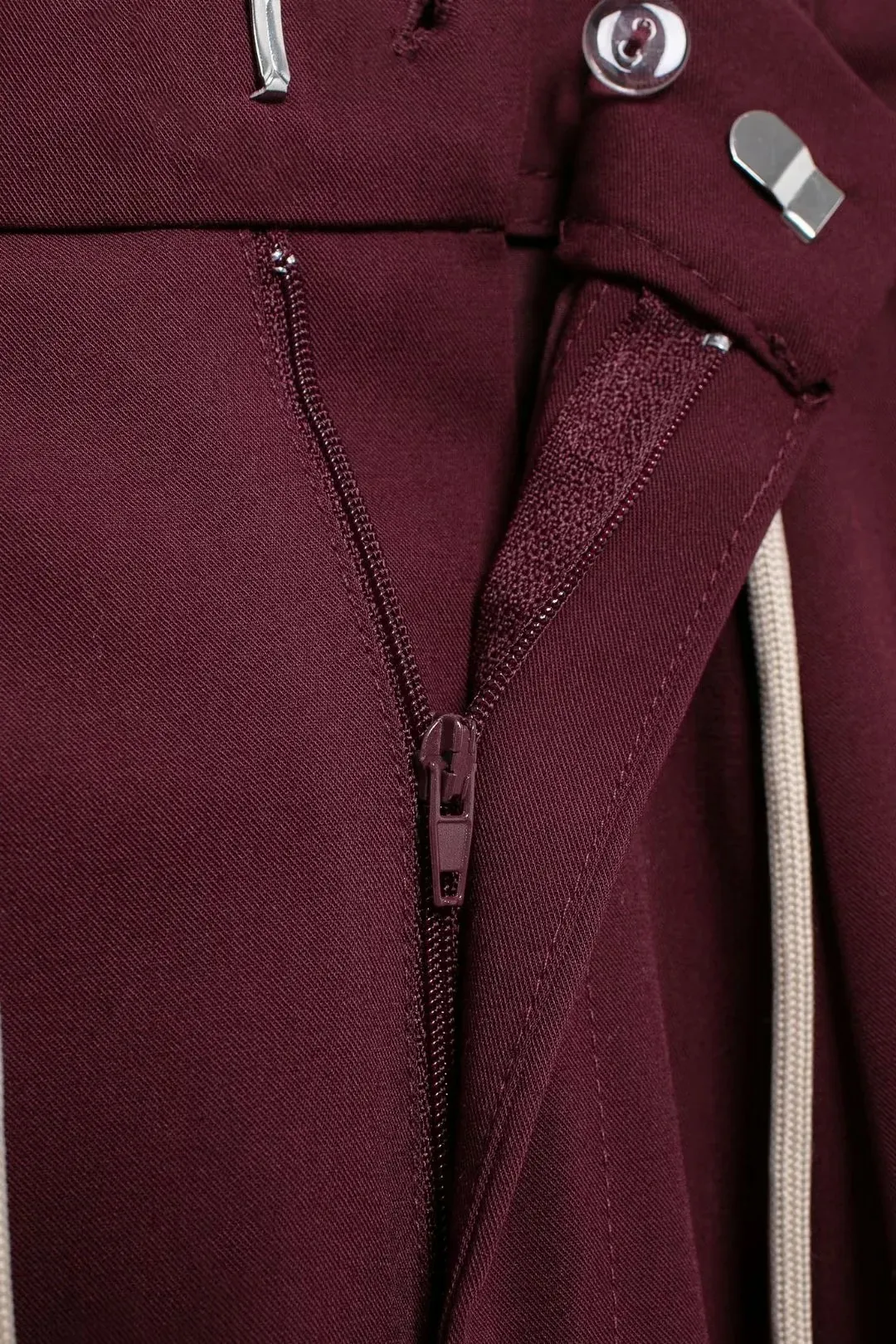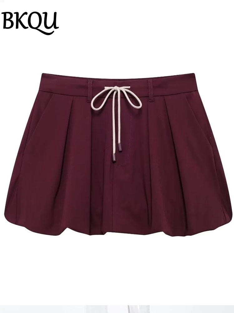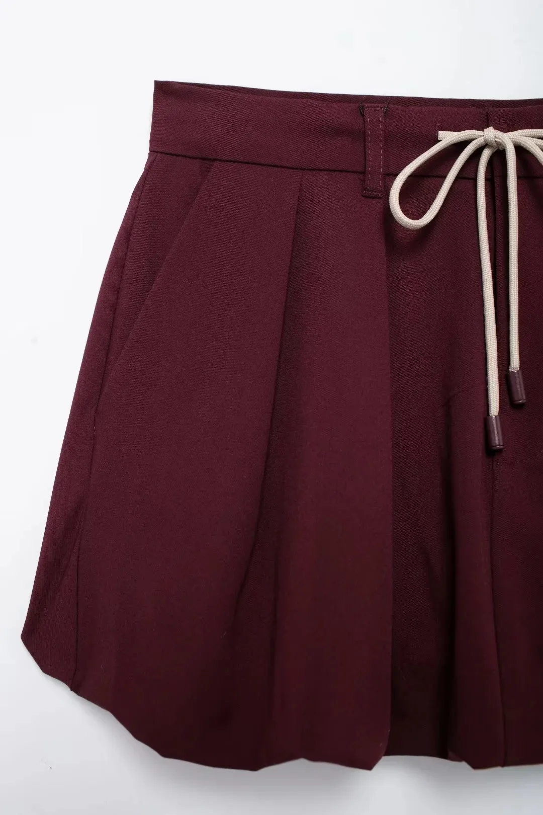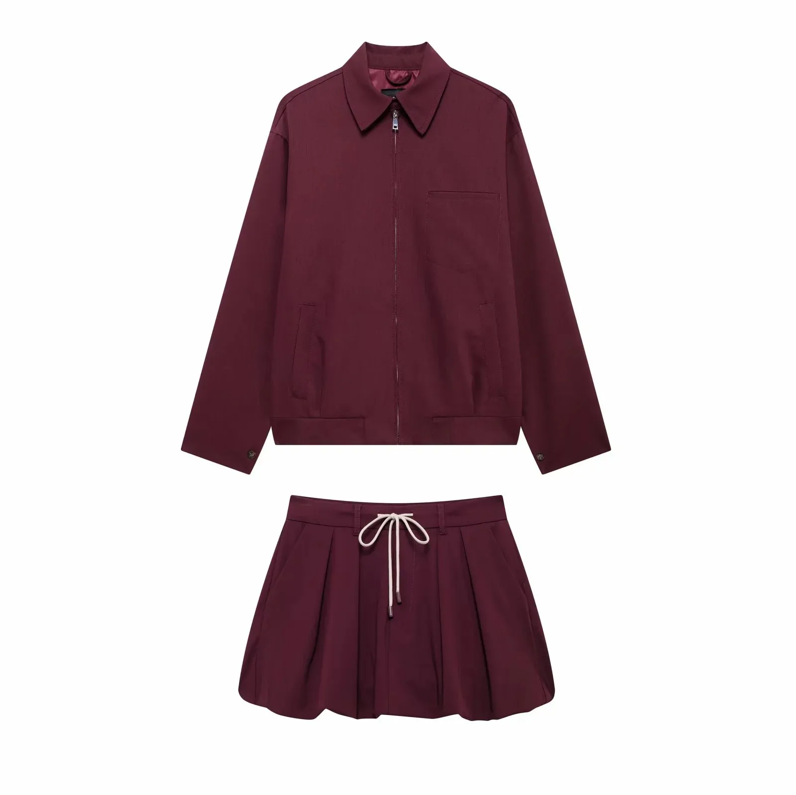 BKQU Fashion Two Piece Sets Women Long Sleeves Zipper Jackets and Tied Lantern Mini Skirt Wine Red Casual Street 2 Piece Outfits