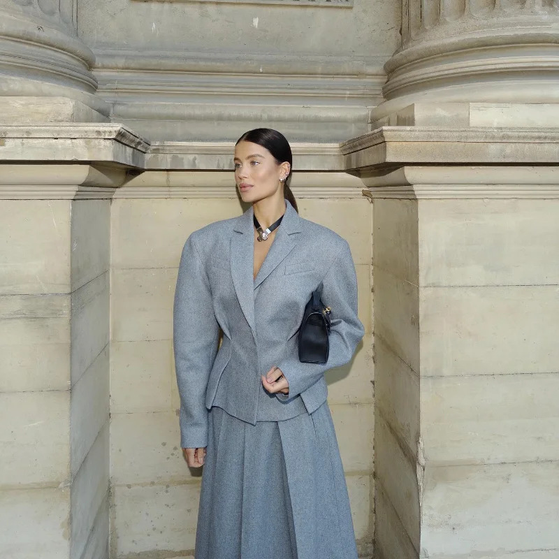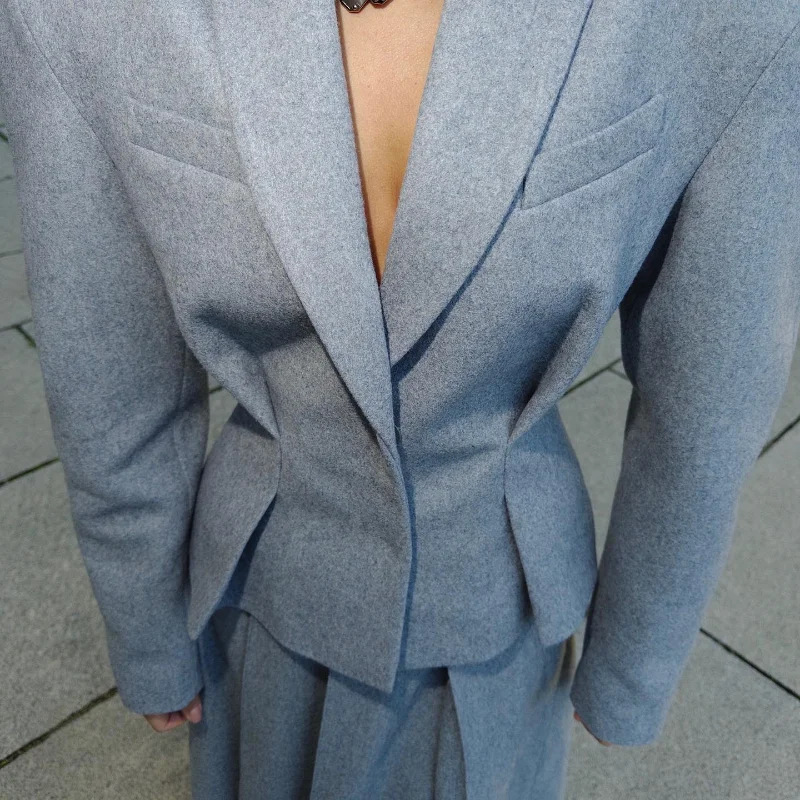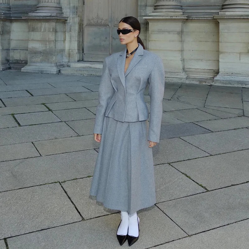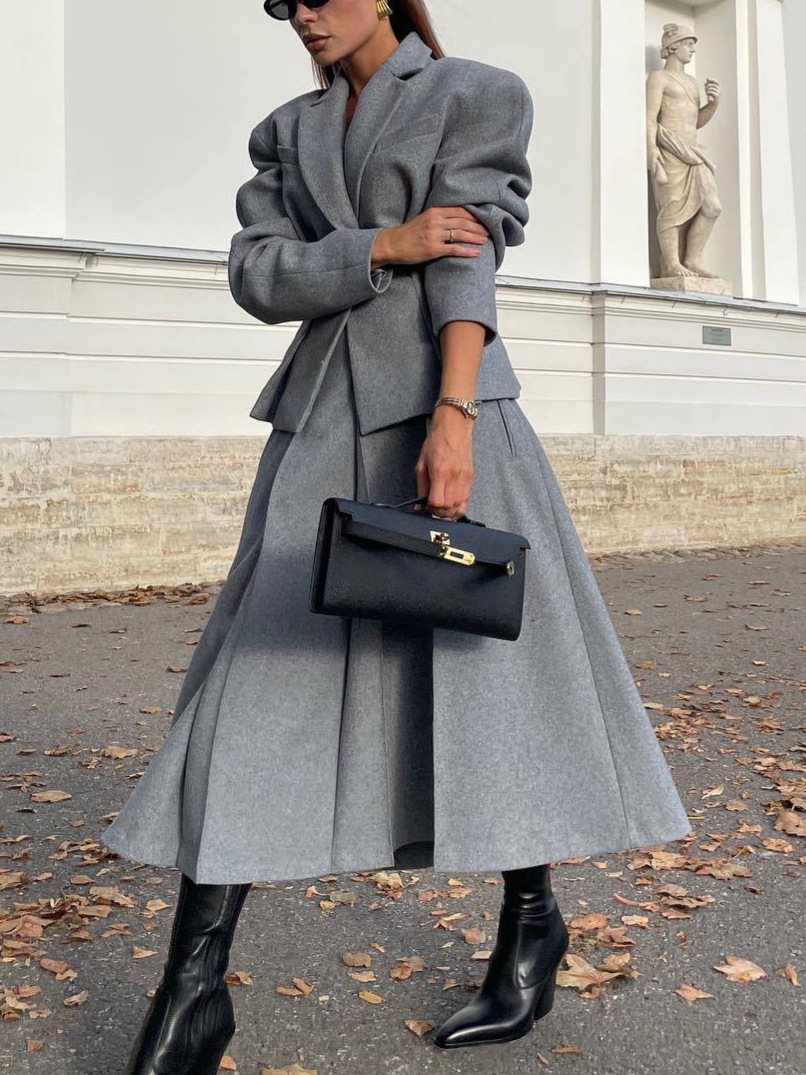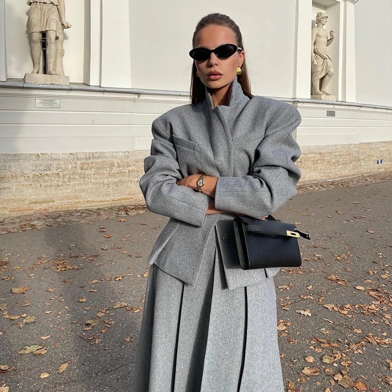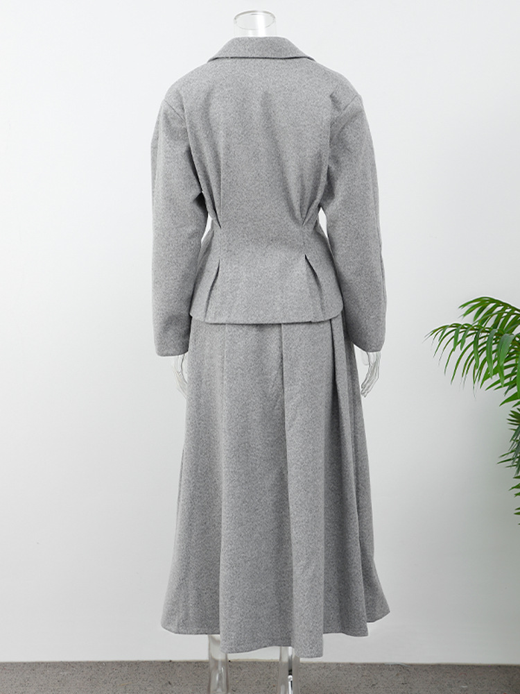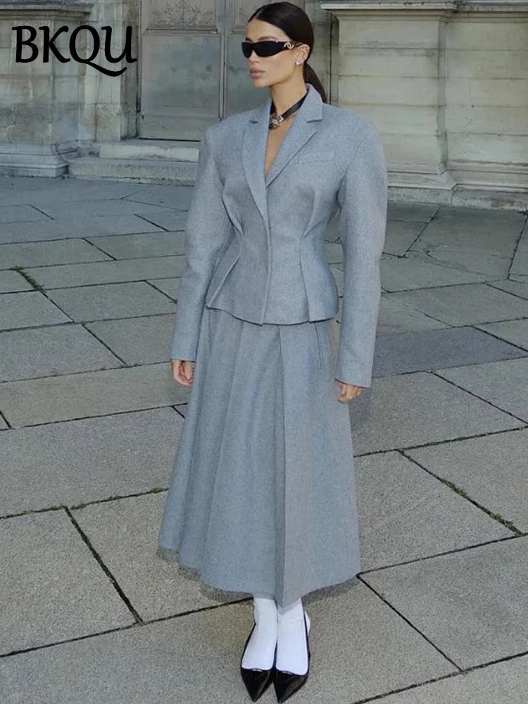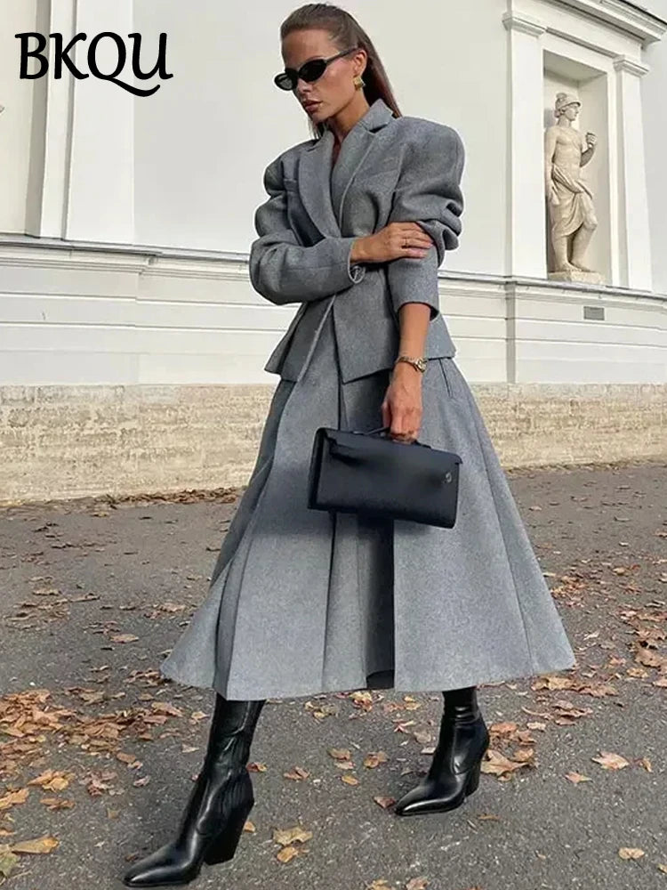 BKQU Fashion Woolen Jackets Pleated Skirt Sets Women Elegant Slim Long Sleeve Blazers A-line Maxi Skirt 2 Pieces Winter Outfits