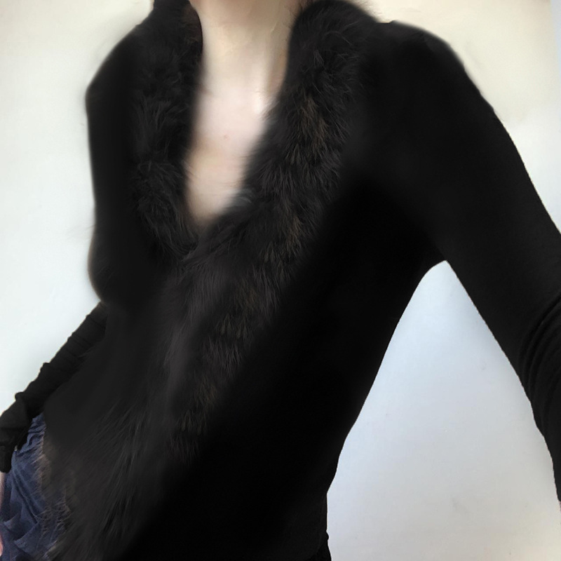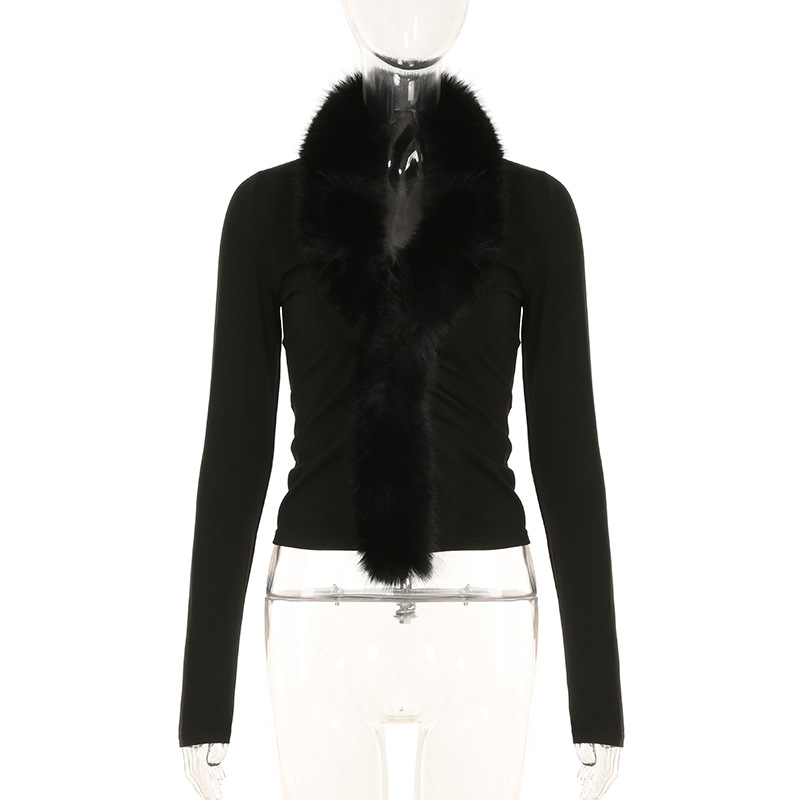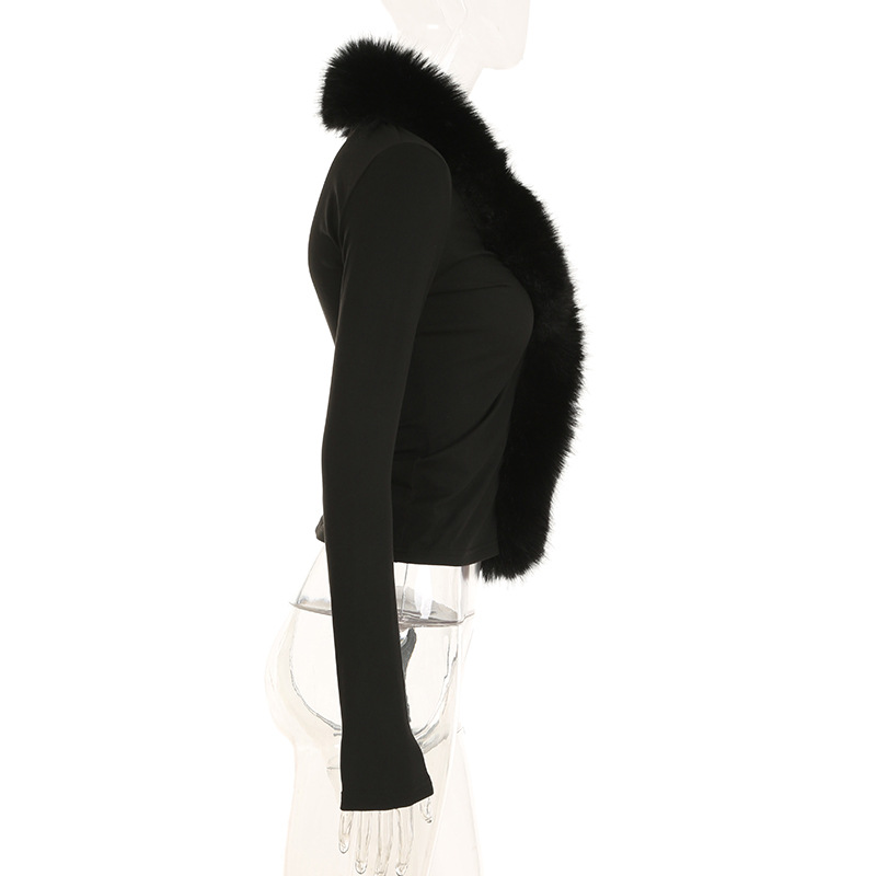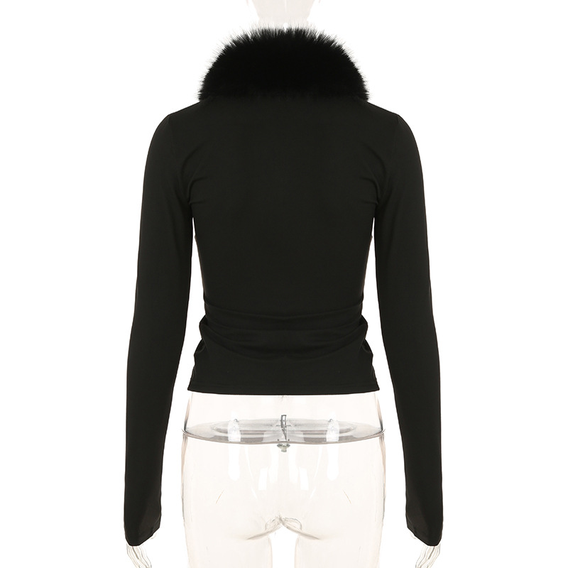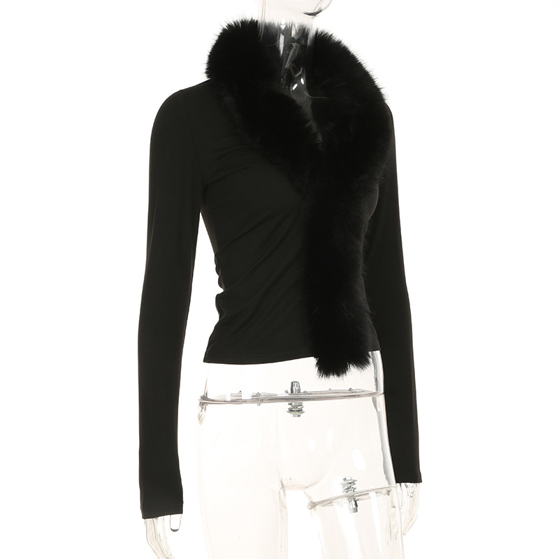 BKQU Fur Collar Long Sleeve Pullover Tops Women French Elegant V Neck Furry Slim T-shirt Autumn Winter Black Tees Y2K Streetwear