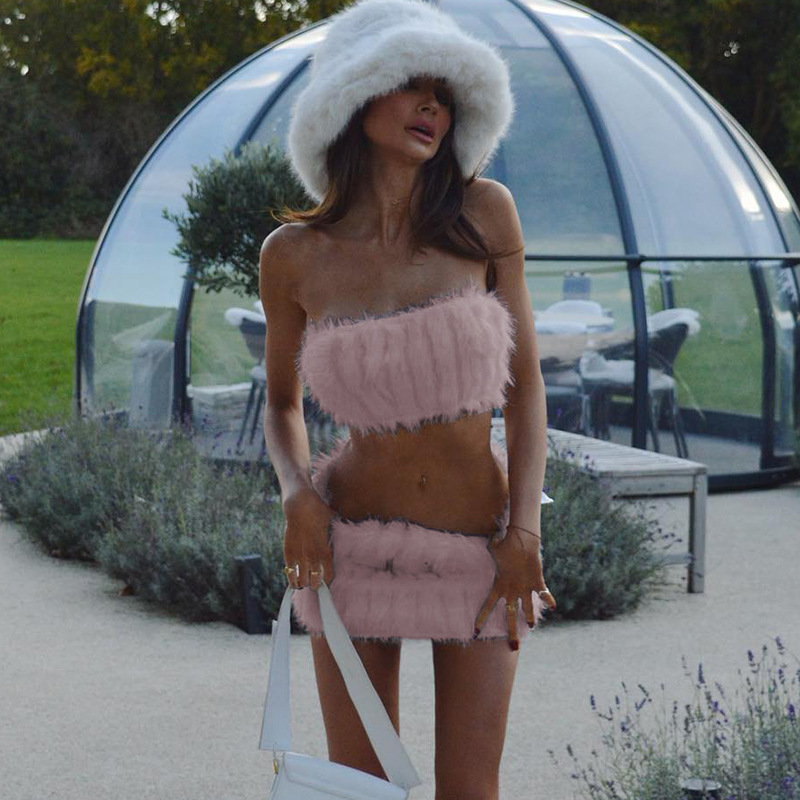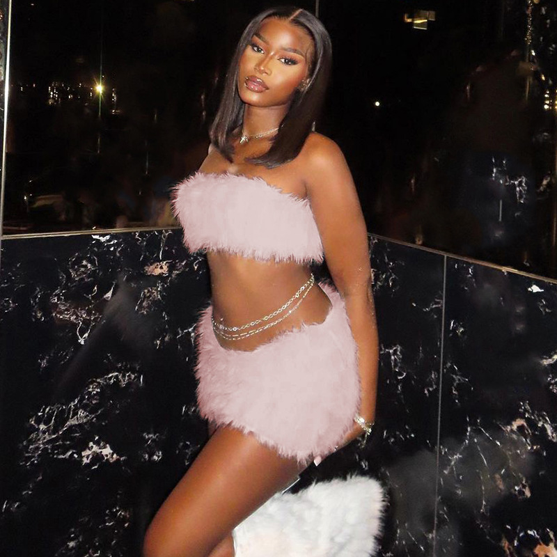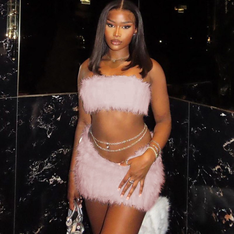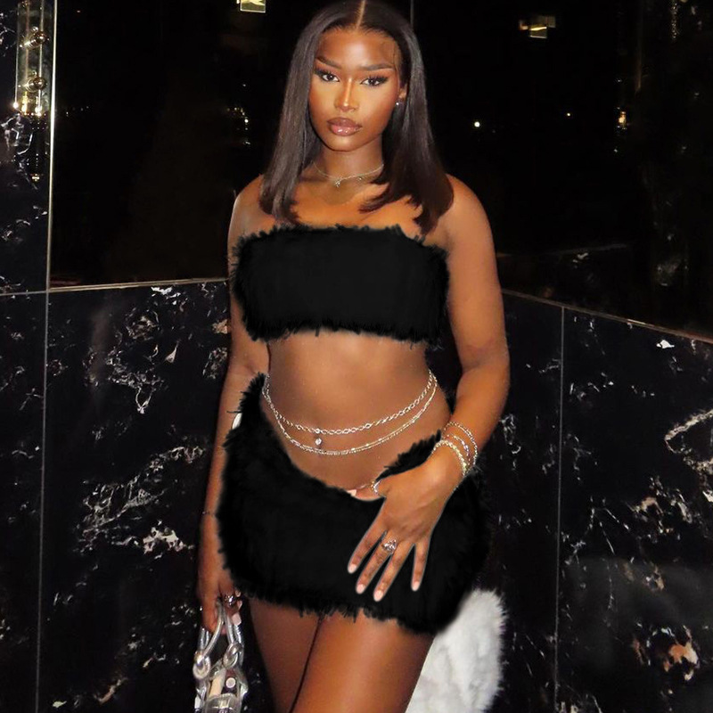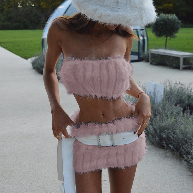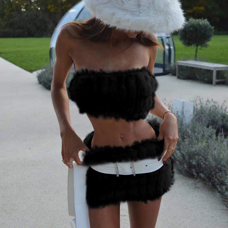 BKQU Furry Sexy Two Piece Set Women Strapless Vest Crop Top Bodycon Mini Skirts Elegant Outfits 2025 Party Clubwear Suits Y2K