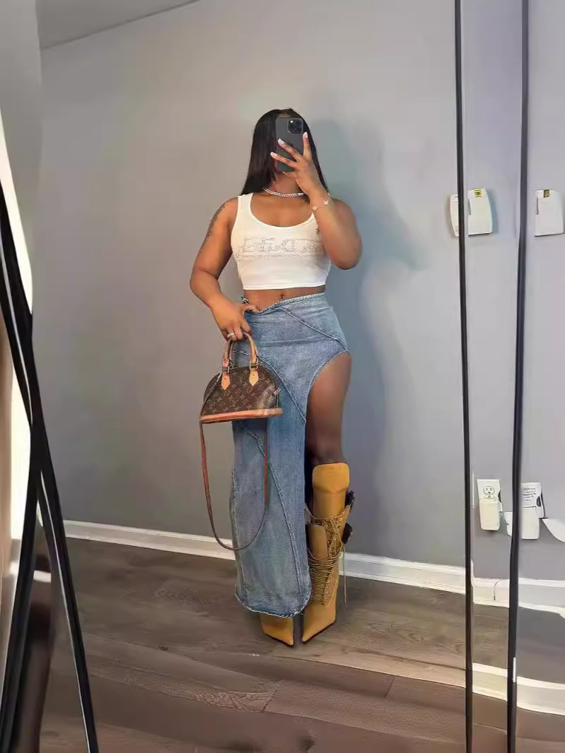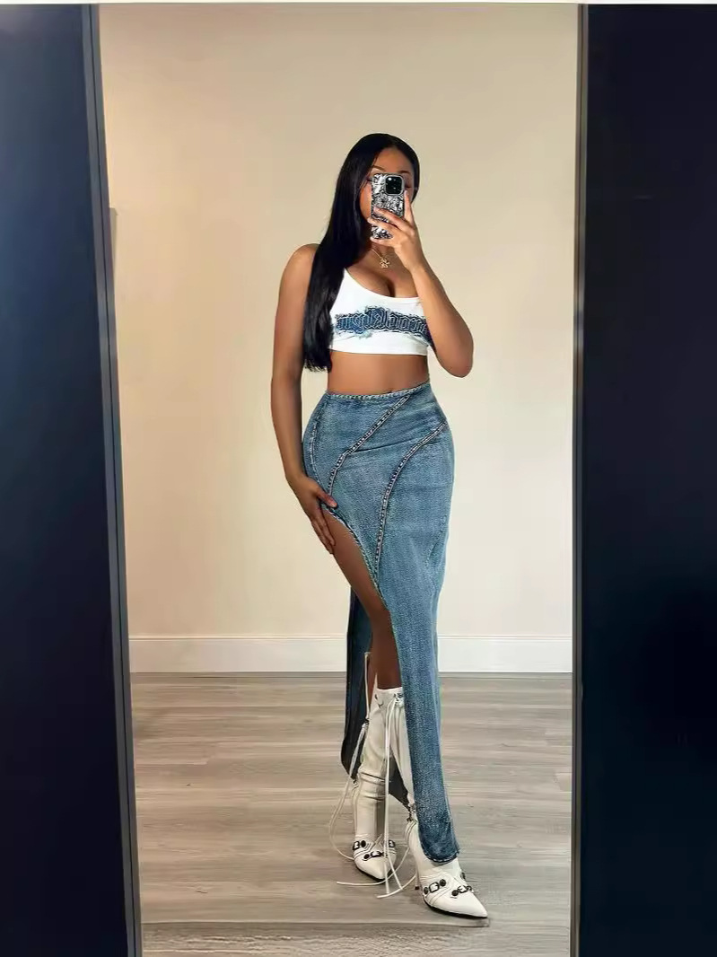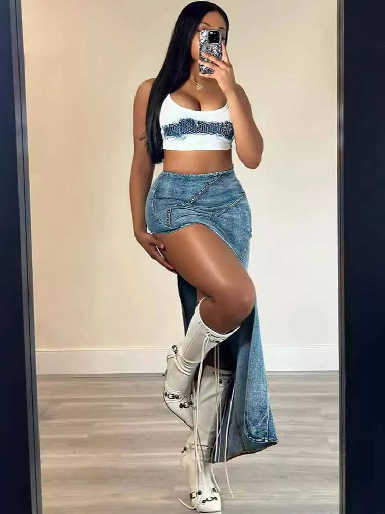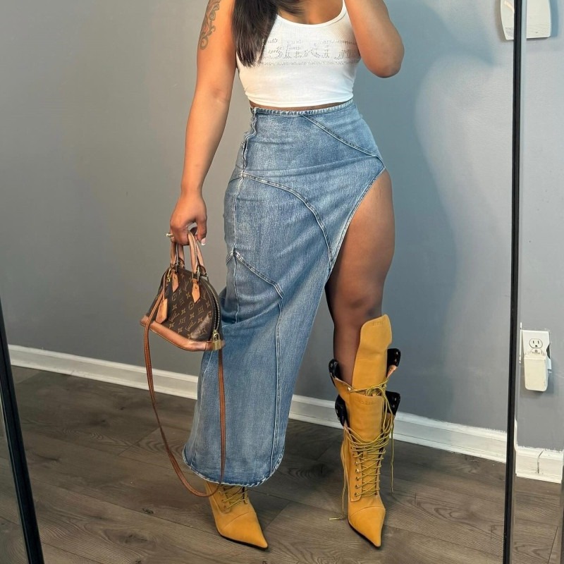 BKQU Irregular Sexy High Split Denim Skirt Women 2025 Summer Blue Fashion Bodycon Zipper Jean Long Skirt Vintage Hipster Bottoms