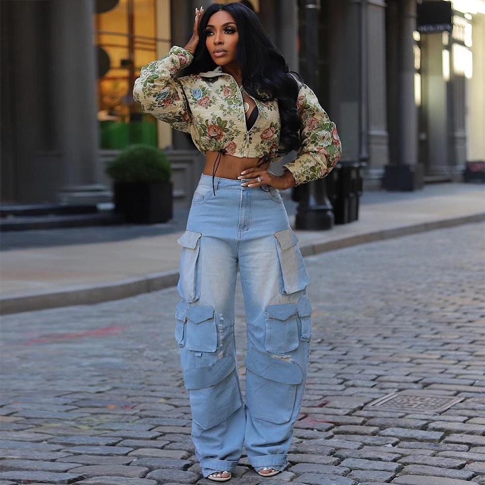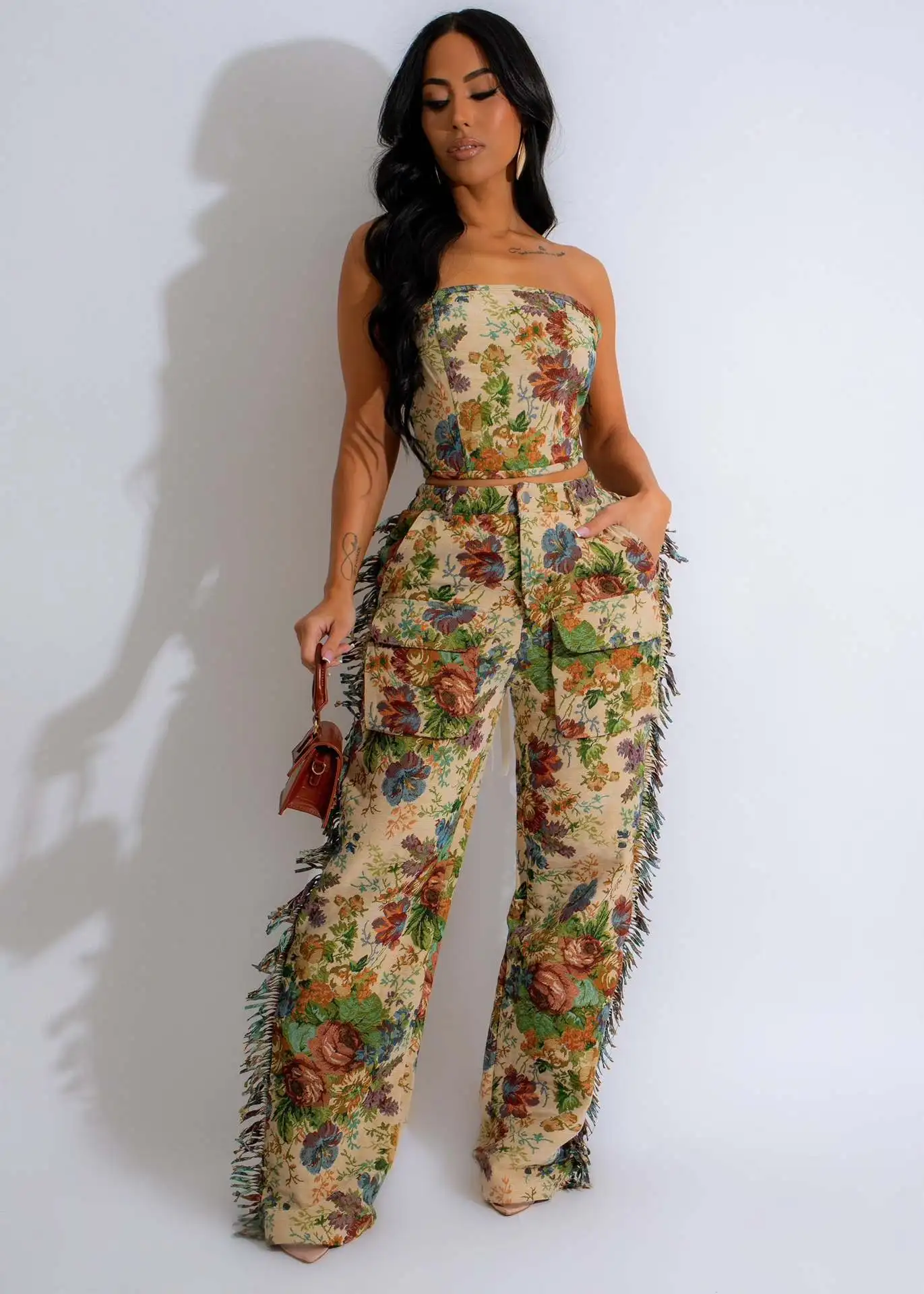 BKQU Jacquard Pants Set Women Sexy Strapless Lace Up Corset Crop Tops and Pocket Tassel Wide Leg Pants Two Piece Trousers Suits