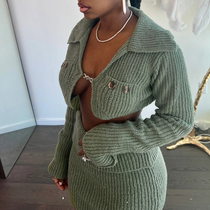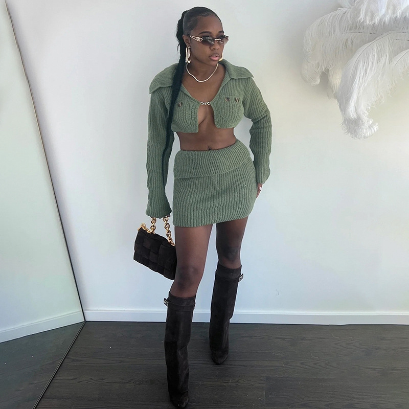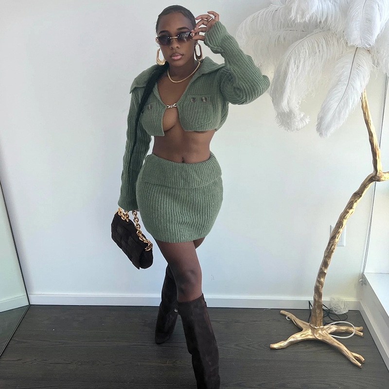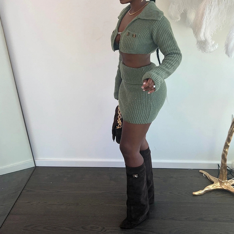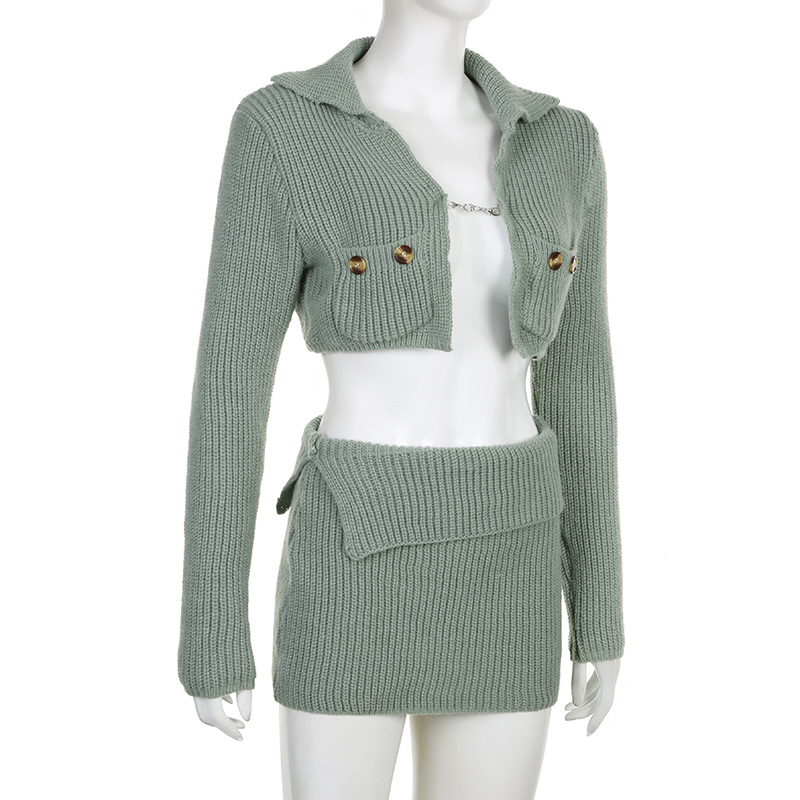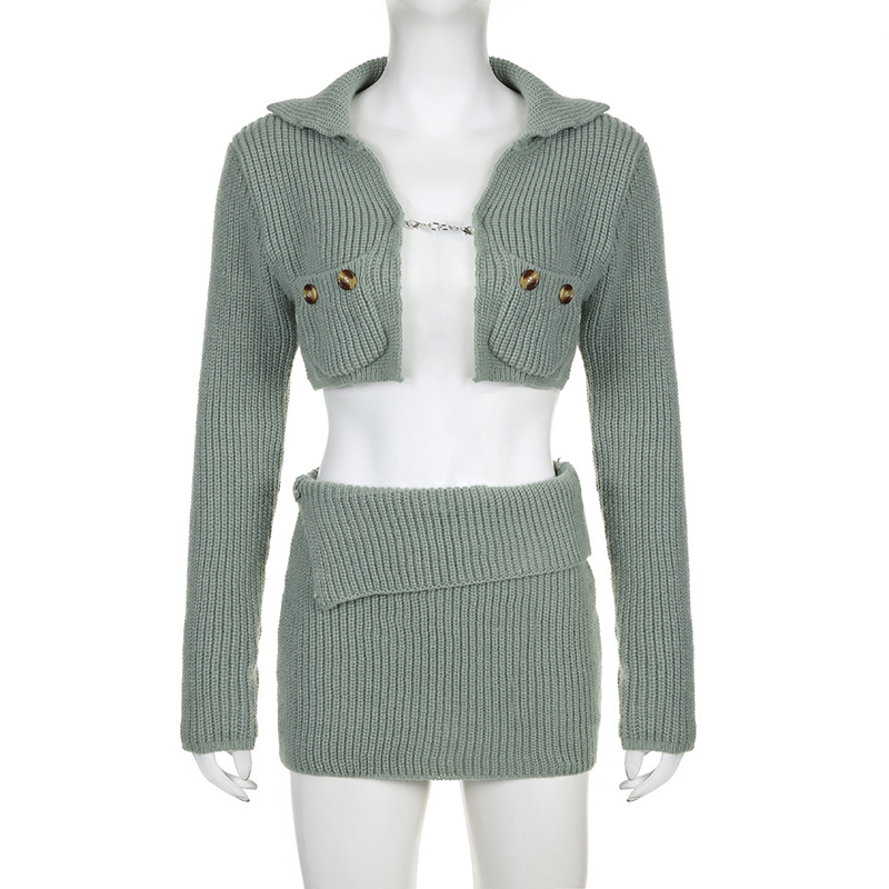 BKQU Knit Bodycon Mini Skirt 2 Piece Sets Women Sexy Chain Button Long Sleeve Cardigan Winter Elegant Party Sweater Skirt Suits