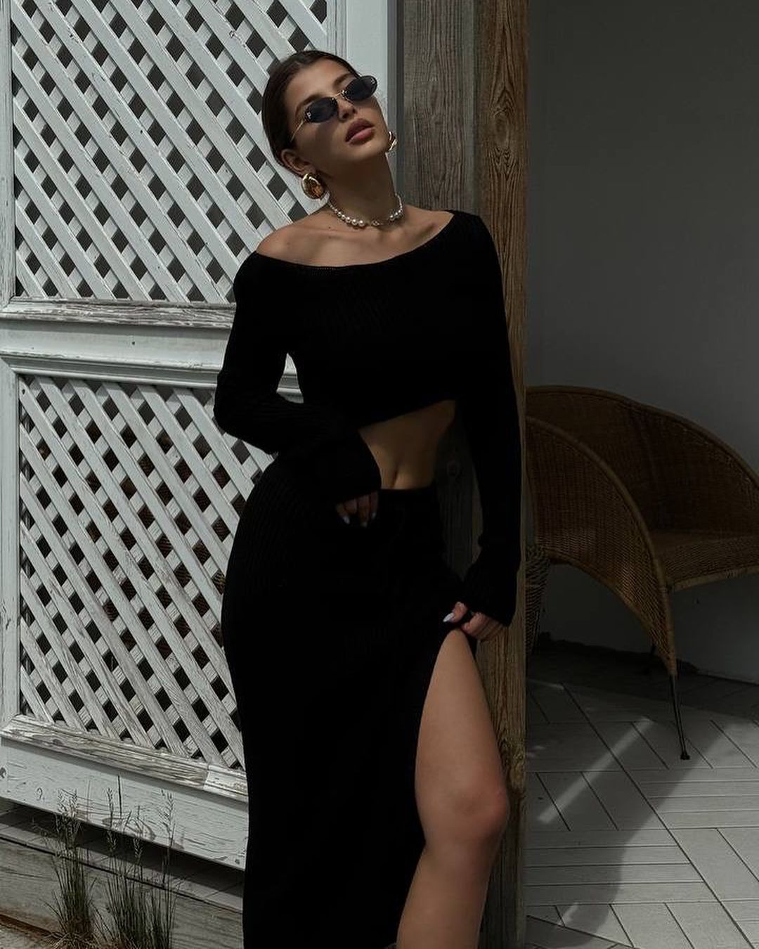 BKQU Knit Hollow Out Skirt 2 Piece Set Women Long Sleeve O-Neck Top Elegant Split Bodycon Maxi Skirt Set 2025 Lady Street Outfit