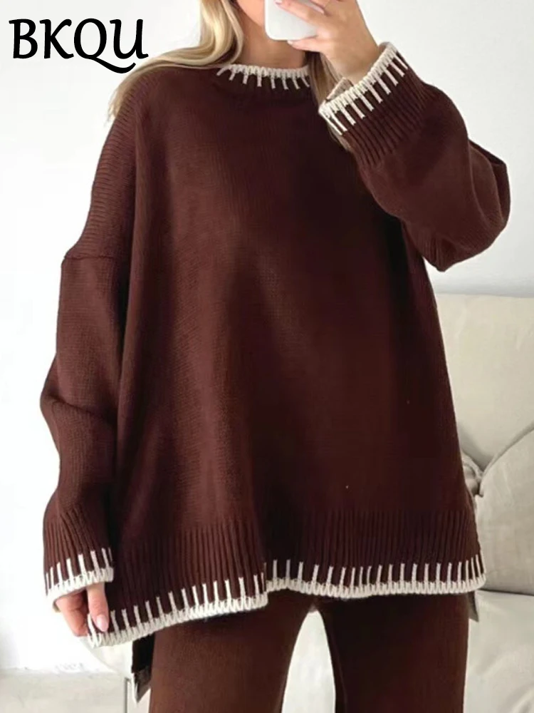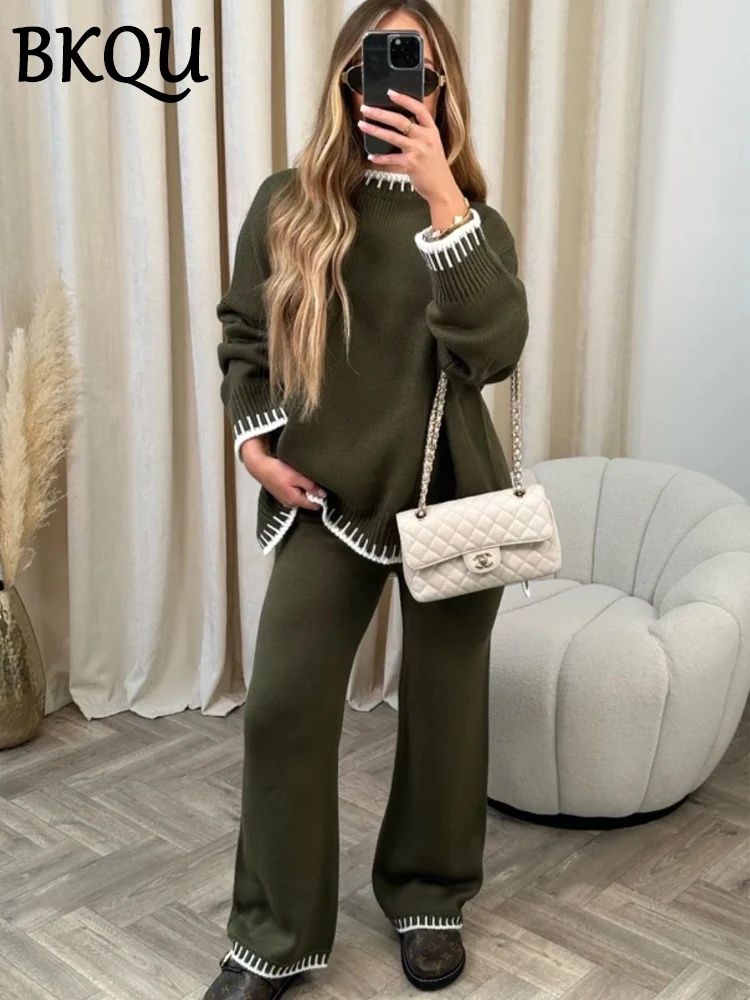 BKQU Knitted Pants Set Women Striped Two Piece Sets Clothes Side Split Sweater and Wide Leg Straight Pants Suit Casual Homewear