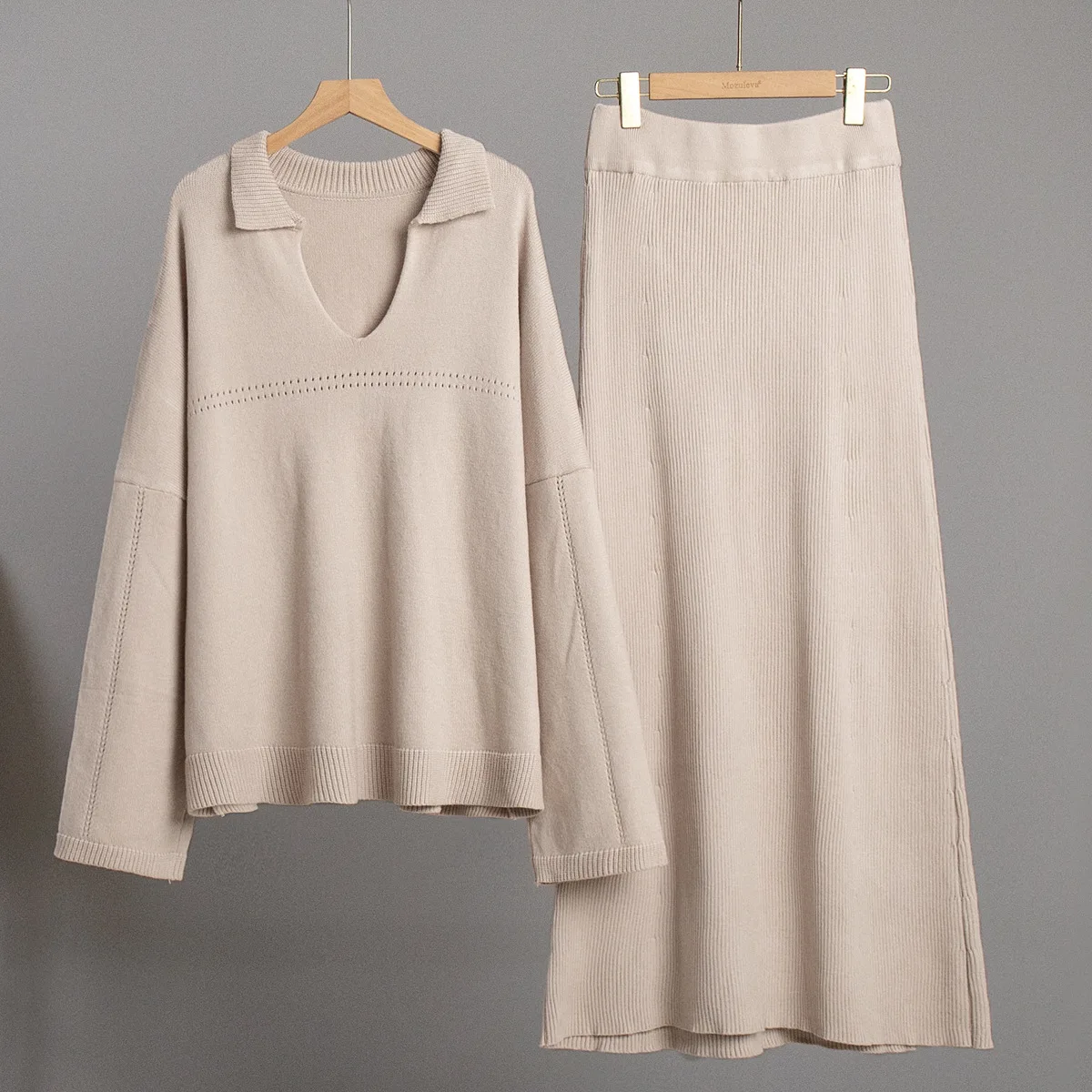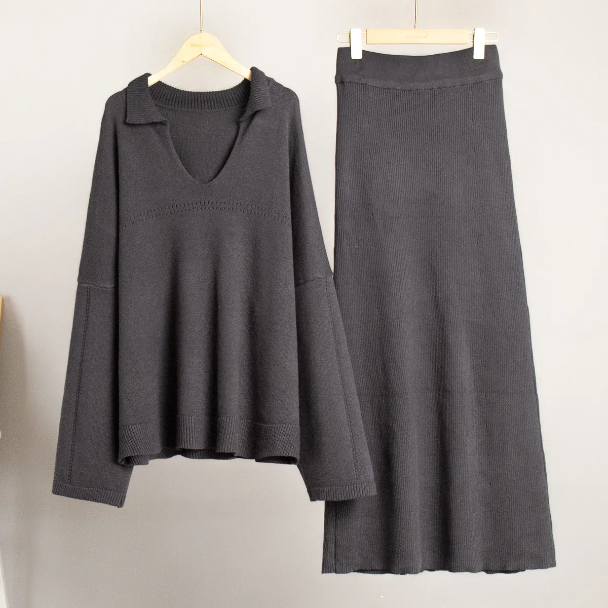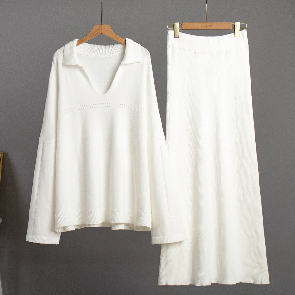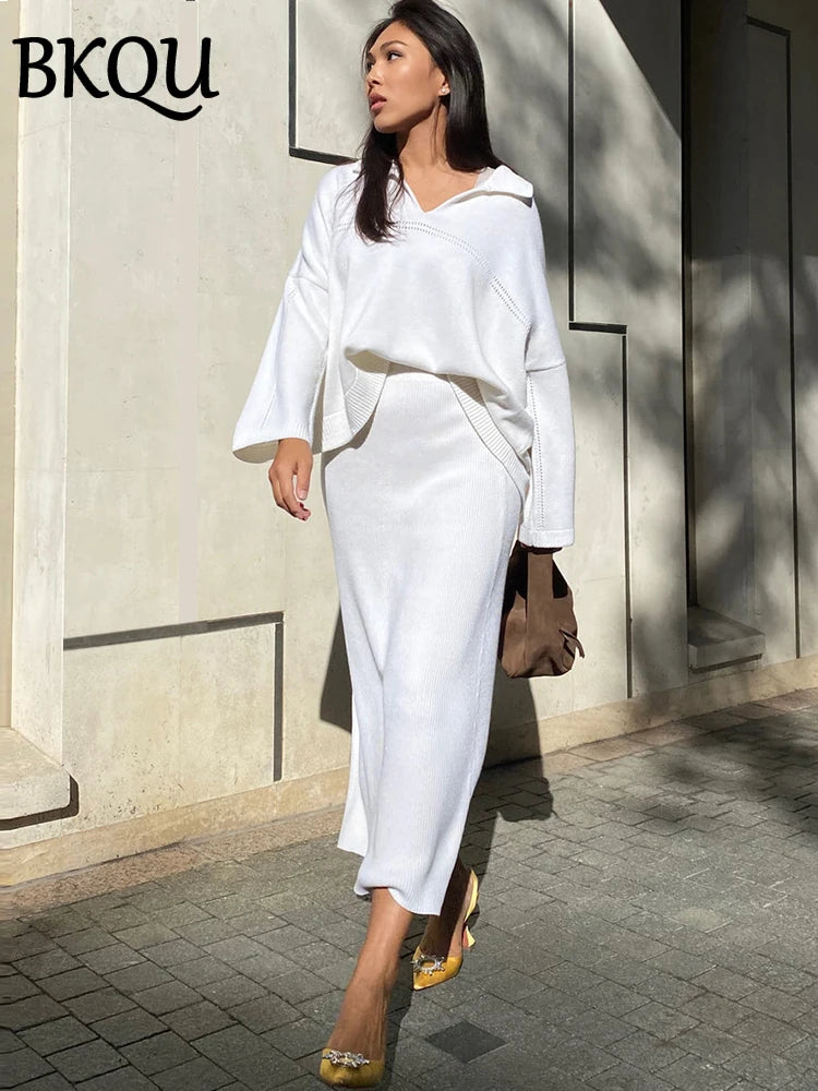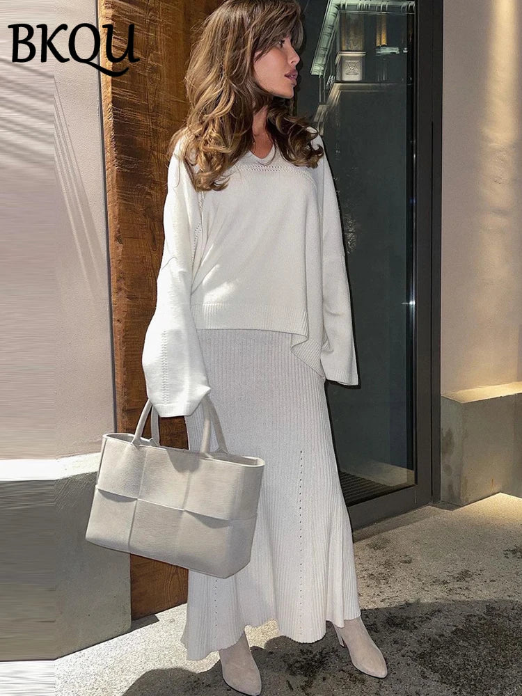 BKQU Knitted Sweater Skirt Two Pieces Set Women Autumn Winter V-neck Loose Pullover Sexy Long Skirts Suits Elegant Party Outfits