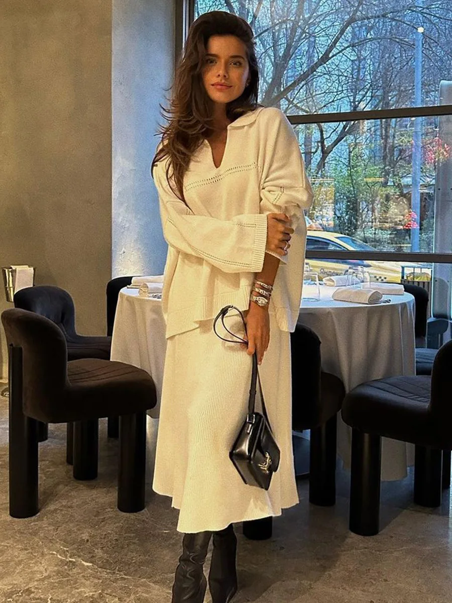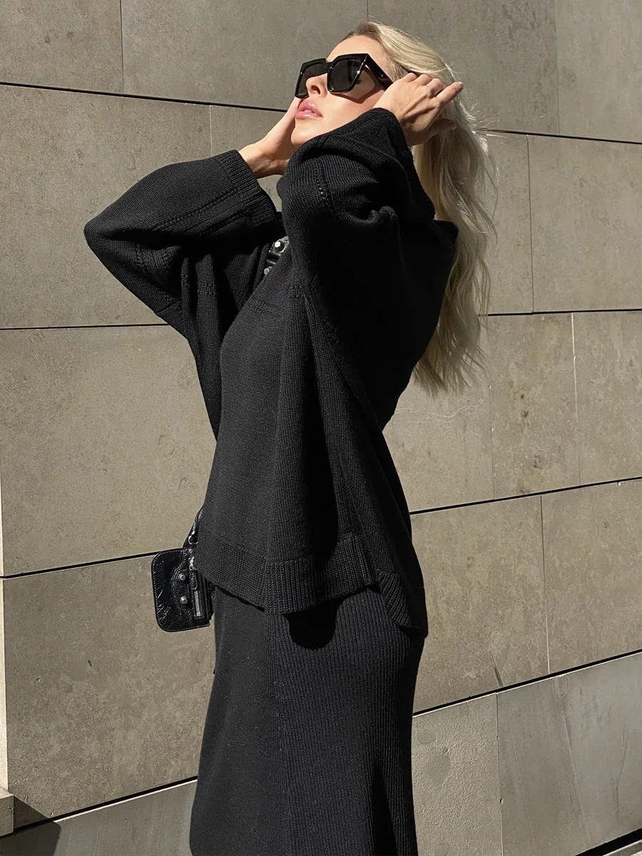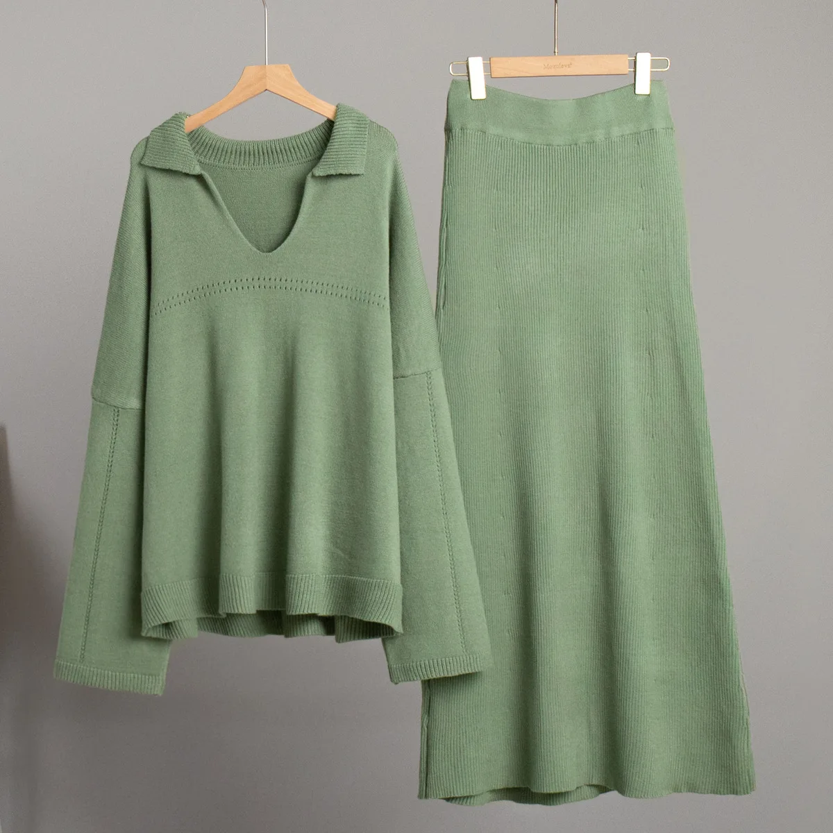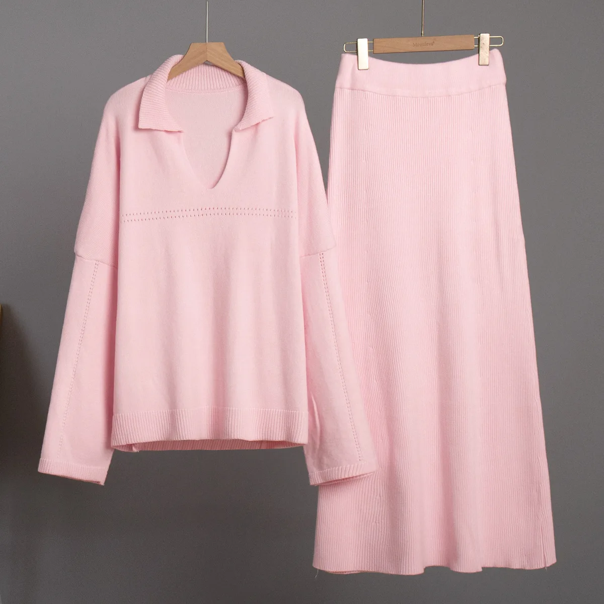 BKQU Knitted Sweater Skirt Two Pieces Set Women Autumn Winter V-neck Loose Pullover Sexy Long Skirts Suits Elegant Party Outfits
