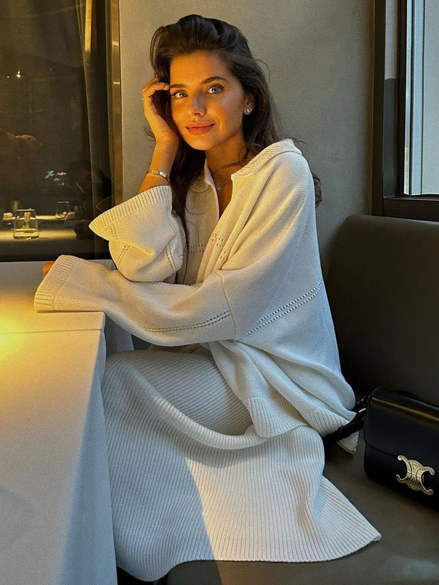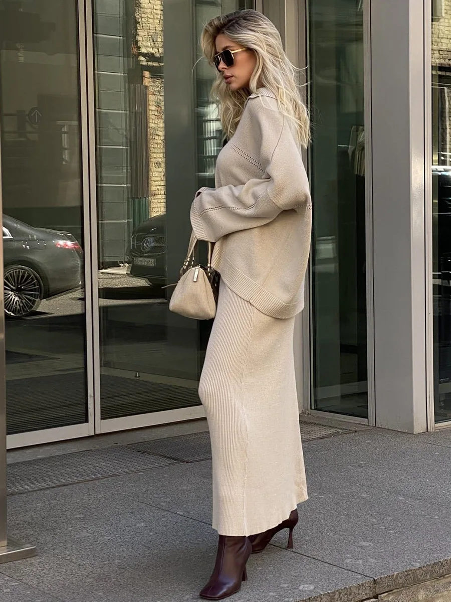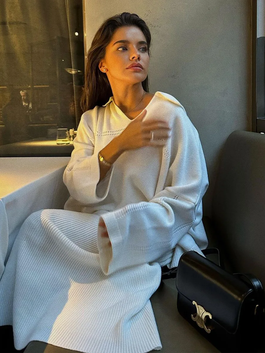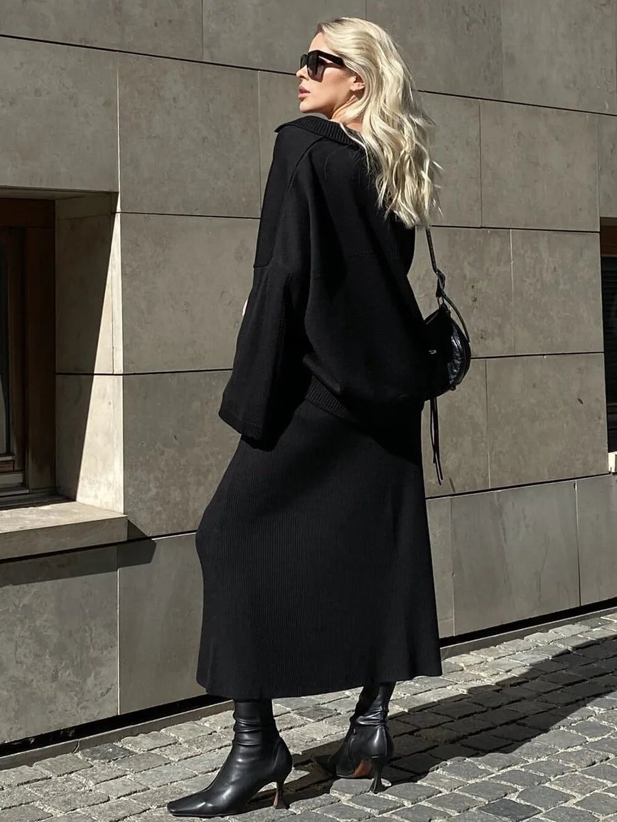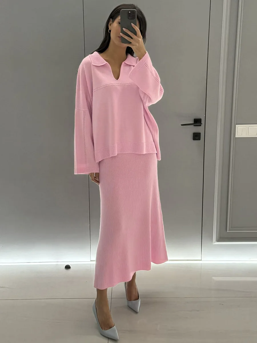 BKQU Knitted Sweater Skirt Two Pieces Set Women Autumn Winter V-neck Loose Pullover Sexy Long Skirts Suits Elegant Party Outfits
