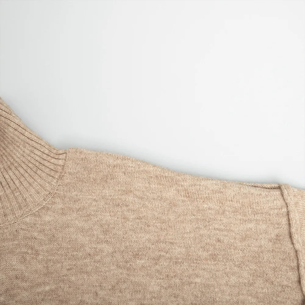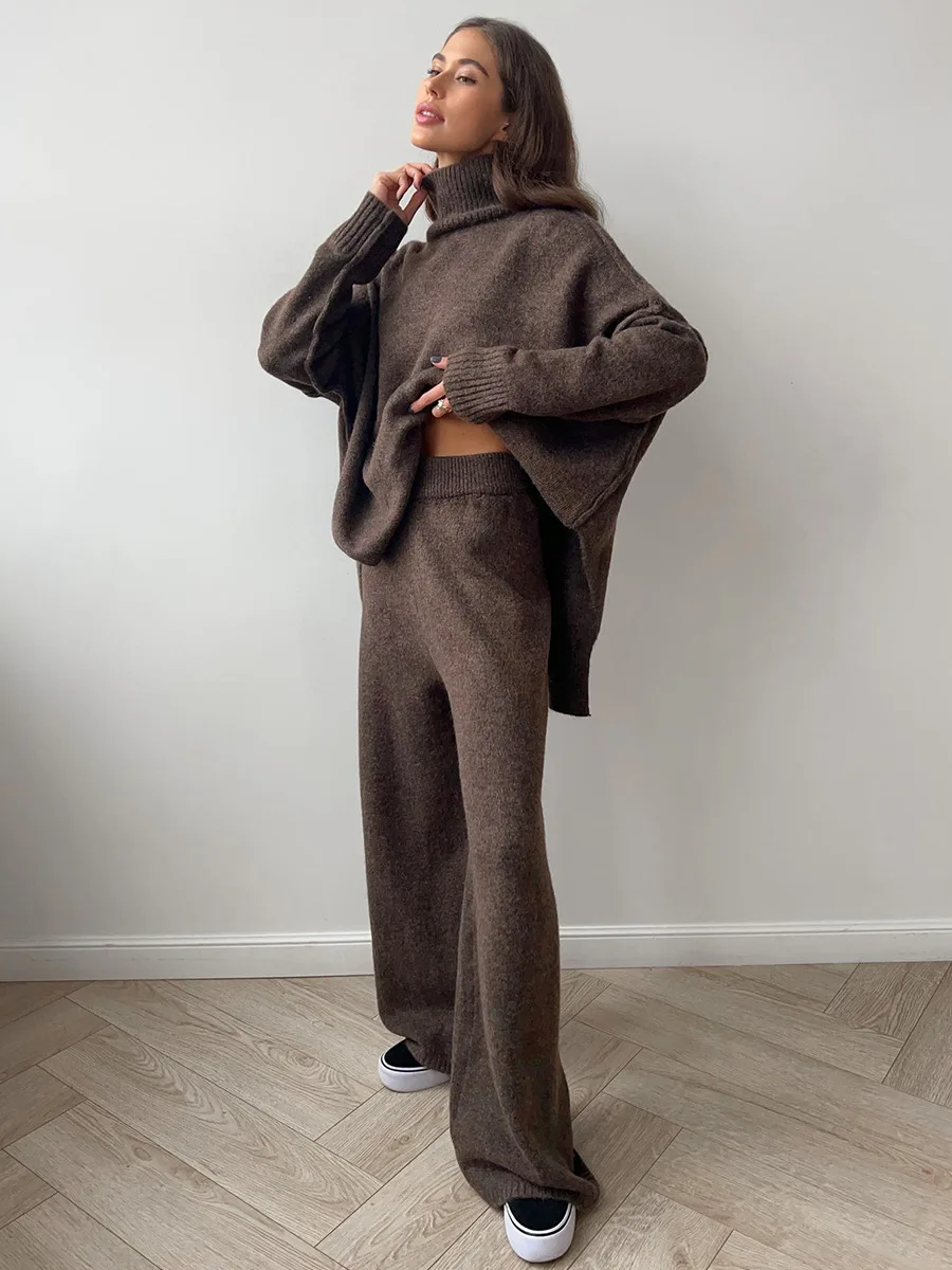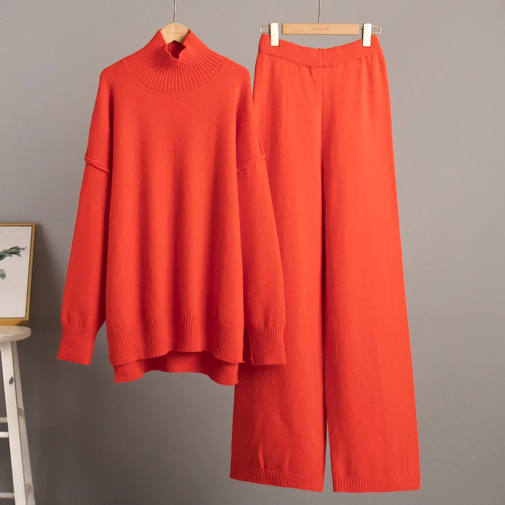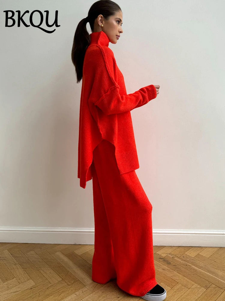 BKQU Knitted Sweater Two Piece Pants Set for Women Loose Warm Turtleneck Pullover and Straight Wide Leg Pants Matching Suit