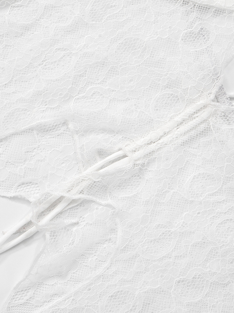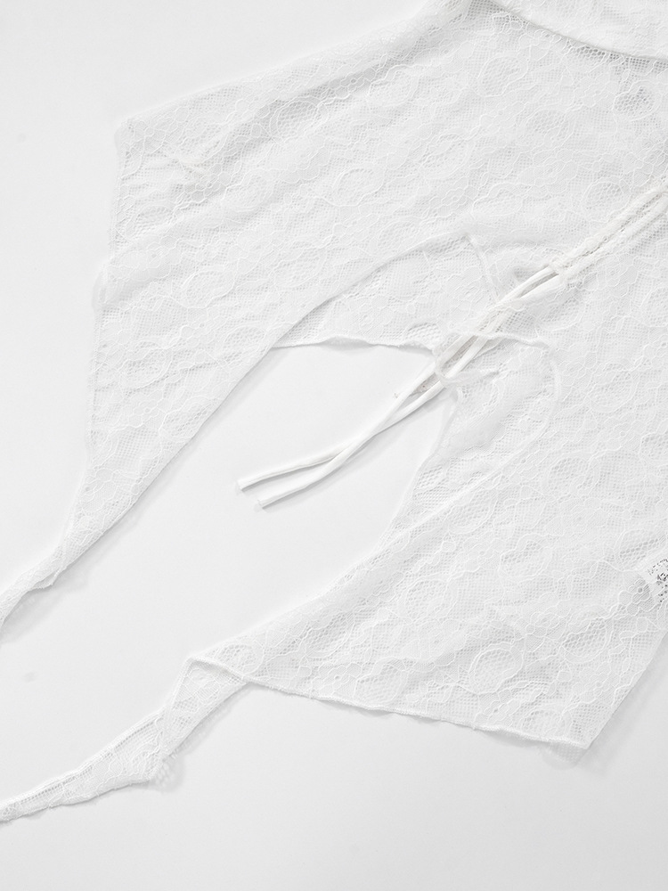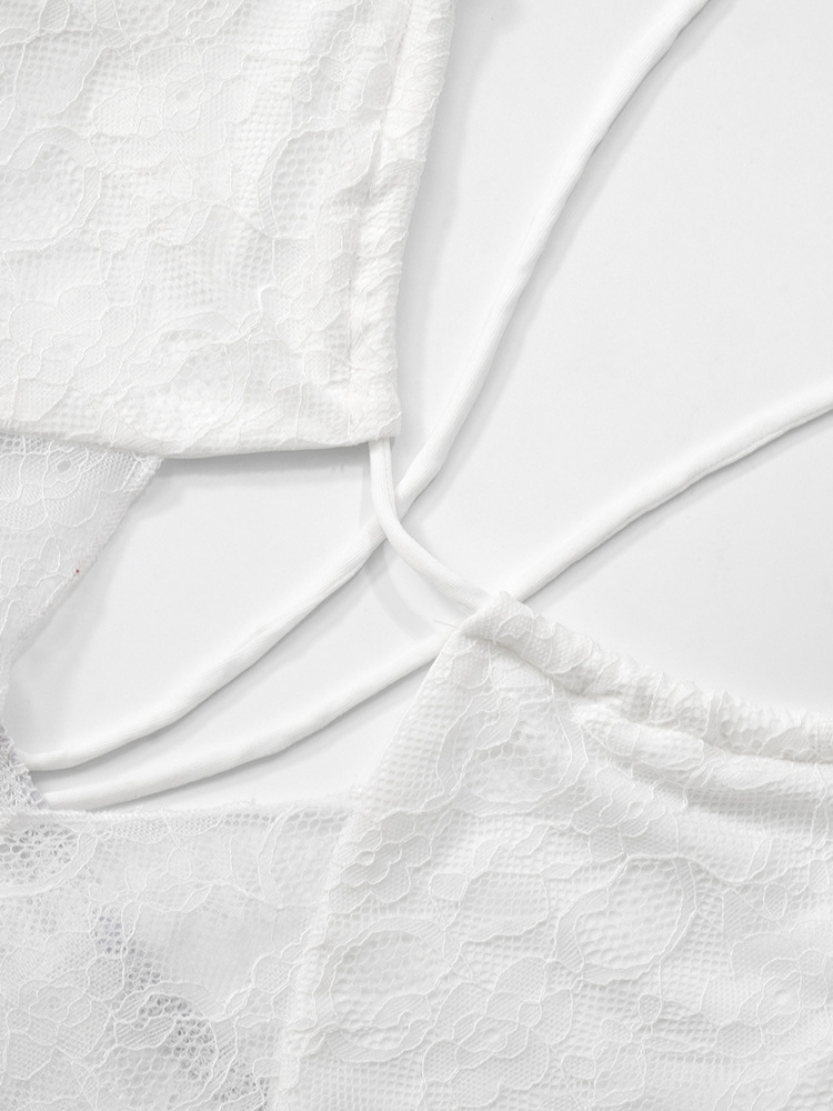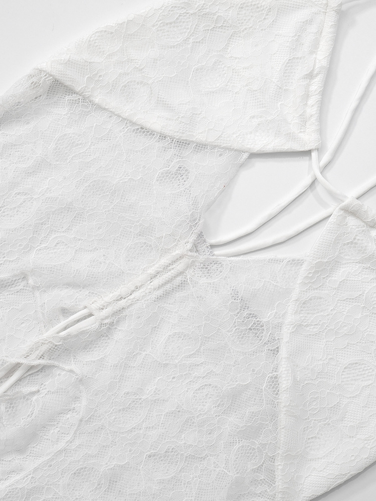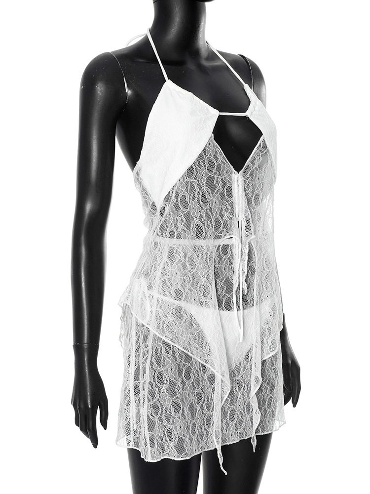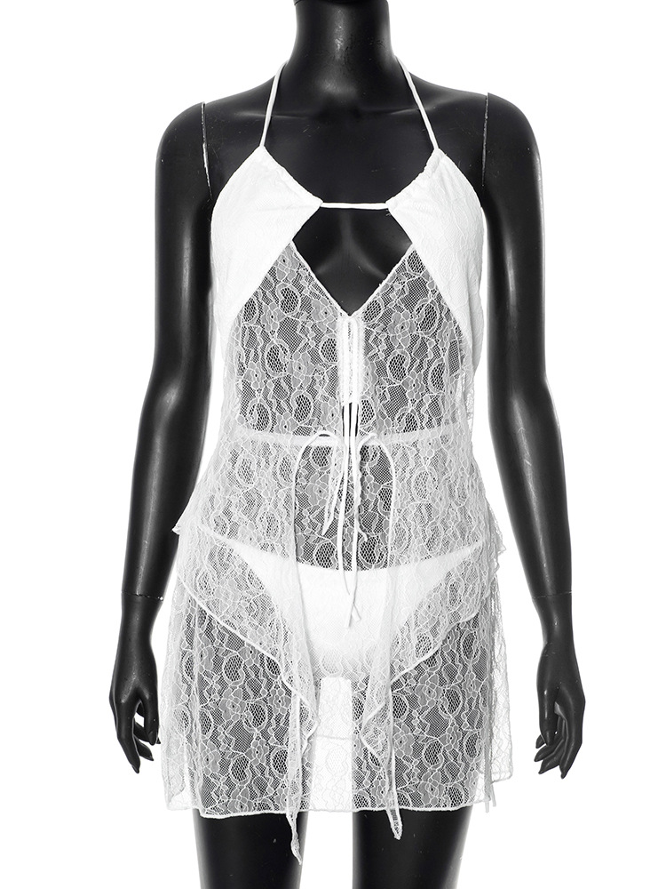 BKQU Lace See-Through 3 Piece Set Women Sexy Hollow Out Beach Outfits Lace-Up Backless Irregular Top And Mini Skirt Vacation Set