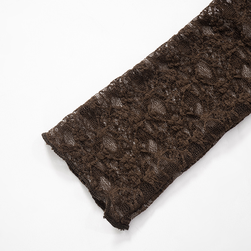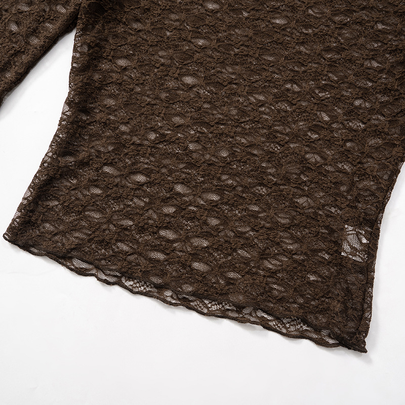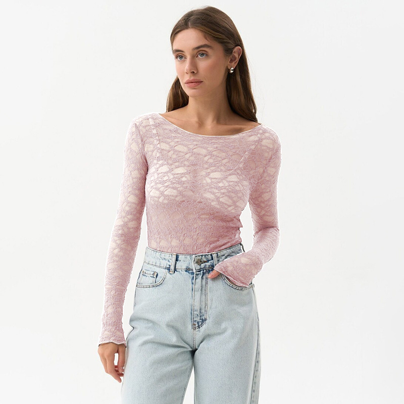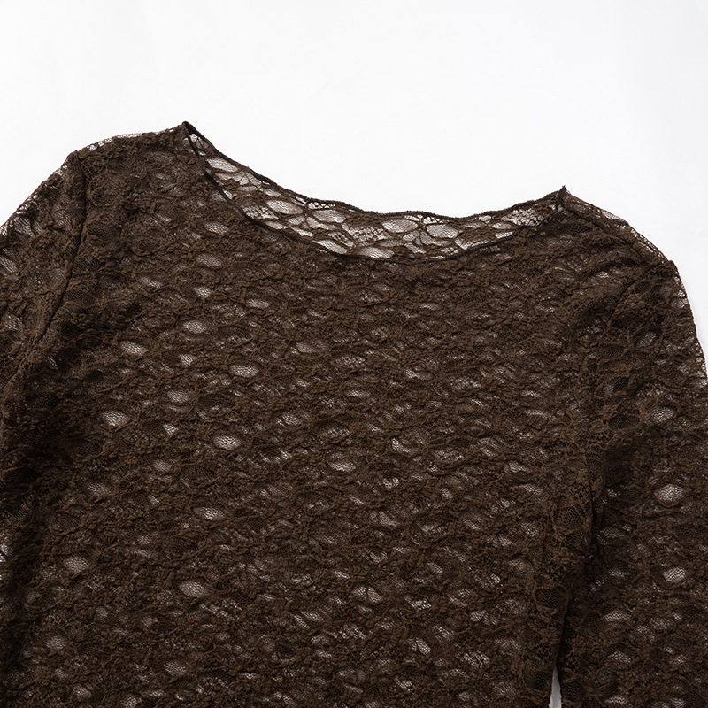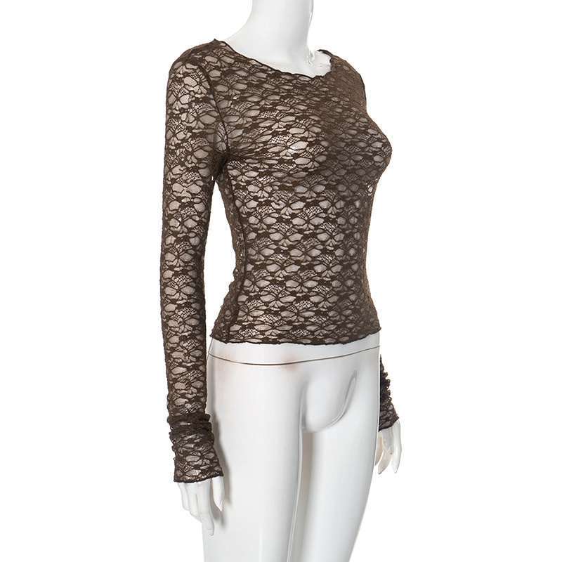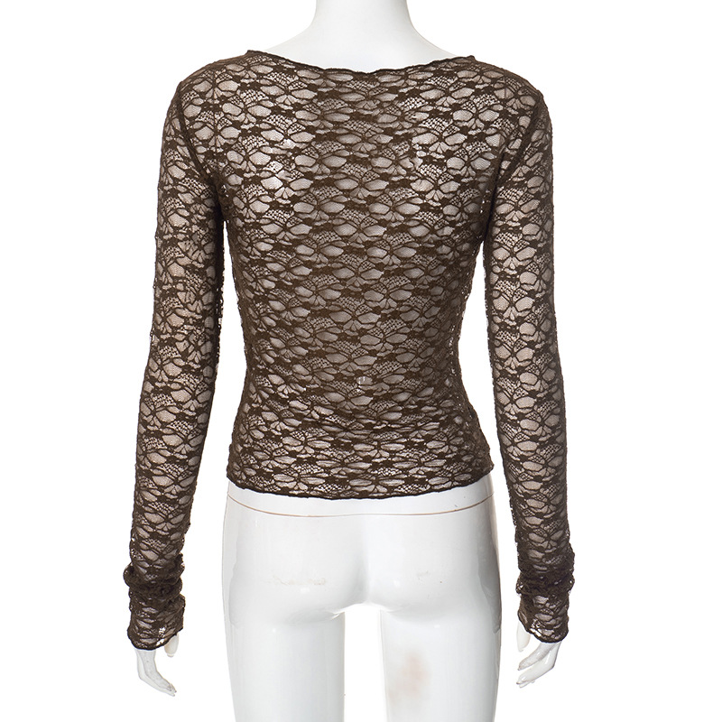 BKQU Lace See-Through Crop Tops Women Sexy Long Sleeve O-neck Slim T Shirt Elegant Hollow Out Sheer Y2K Lady Streetwear Tops New