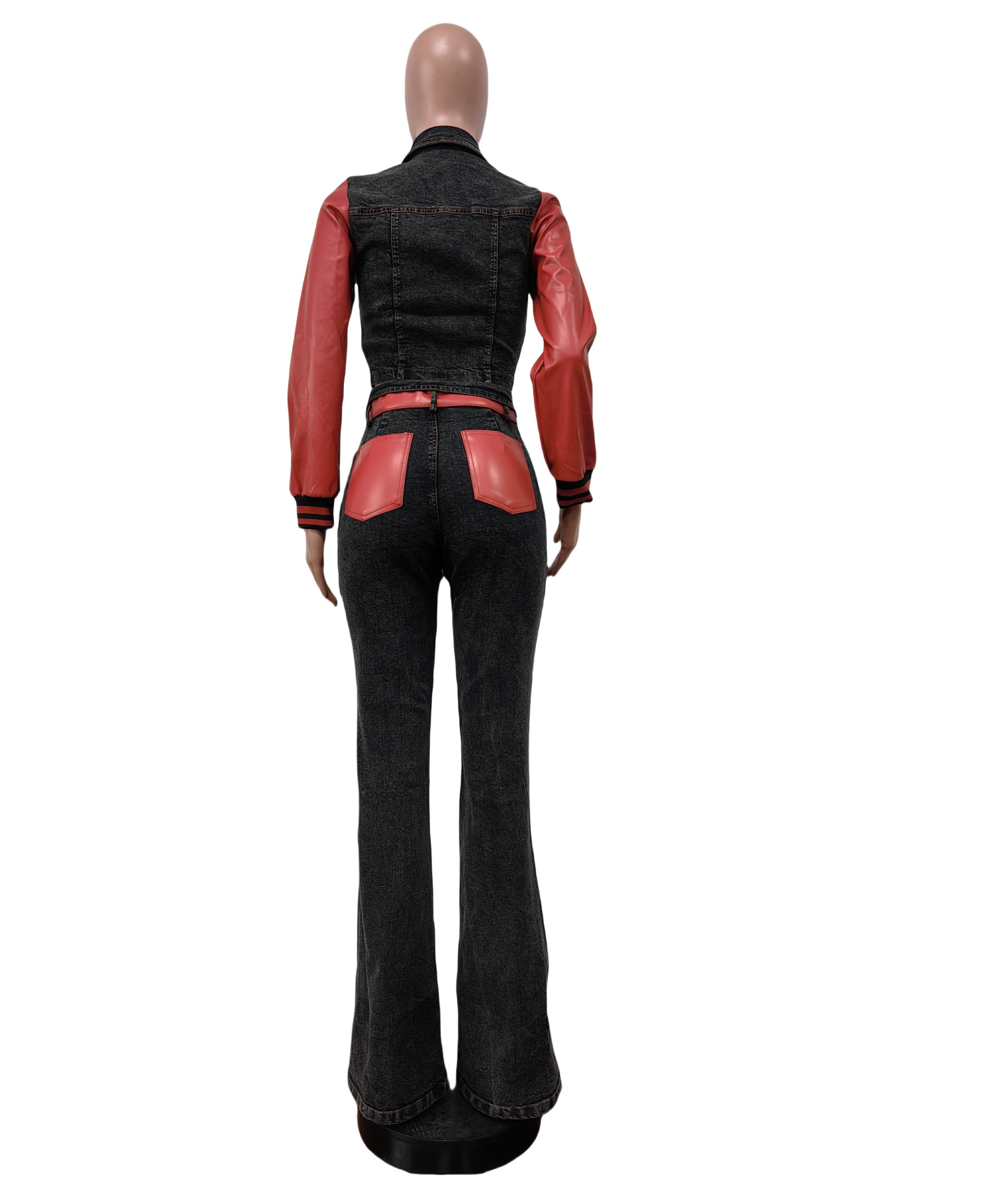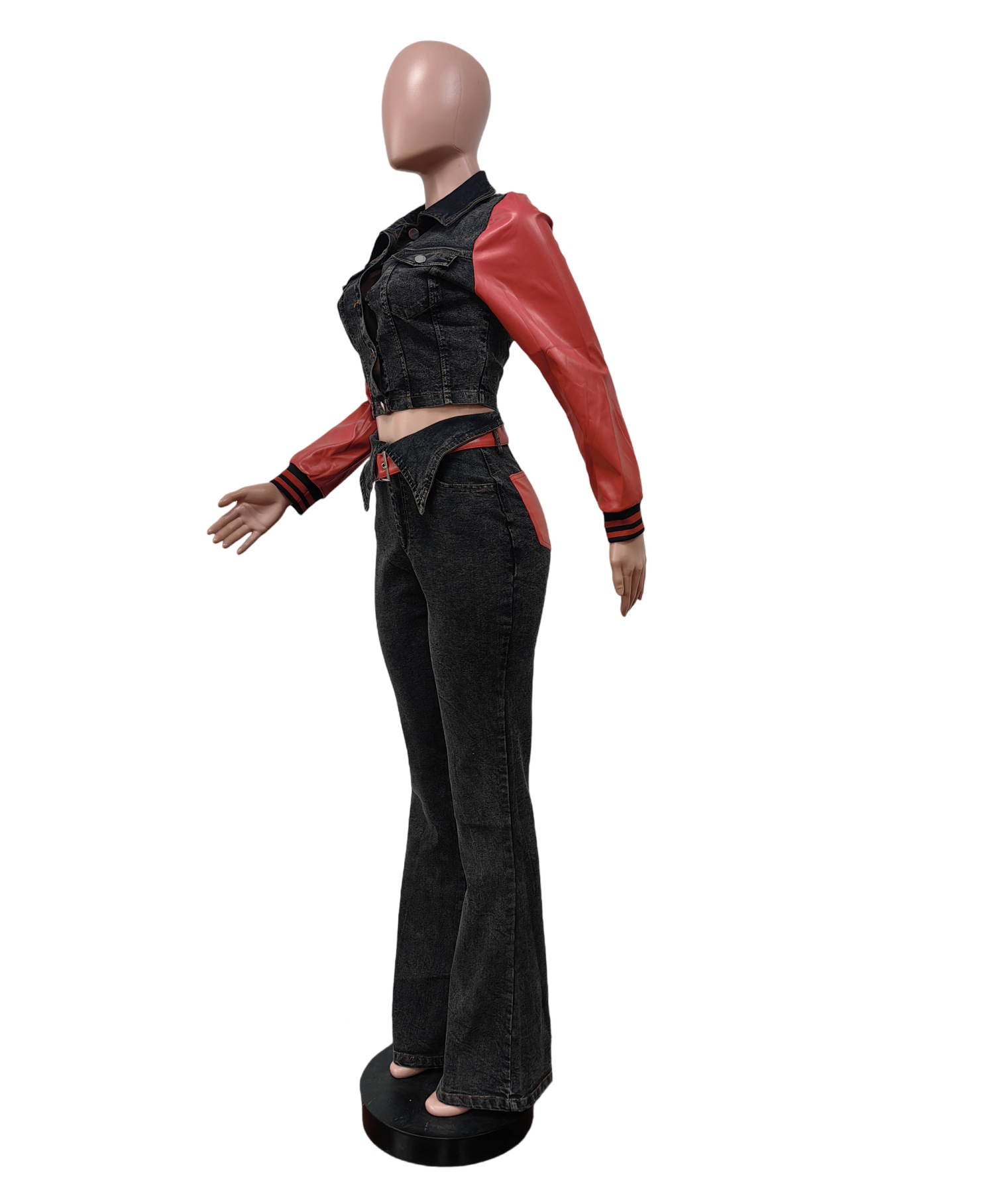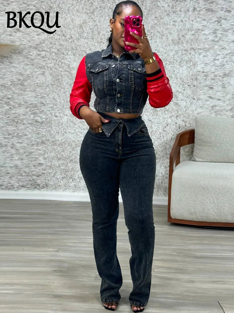 BKQU Leather Patchwork Stretch Denim Jacket Pants 2 Piece Set Women Trendy Buttons Crop Top High Waist Flare Jeans Suits 2025