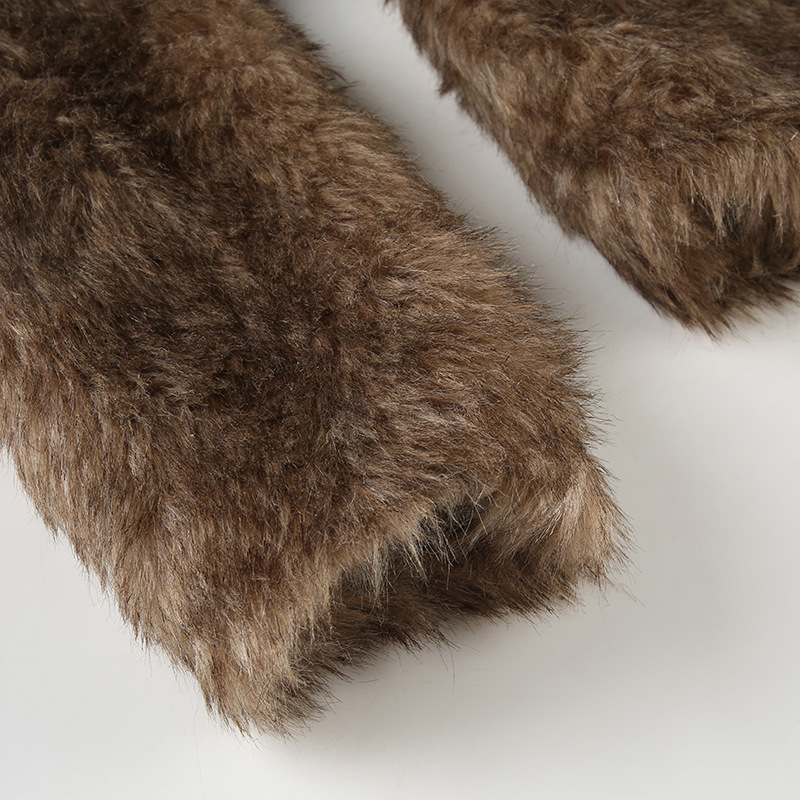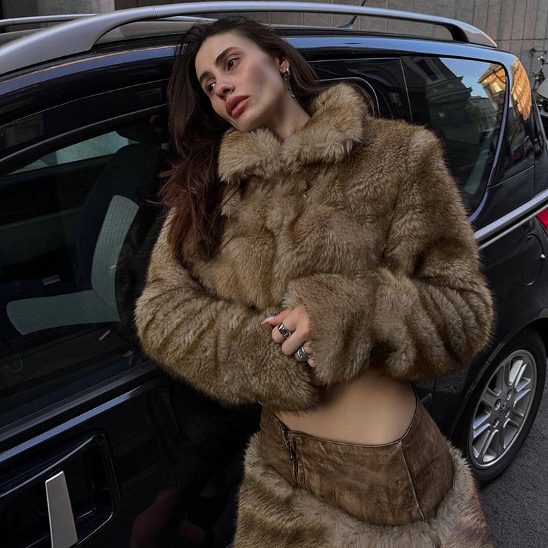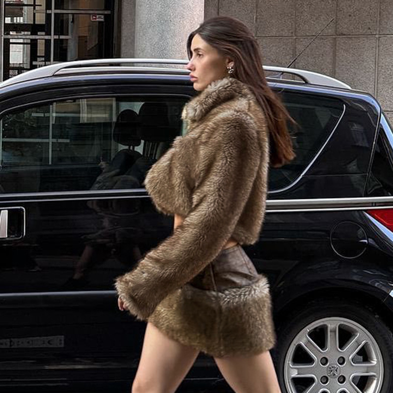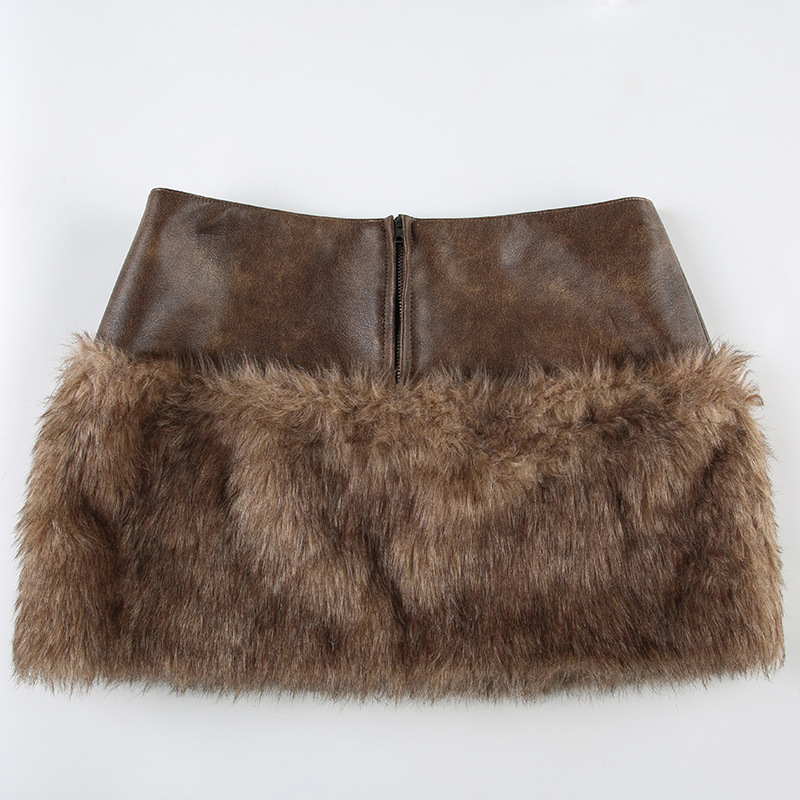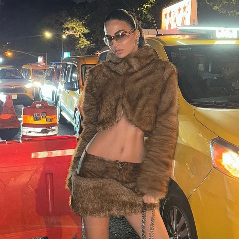 BKQU Leather Splicing Faux Fur 2 Piece Sets Women Autumn Winter Fluffy Warm Lapel Full Sleeve Crop Jacket Low Waist Mini Skirts