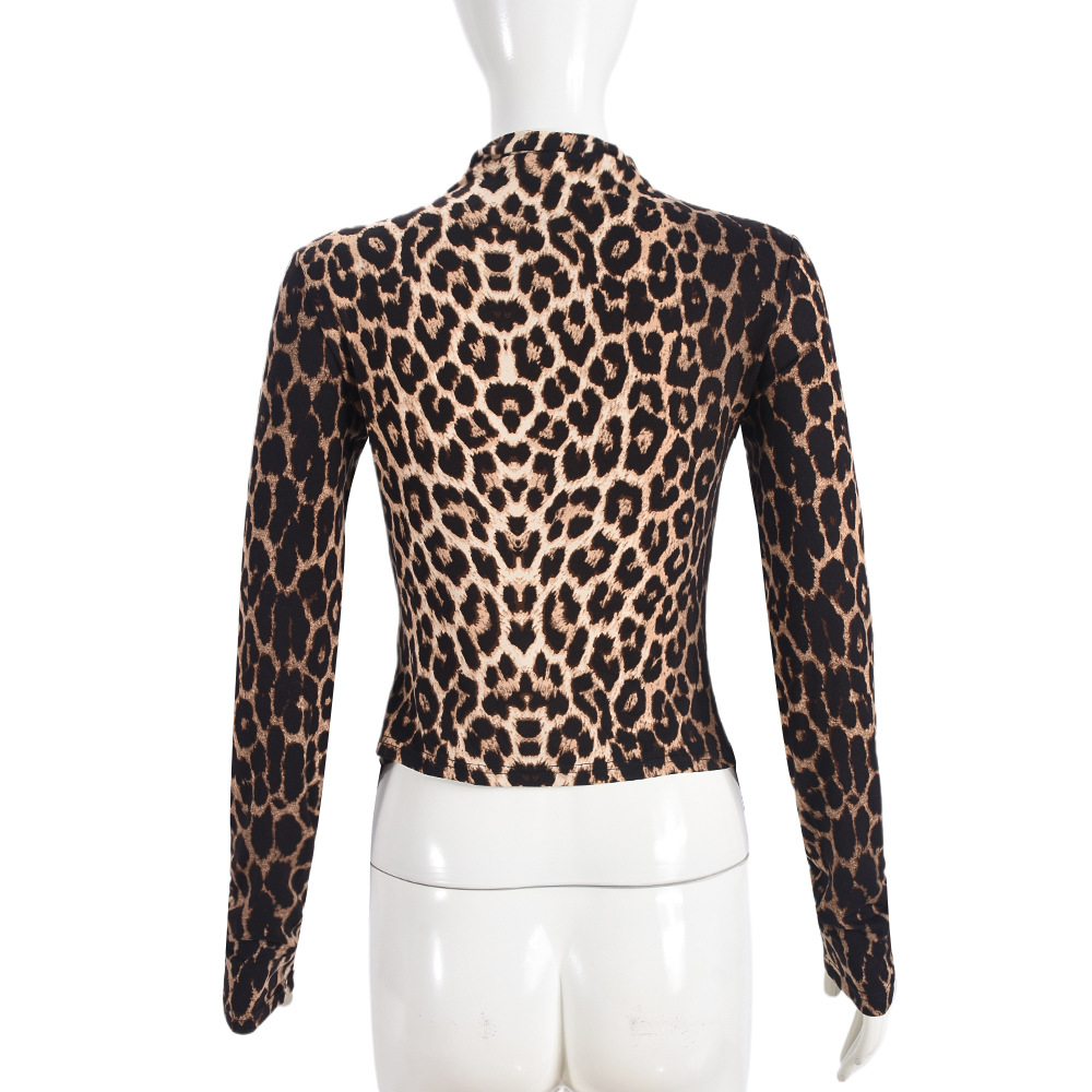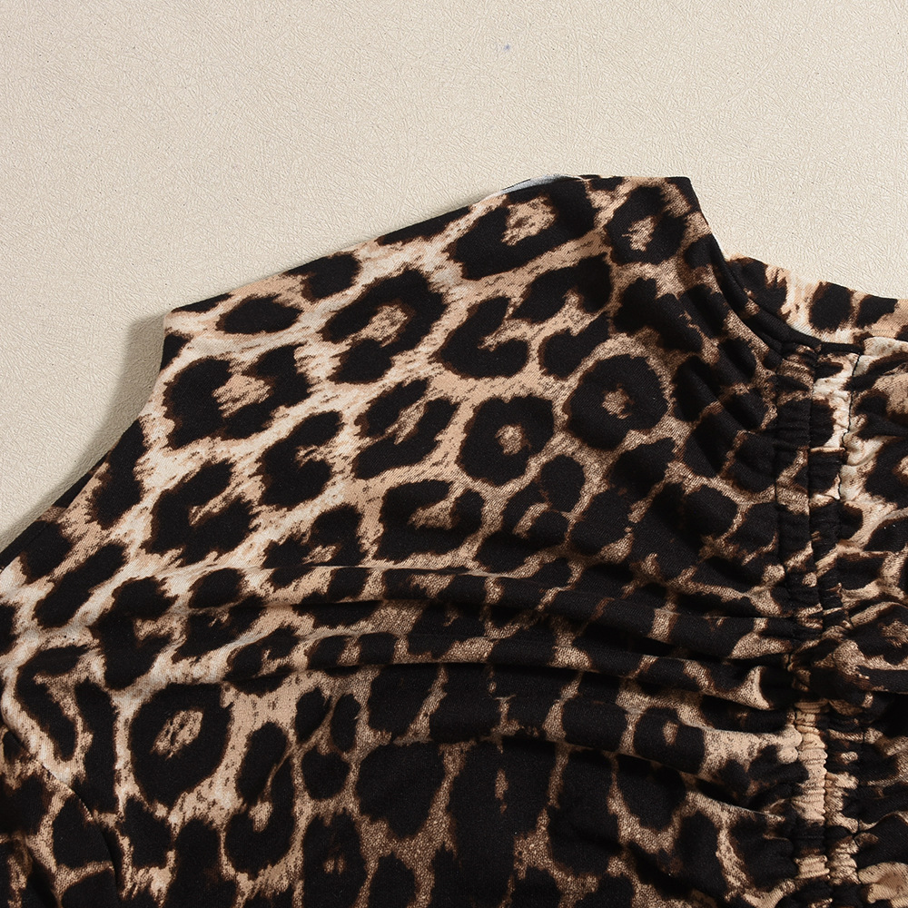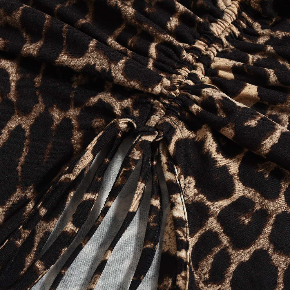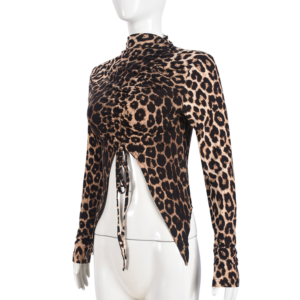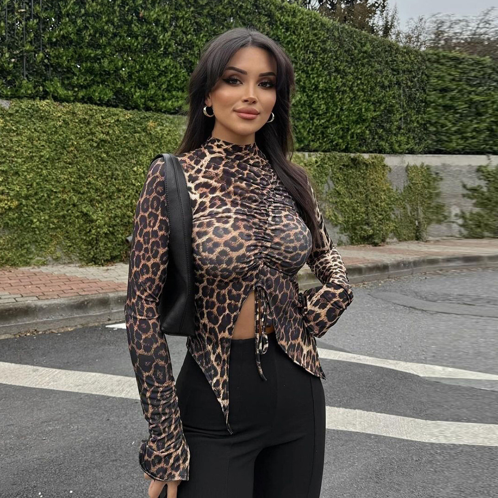 BKQU Leopard Drawstring Print Long Sleeve T-shirt Women Elastic Sexy Ruched O Neck Split Crop Top Female Y2k Club Irregular Tees