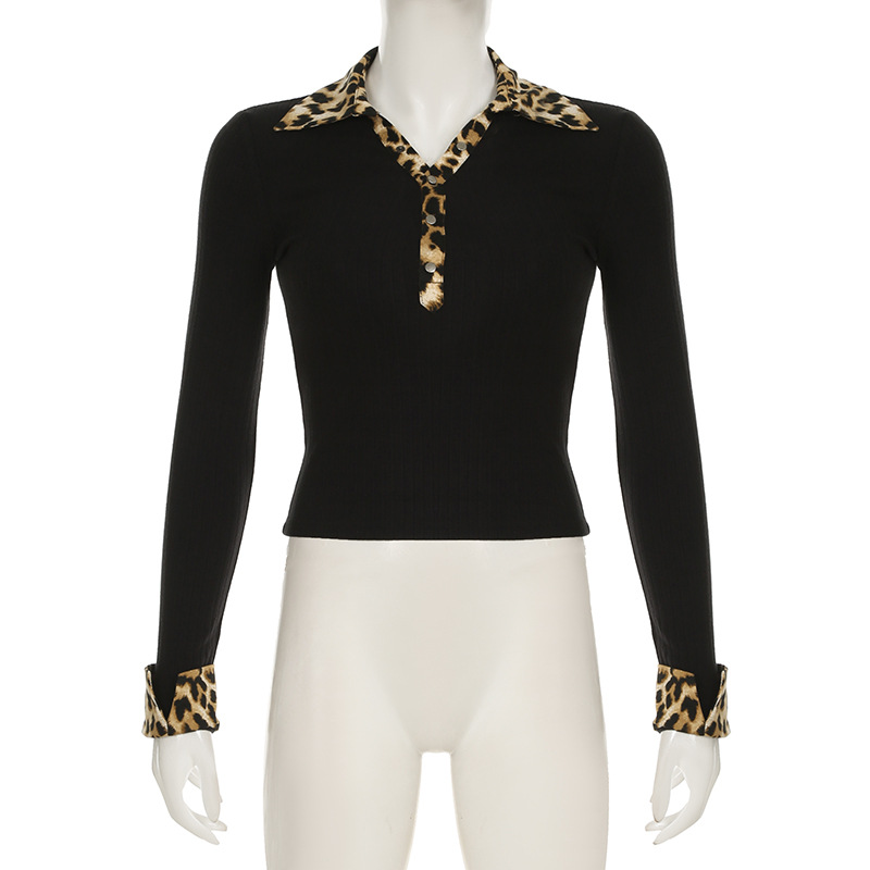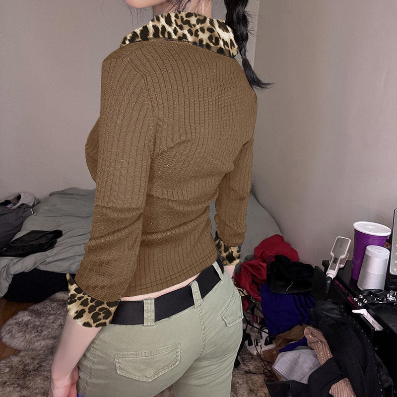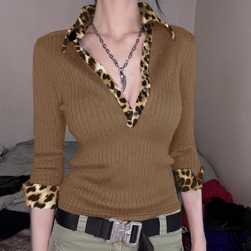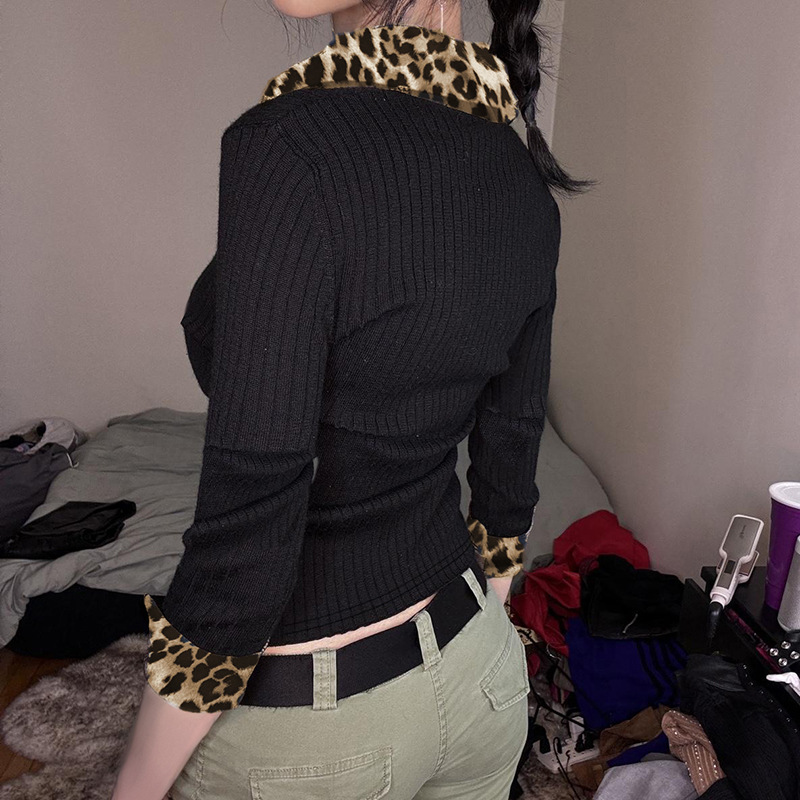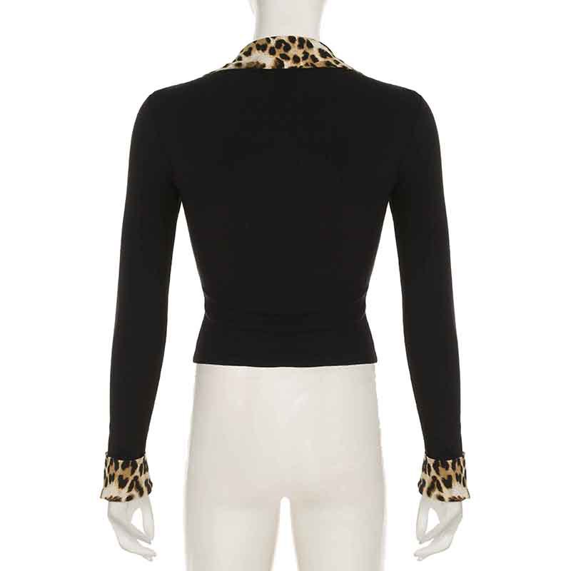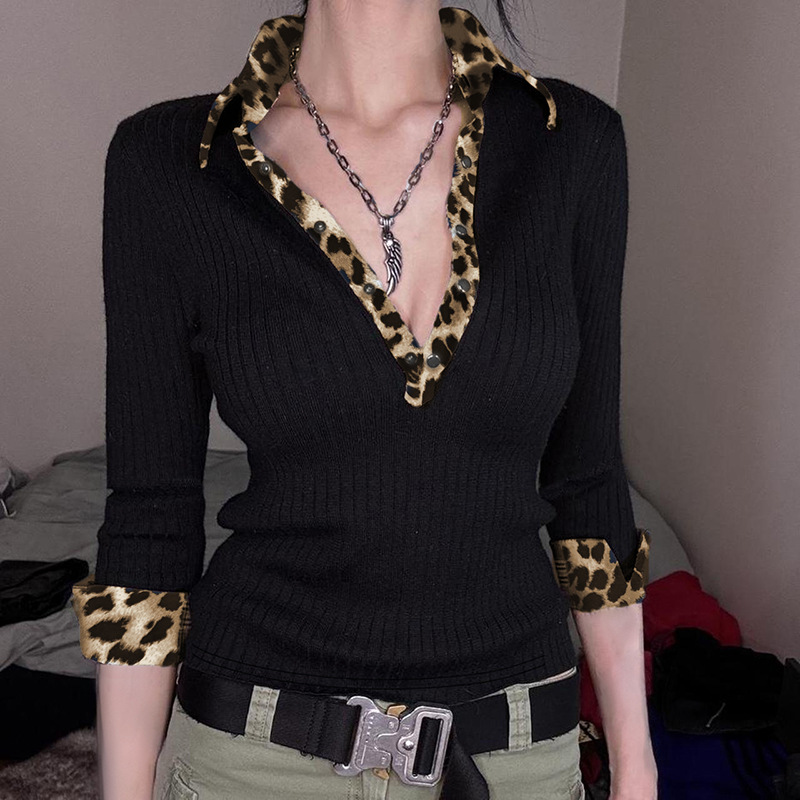 BKQU Leopard Patchwork V Neck Knitted Top Women Autumn Winter Long Sleeve Buttons Slim Crop T-shirt Aesthetic Y2k Streetwear