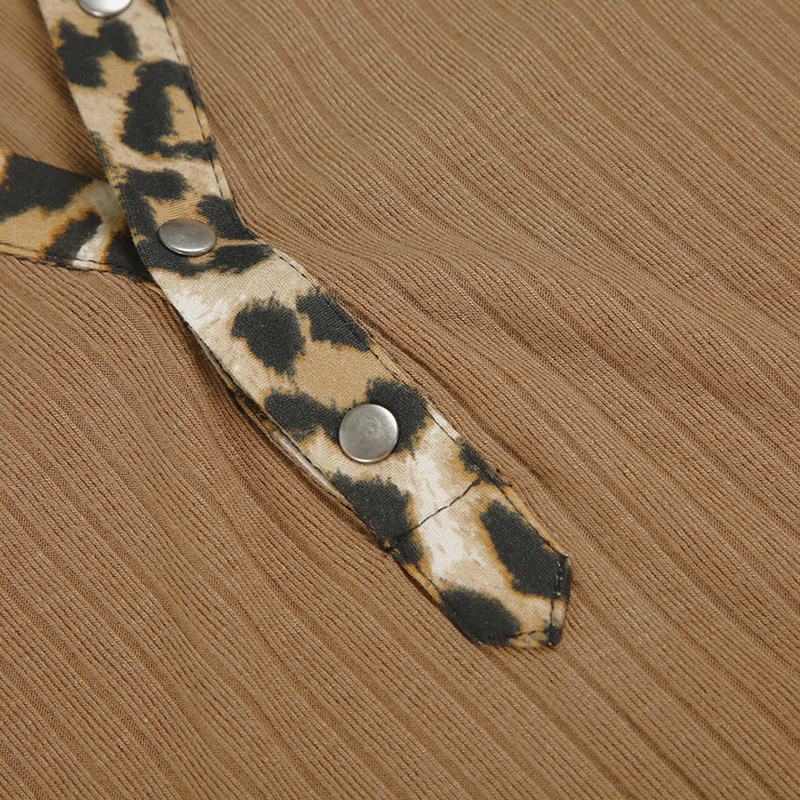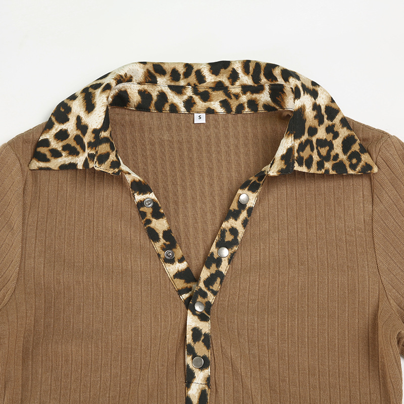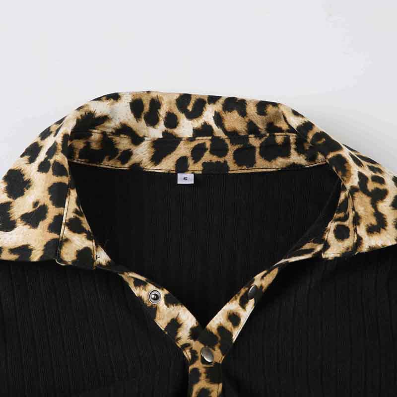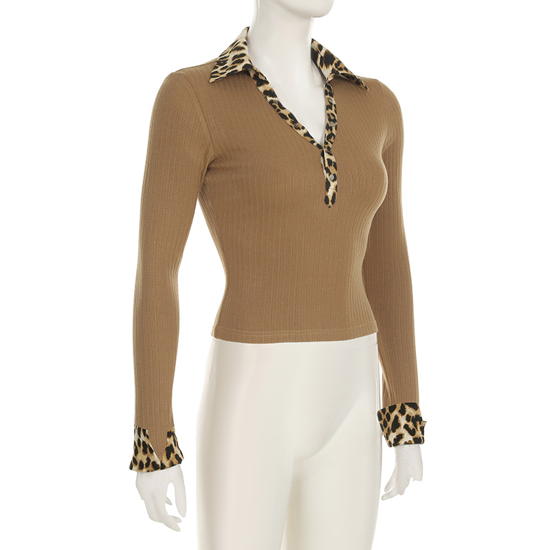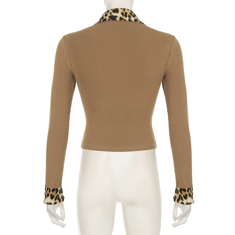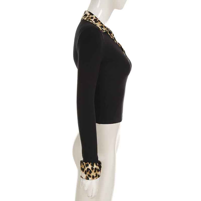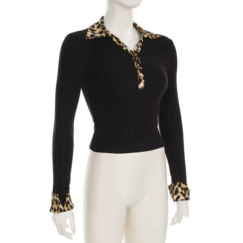 BKQU Leopard Patchwork V Neck Knitted Top Women Autumn Winter Long Sleeve Buttons Slim Crop T-shirt Aesthetic Y2k Streetwear