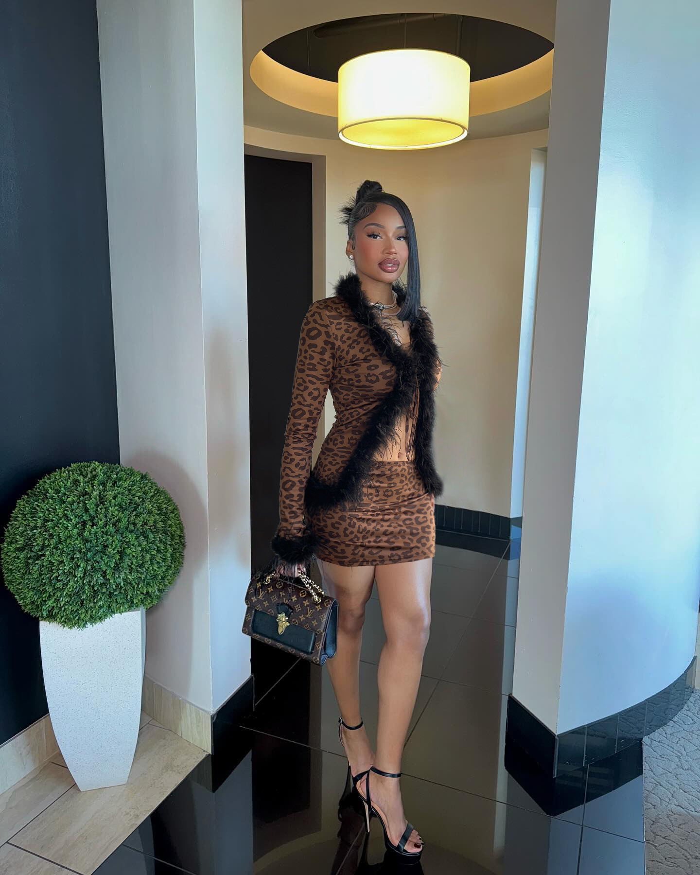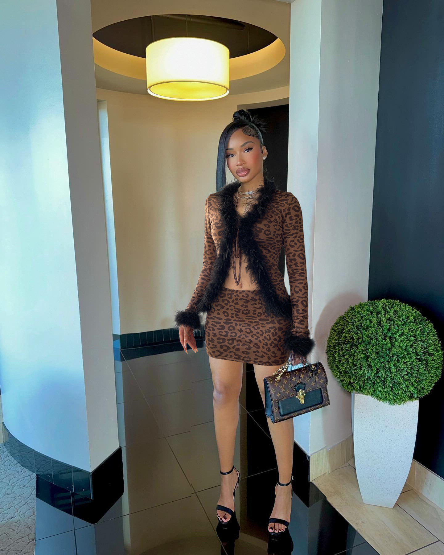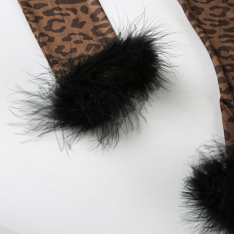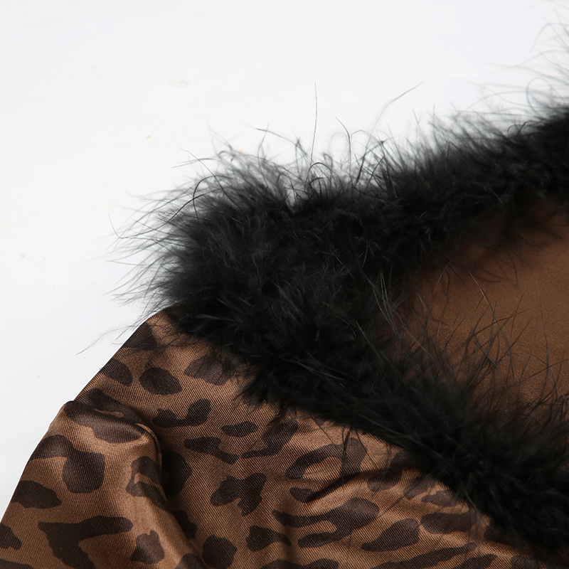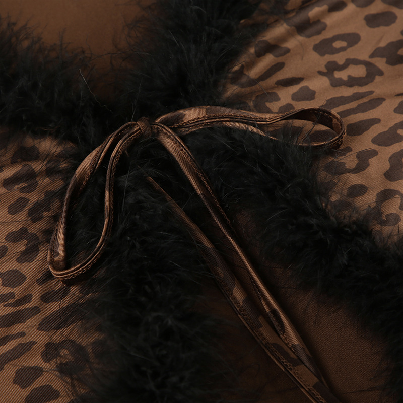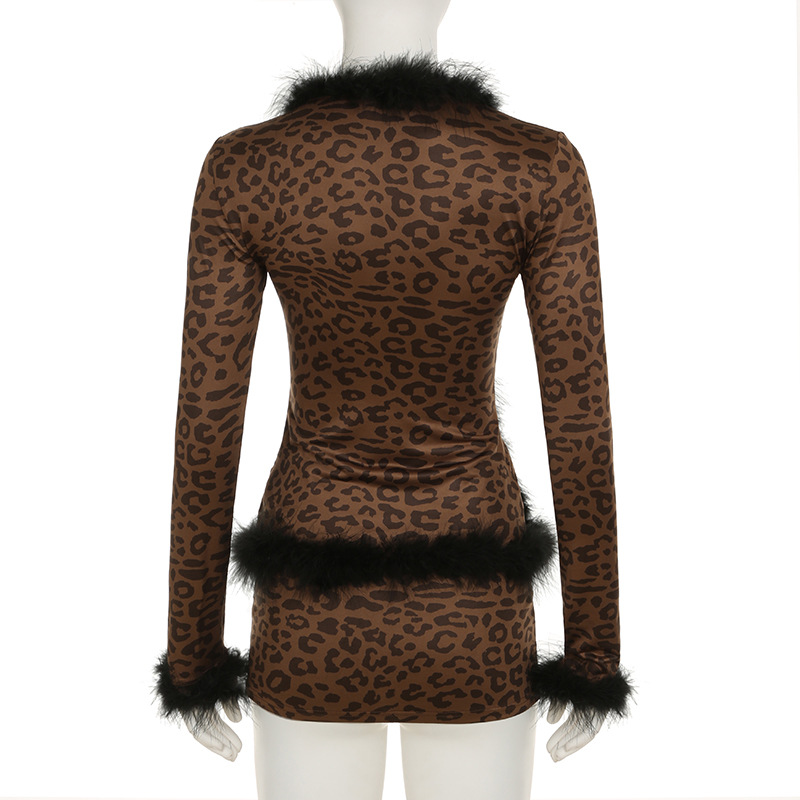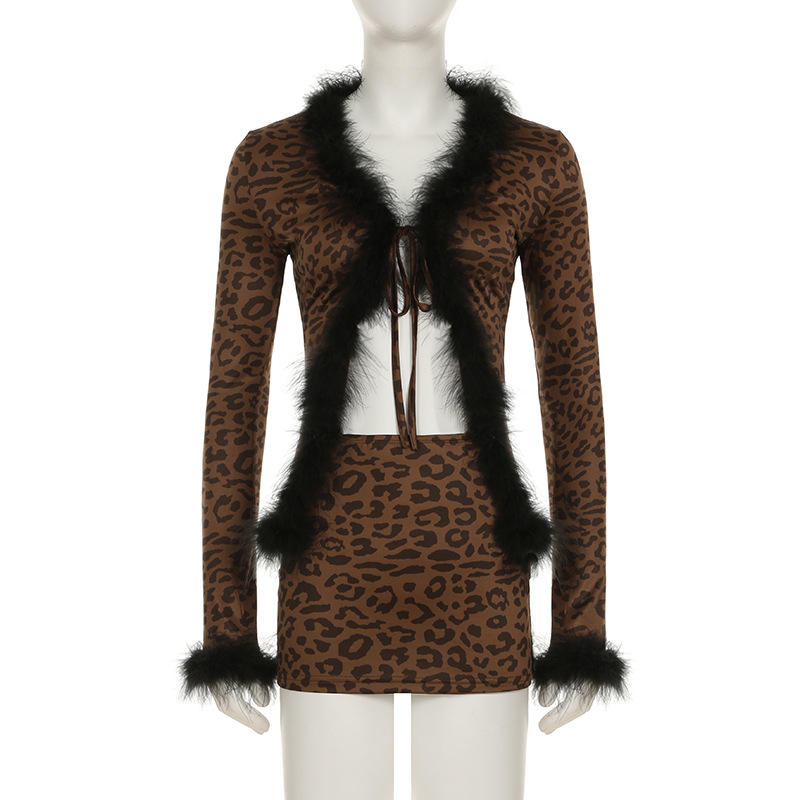 BKQU Leopard Print Sexy Lace Up Cardigan Mini Skirts 2 Piece Set Women Feather Patchwork Tops Bodycon Skirts y2k Party Clubwear