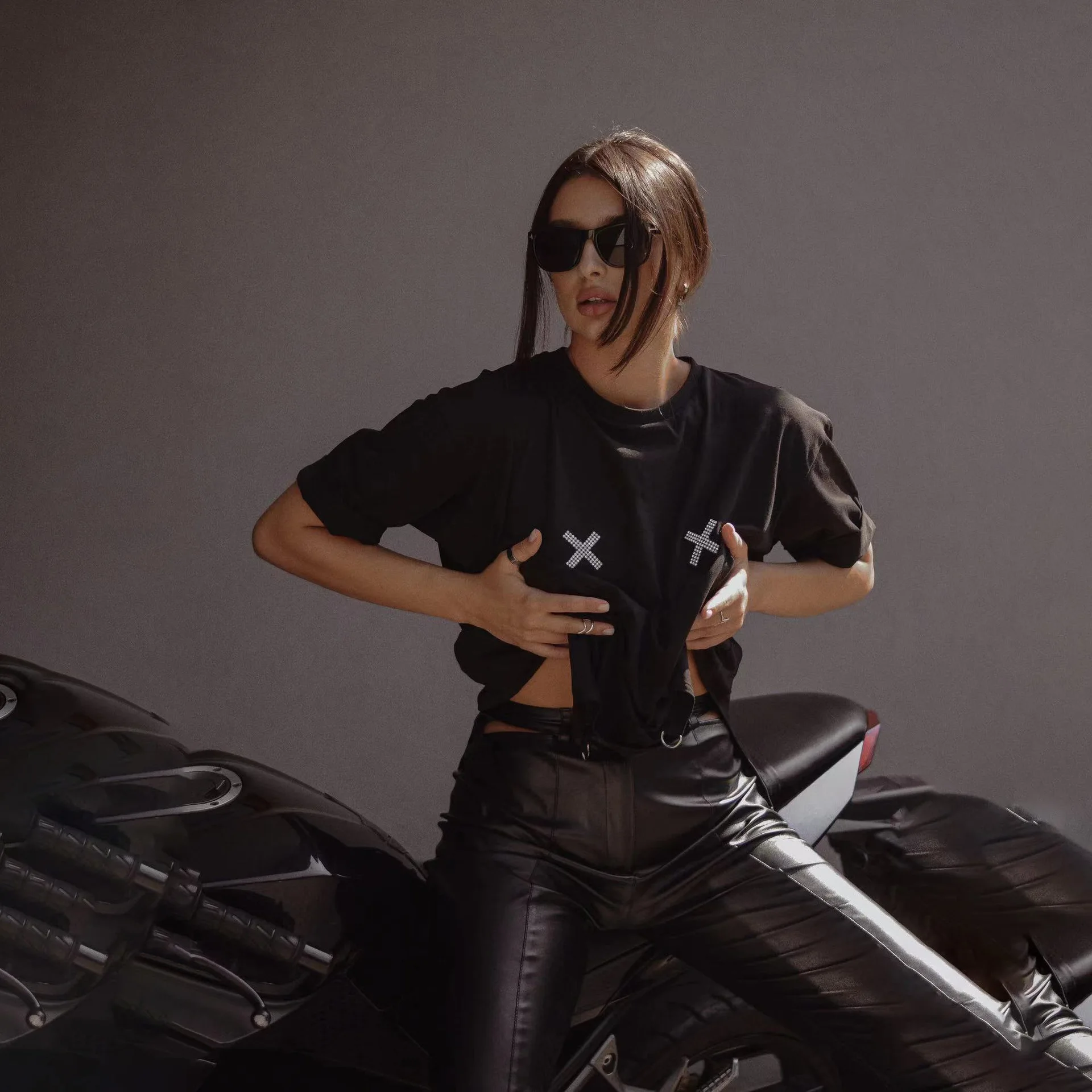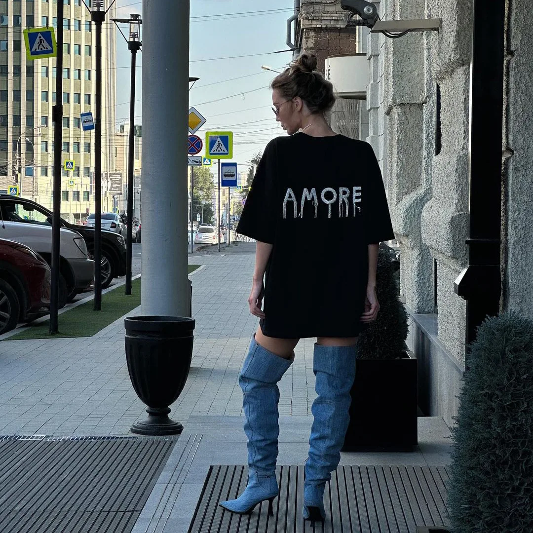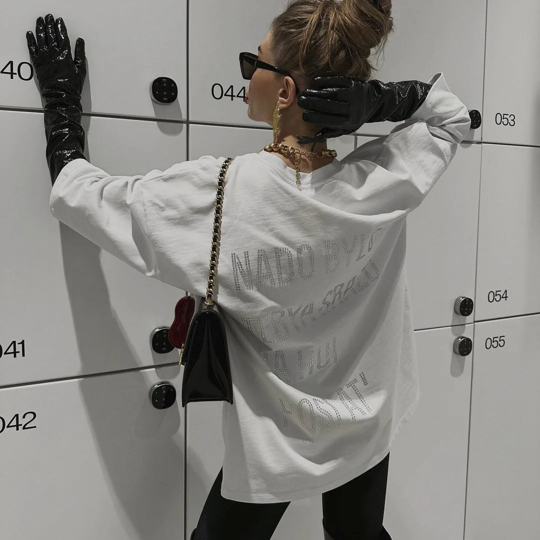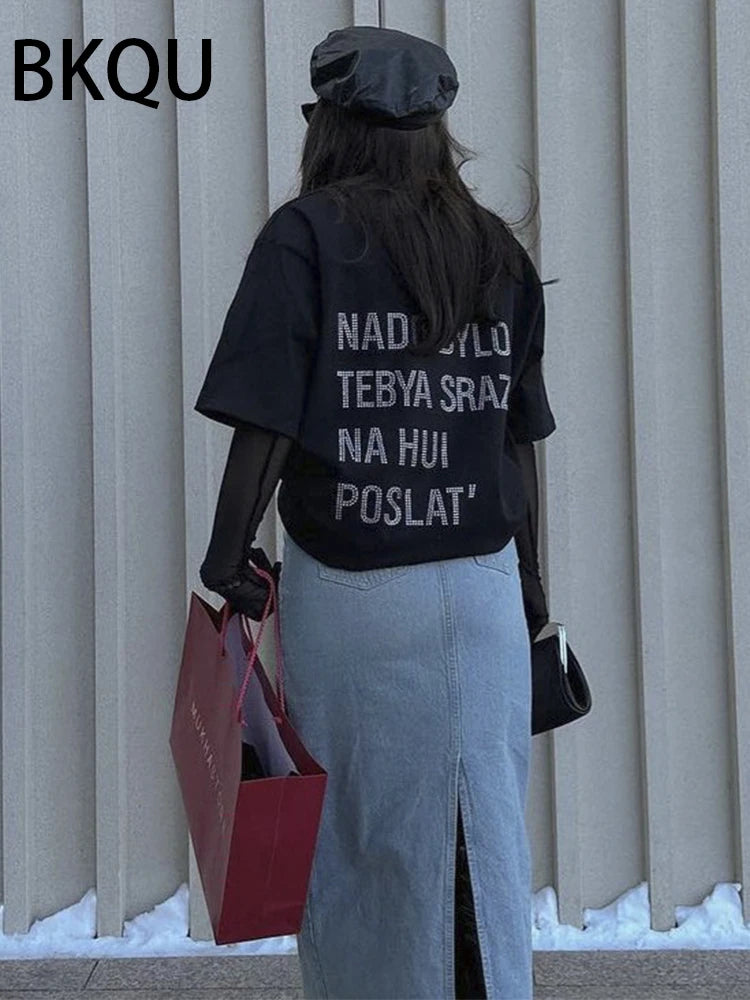BKQU Letter Rhinestone Loose T shirts For Women 2024 Fashion Short Sleeve O-neck Hot Diamonds Female Tees Pullovers Streetwear