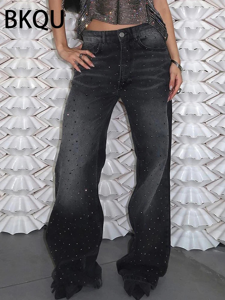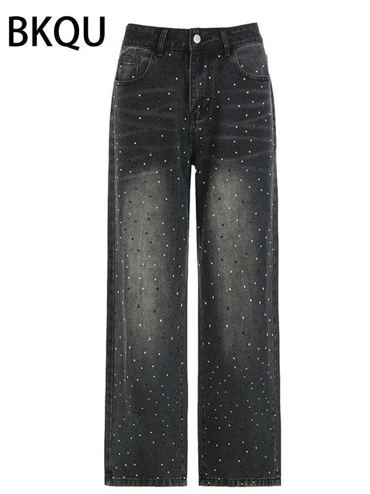 BKQU Low Waist Wide Leg Women's Jeans 2024 American Black Rhinestone Baggy Denim Long Pants Female Oversized BF Style Trousers
