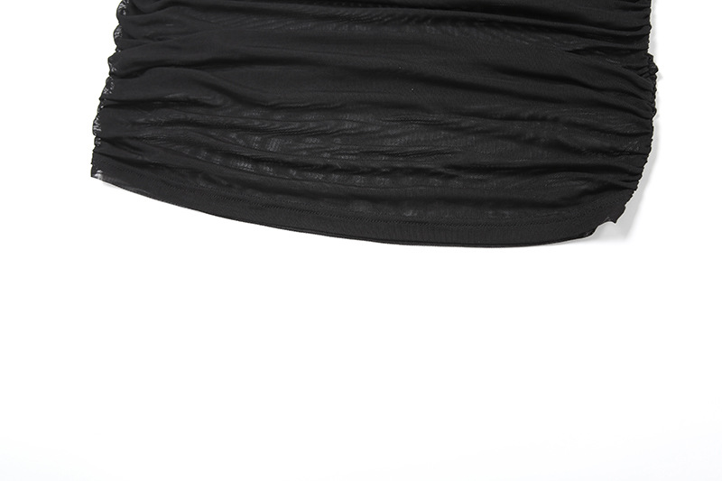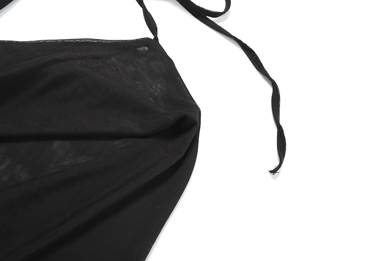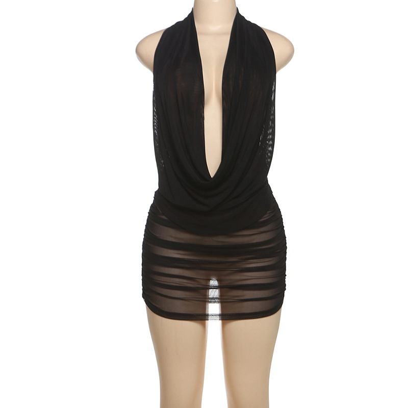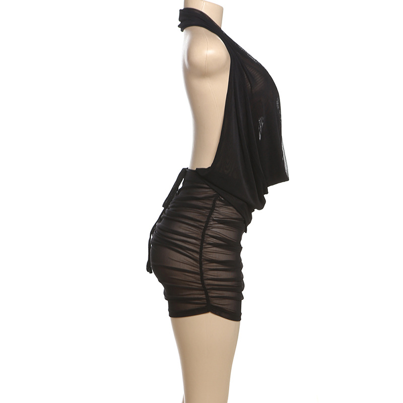 BKQU Mesh Sexy Ruched Women 2 Piece Set Deep V-Neck Halter Swinging Backless Top See Through Mini Skirt Y2k Midnight Club Outfit