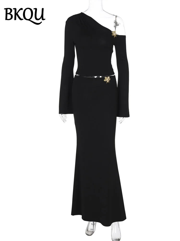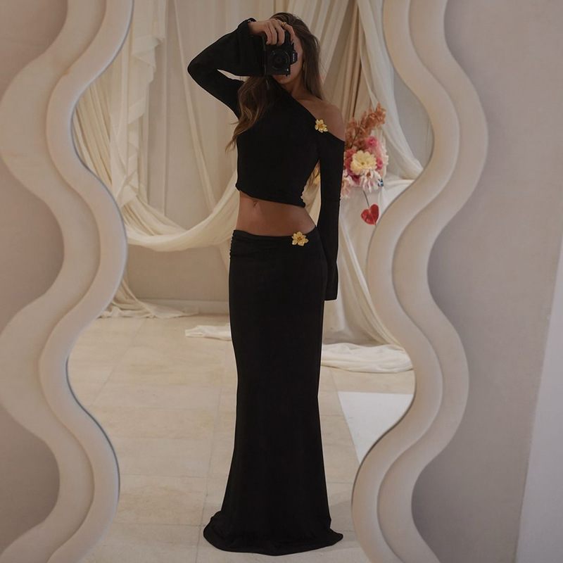 BKQU Metallic Flower Skirt Two Piece Sets Women Sexy Off Shoulder Full Sleeve Crop Top+Ruched Long Skirt Matching Party Outfits