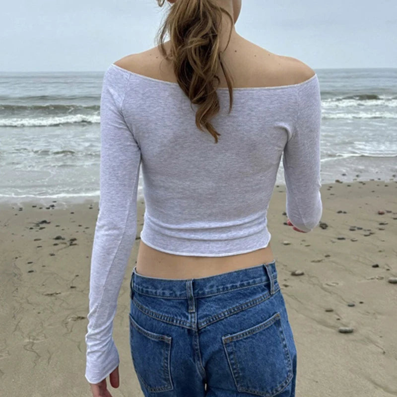 BKQU Off Shoulder Crop Tops Women Sexy Slash Neck Long Sleeve Slim T-shirt Casual Basic Y2k Clothing Autumn Black White Tees