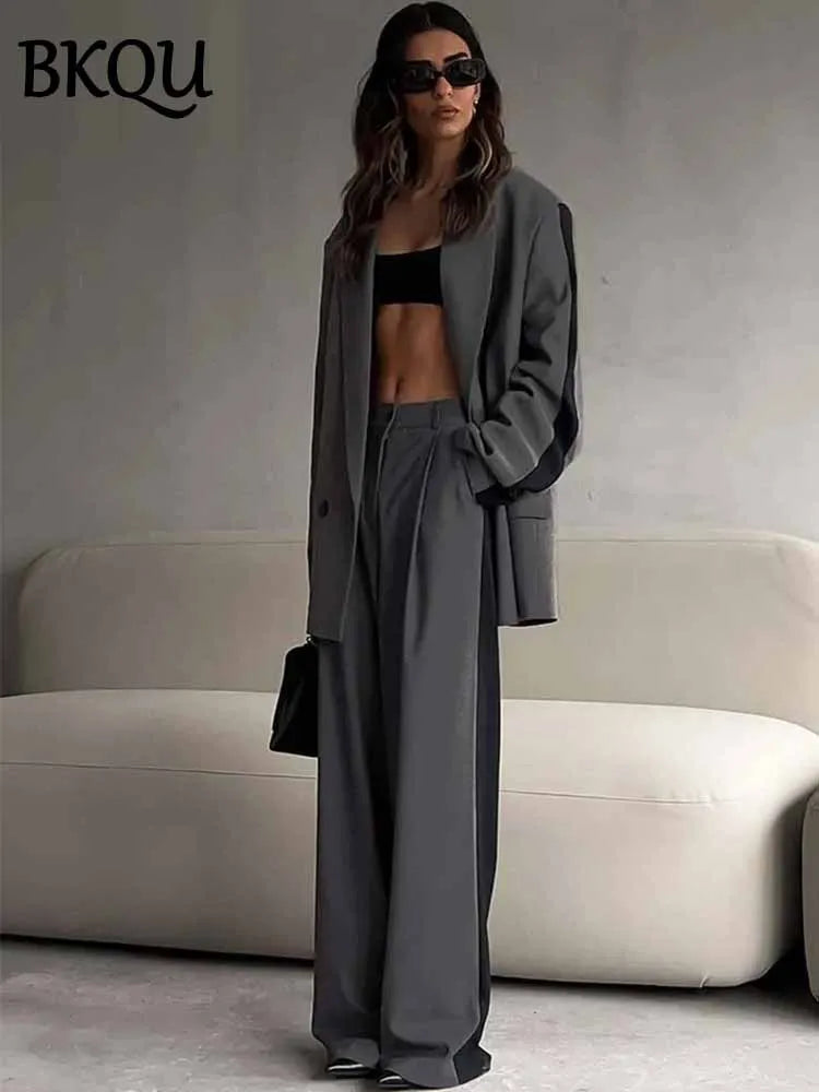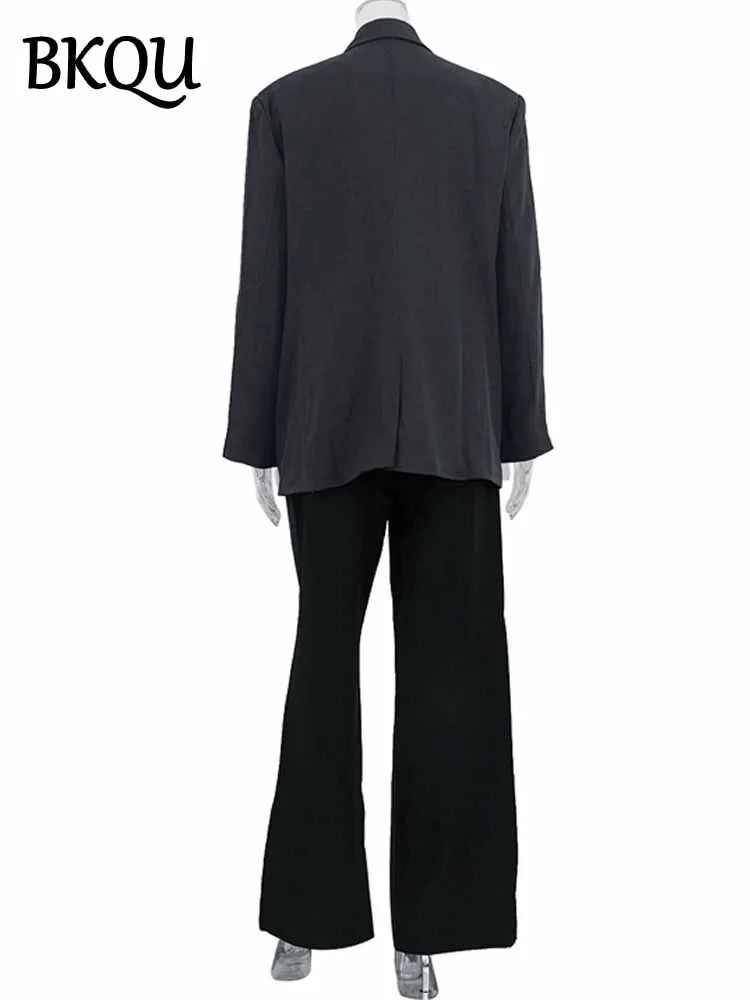 BKQU Patchwork Blazer 2 Piece Sets Women Fashion Long Sleeve Button Jacket High Waist Pocket Wide Leg Pants Office Lady Suits